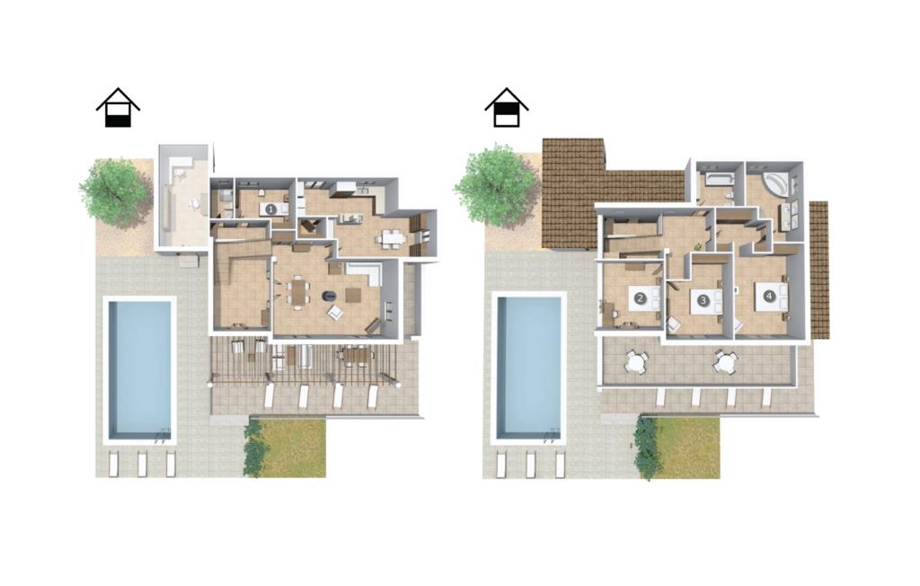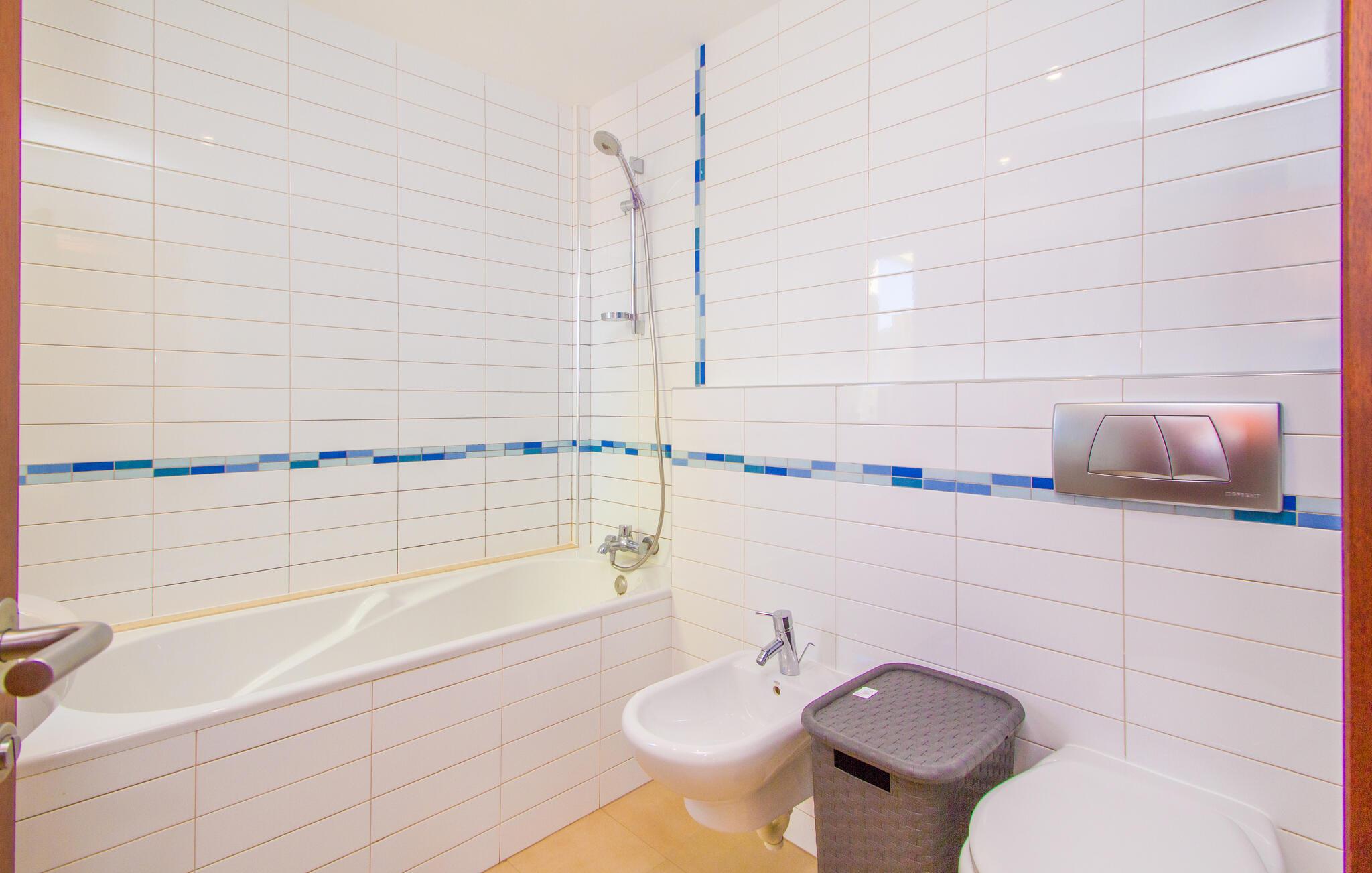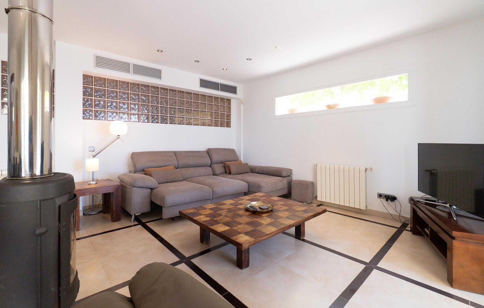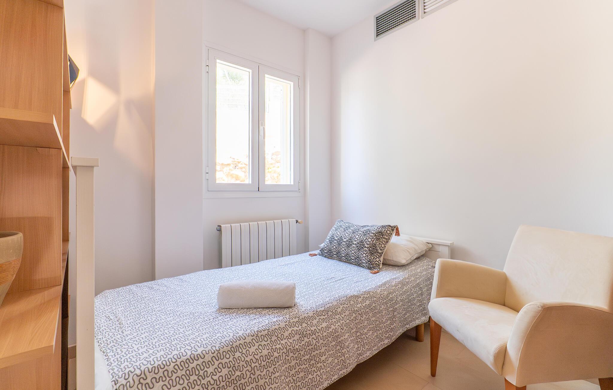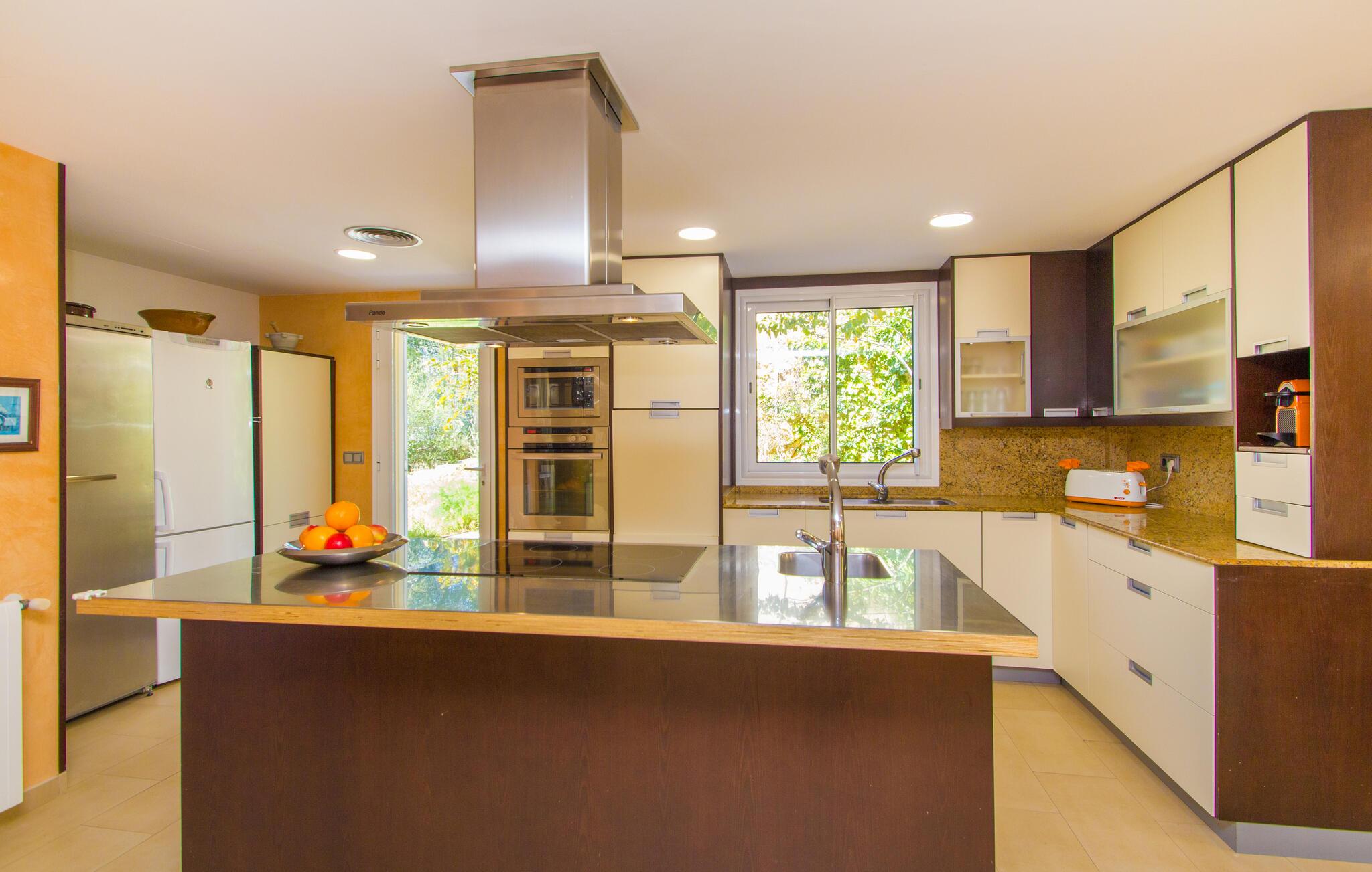 Når først jeres krop er helt nedsænket i den forfriskende pool på terrassen, I har svømmet et par omgange og nydt udsigten over bugten fra de skyggefulde træer, kan I ånde undren over dette smukke ørneblik. Om I vil nyde panoramaudsigten over bådene på vej mod den nærliggende lystbådehavn eller trække jer tilbage til træstolene for en lille lur, er helt op til jer. De bølgeformede liggestole i træ er formet til at efterligne havets bølger. Alt efter årstiden er den overdækkede terrasse omgivet af grønne klatreplanter, som sammen med den lille plet græsplæne og mange andre planter ved siden af huset skaber en meget naturlig atmosfære. Dette er det perfekte sted at starte eftermiddagen i godt selskab og lægge planer for udflugter i området. Den store altan ovenpå er et andet godt sted at nyde solen og den friske luft fuldt ud. Midtpunktet inde i bygningen er en stor stue og spisestue. Sofaområdet er adskilt fra resten af en træhylde i antik stil, hvor I kan krølle jer sammen og se tv på den store fladskærm for at se, hvad der sker derhjemme. Spisebordet lavet af massivt træ giver plads nok til alle gæster. Det er et sted, hvor alle kan mødes, når det bliver lidt koldere på terrassen om natten. Et særligt højdepunkt er køkkenet. Takket være det enorme køleskab og fryser behøver I ikke begrænse jer, når I handler på et af øens landmandsmarkeder. Køkkenøen midt i køkkenet gør villaen ideel til fælles madlavningsarrangementer, da mange kokke kan gøre deres del i madlavningsprocessen på samme tid. Hvis morgenerne er lidt mere hektiske, og I gerne vil have morgenmad direkte i køkkenet, kan I gøre det ved et andet bord. Soveværelset i stueetagen har en dobbeltseng. Et badeværelse er på samme etage. Ovenpå er der yderligere tre soveværelser: et med en enkeltseng, et med dobbeltseng og eget badeværelse og et tredje med to enkeltsenge og børnevenligt tapet. Et særligt højdepunkt: To af de tre badeværelser har et badekar, hvor I kan afslutte dagen med et afslappende boblebad. Som navnet antyder, ligger villaen "Portals Nous Hills" i "Portals Nous"-forstaden Palma - det ideelle udgangspunkt for forskellige dagsture. Alene i øens hovedstad er der nok af seværdigheder til at holde jer beskæftiget i flere dage. Efter et besøg i den imponerende katedral, en spadseretur i havnen og en omfattende shoppingtur, er det meget muligt, at I foretrækker blot at slappe af på stranden resten af dagen. Og I behøver ikke engang en bil, for villaen ligger kun 850 m fra havet. Hvis I beslutter jer for at udforske Tramuntana-bjergene og besøge de maleriske byer Valemossa eller Déjà, vil I støde på flere imponerende monumenter, som I vil huske i lang tid. Kun 850 m fra havet kombinerer villaen "Portals Nous Hills" alle fordelene ved en kystnær beliggenhed med gode transportforbindelser, så I hurtigt kan nå byens lystbådehavn og slentre langs den varierede "Marina Portals"-promenaden med dens butikker og restauranter På ingen tid overhovedet kan I komme til øens hovedstad Palma, hvor adskillige kulturelle og fritidsaktiviteter venter på jer. I har også valget mellem flere sandstrande.