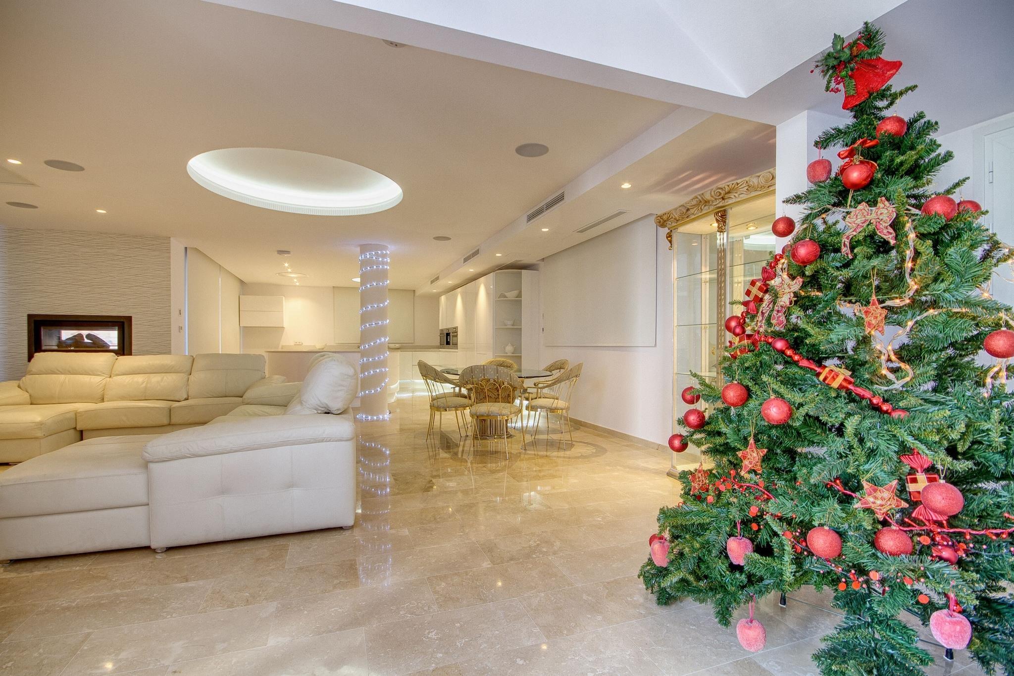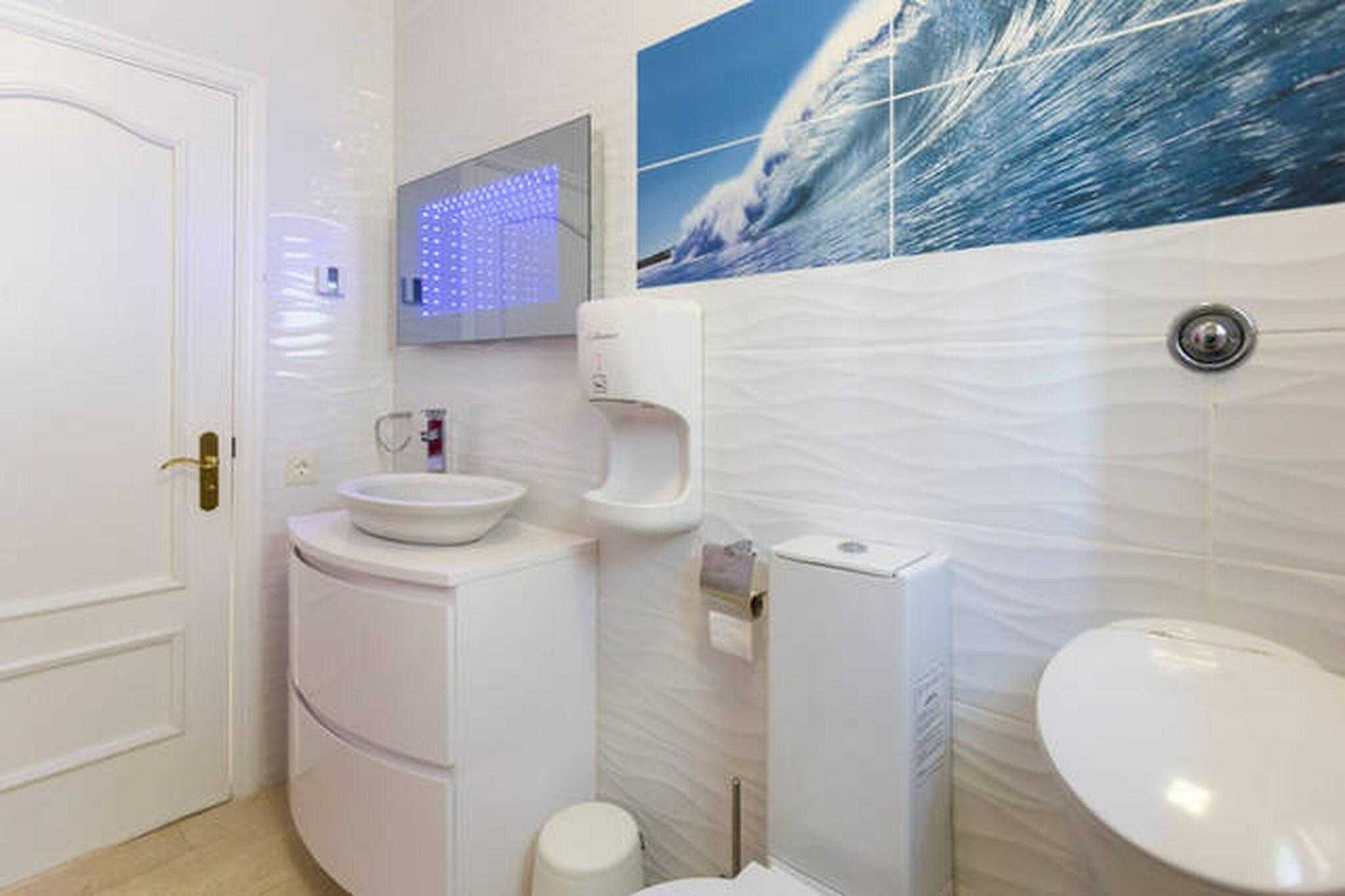 Stueetage: (Indgang , Stue(Fjernsyn(fladskærm, digital, Smart-TV, Tyske TV-kanaler, Internationale TV-kanaler), spisebord, pejs, sofahjørne, klimaanlæg), spisestue(balkon eller terrasse), åbent køkken(kogeplade(glaskeramisk), elkedel, brødrister, komfur, kaffemaskine, ovn, mikrobølgeovn, opvaskemaskine , køle-fryseskab, Blender), soveværelse(king size-seng, Fjernsyn, klimaanlæg), soveværelse(king size-seng, Fjernsyn, balkon, klimaanlæg), badeværelse(badekar med bruser, håndvask, toilet, føntørrer), badeværelse(bruser, håndvask, toilet), fitnessrum, loungerum, sauna, Bubble bath) På 1. etage: (soveværelse(king size-seng, Fjernsyn, balkon, klimaanlæg), soveværelse(dobbeltseng, Fjernsyn, klimaanlæg), soveværelse(enkeltseng, enkeltseng, Fjernsyn), badeværelse(bruser, håndvask, toilet)) legeværelse, bar, tremmeseng, bruser, toilet, vaskemaskine, balkon eller terrasse, terrasse, have(indhegnet), havemøbler, solstole, grill(gas, trækul), parkering, swimmingpool(privat), legeredskaber, fitnessapparater, barnestol, strygebræt, strygejern, loungemøbler, legetøj, Pladegrill