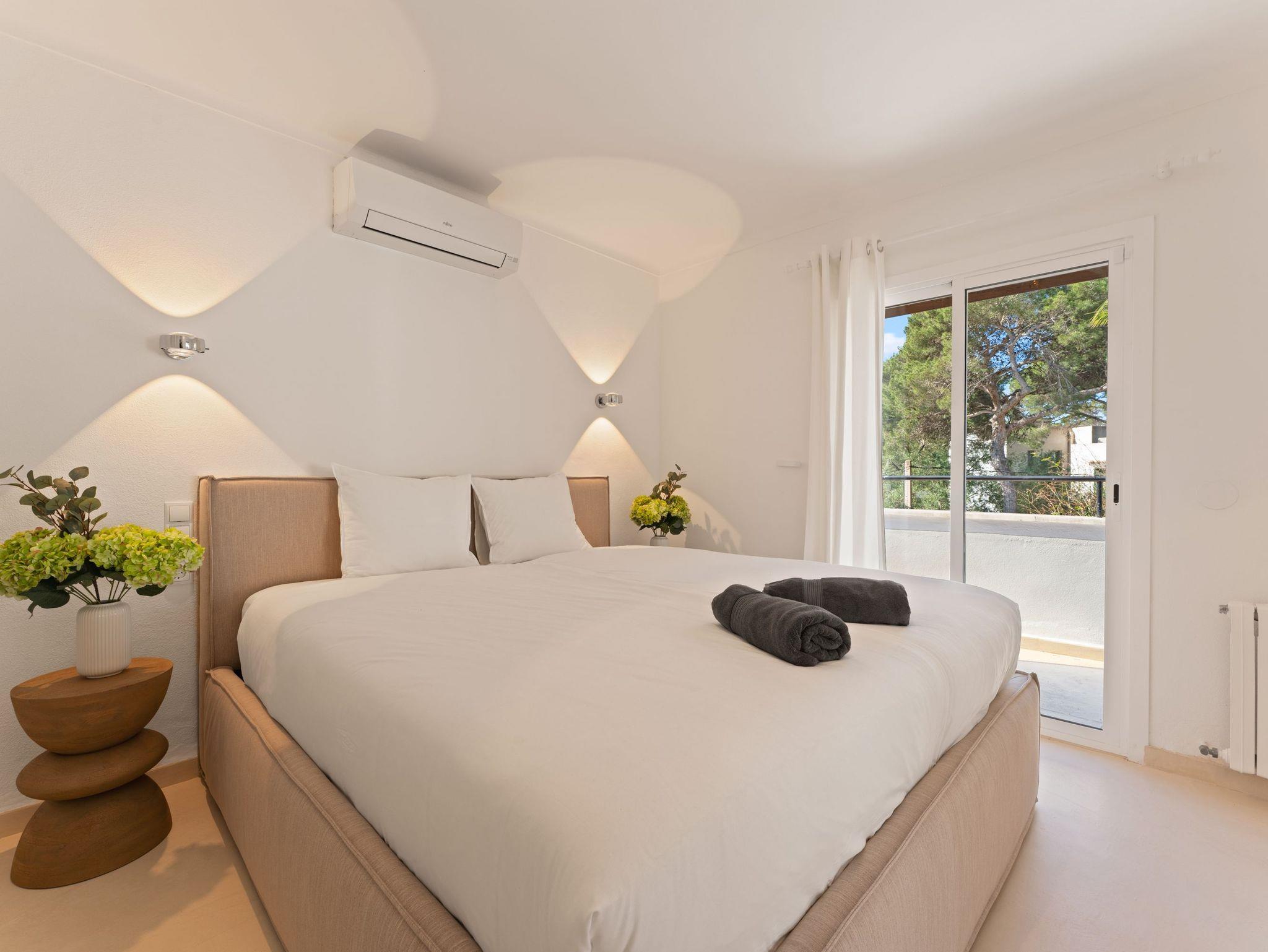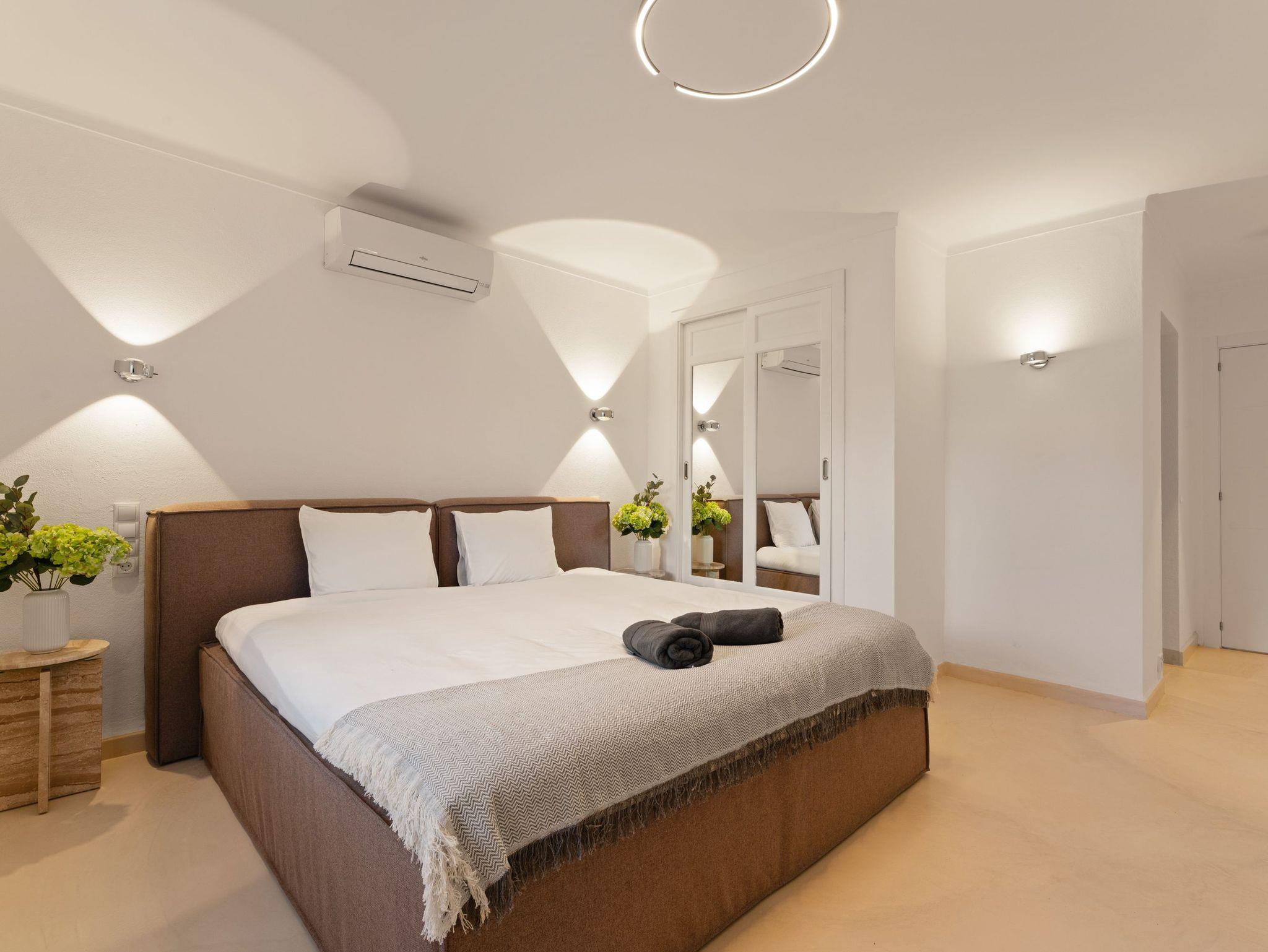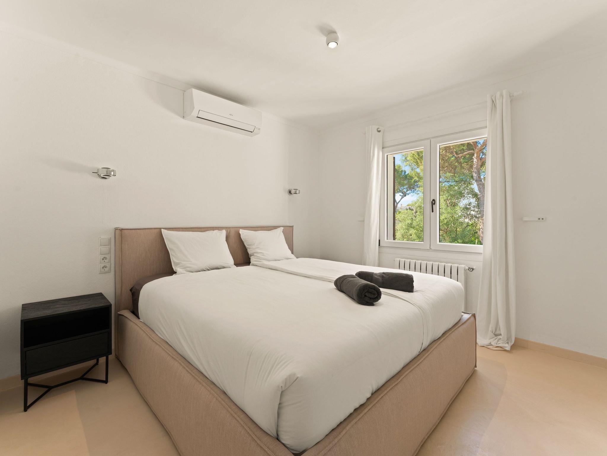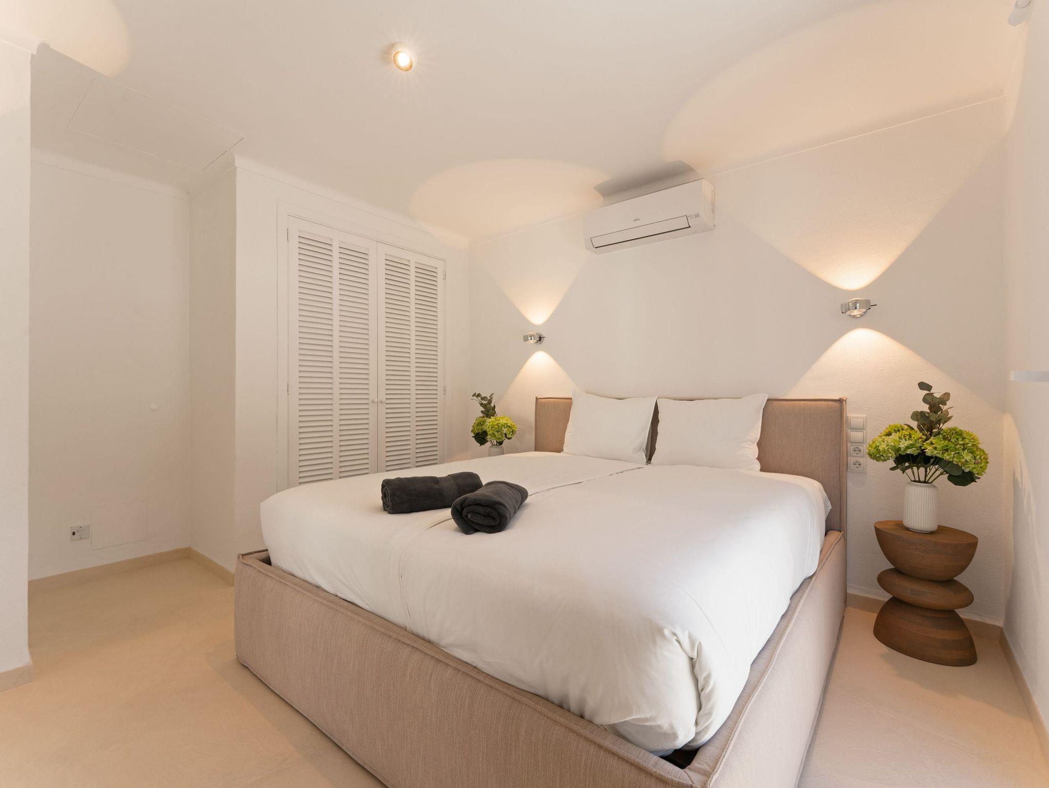 Sie verfügt über vier großzügige Schlafzimmer, liebevoll eingerichtet mit hochwertigen Boxspring- und Polsterbetten aus natürlichen Materialien, Einbauschränken sowie Klimaanlage in allen Zimmern. Zusätzlich ist eine Osmoseanlage für beste Wasserqualität installiert.