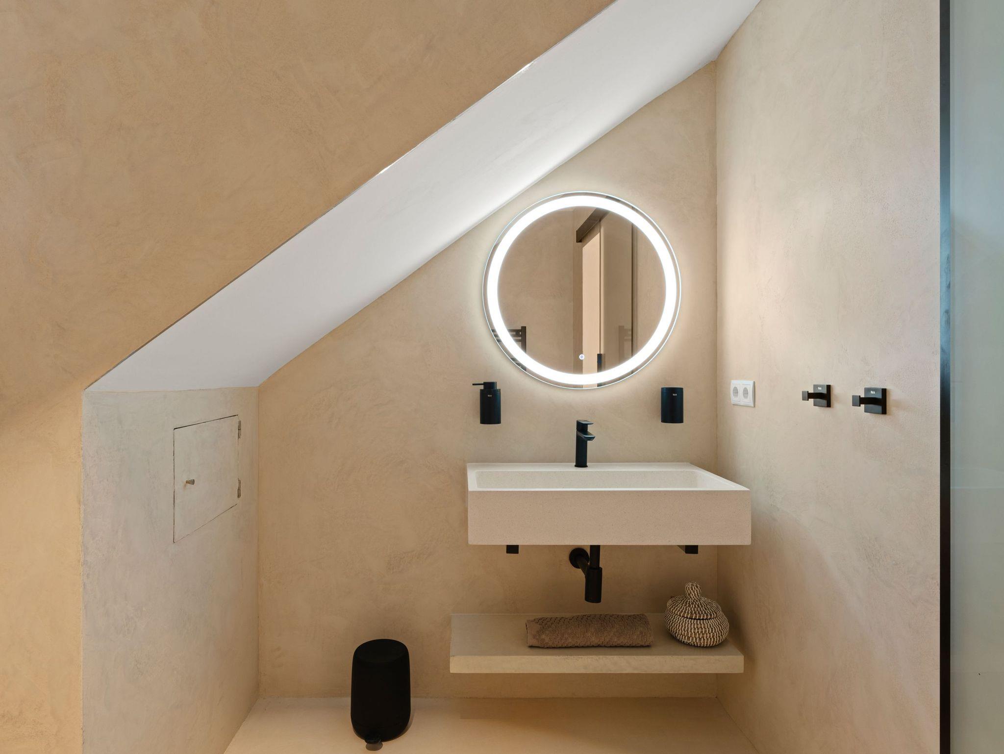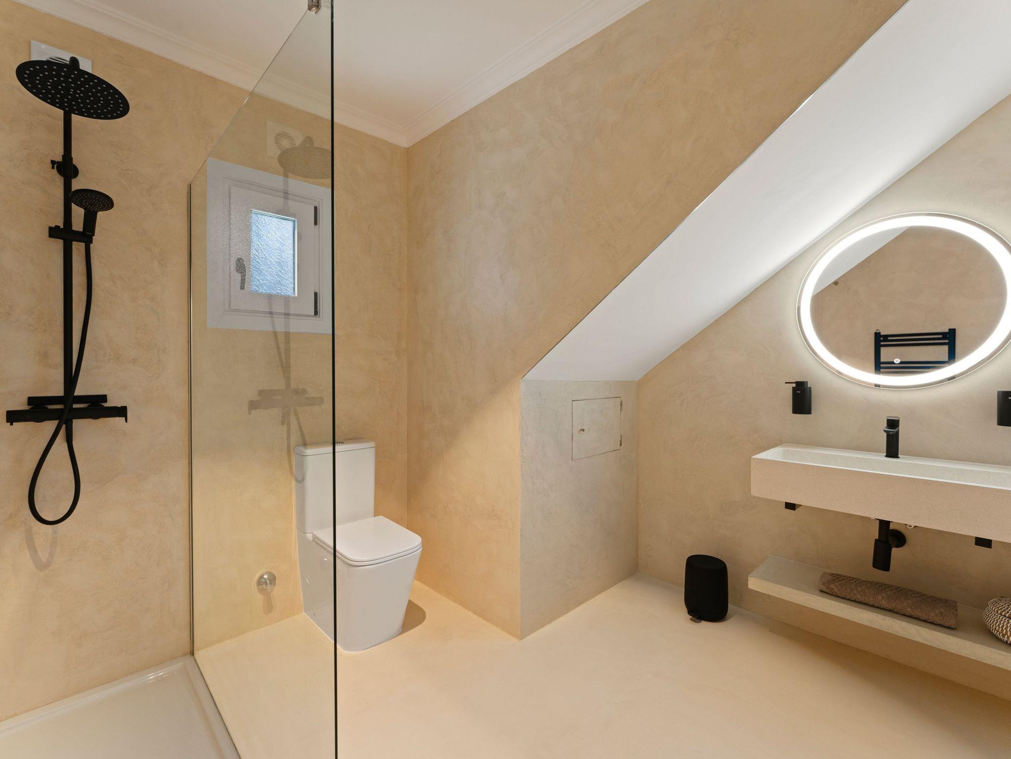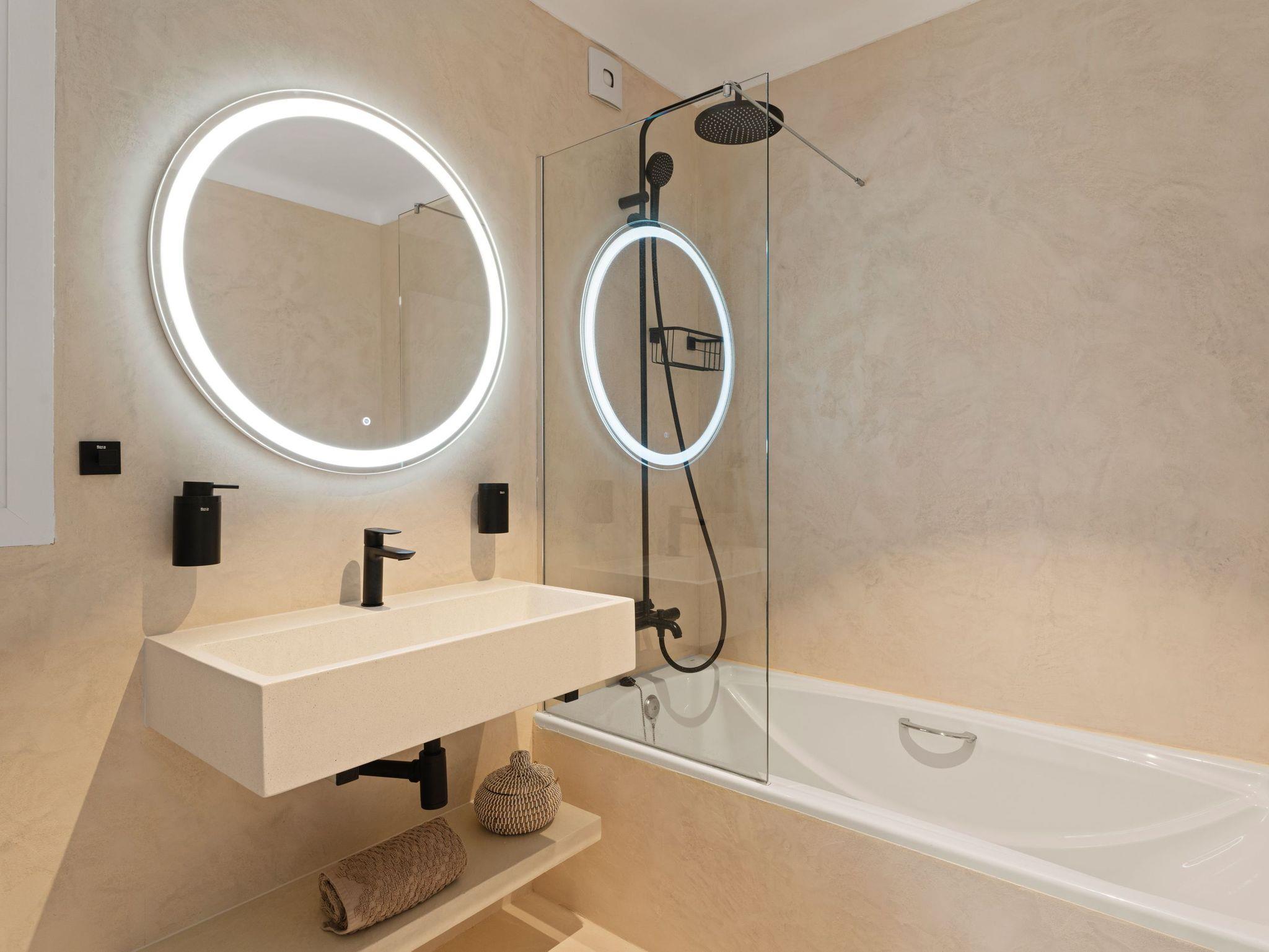 Es stehen drei voll ausgestattete Badezimmer zur Verfügung, eines davon en suite am Hauptschlafzimmer. Alle Bäder bieten hochwertige Armaturen, LED-Spiegel, Föhn, Regenduschen und handgefertigte mallorquinische Terrazzo-Waschbecken.