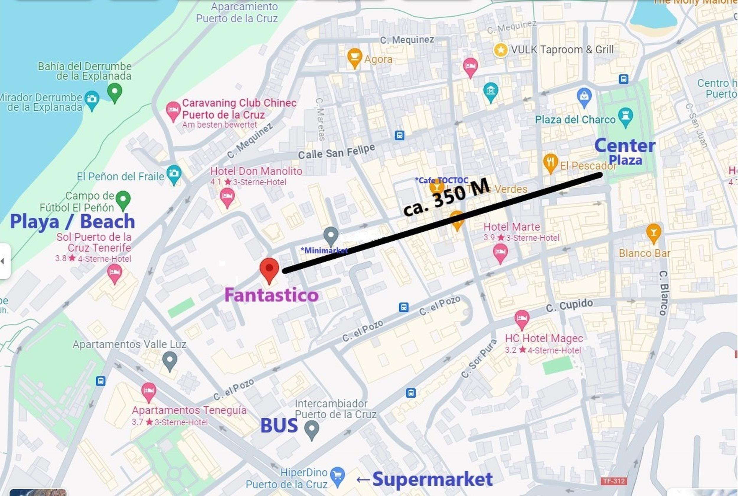 Das Ferienapartment Fantastico 3 liegt im Zentrum von Puerto de la Cruz. 300 Meter zum Meer und 300 Meter zum Zentrum Plaza del Charco in Puerto de la Cruz. Alles was sie brauchen ist in unmittelbarer Nähe, wie Supermarkt, Apotheke, Restaurants, Busstation etc.