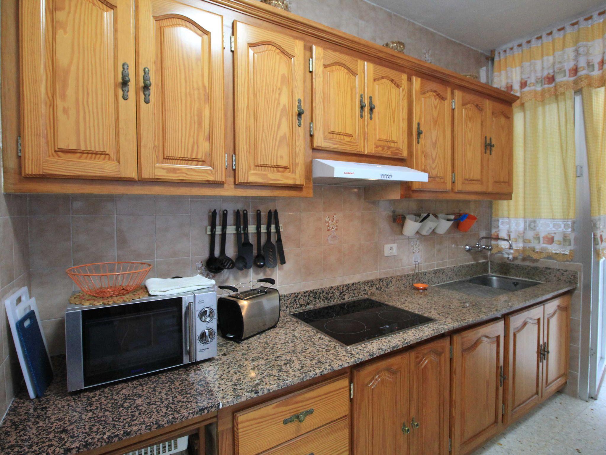• Küchenzeile mit Dunstabzug, Mikrowelle, Kaffeemaschine, Cafetera, Toaster, Mixer, Kühl-/Gefrierkombination