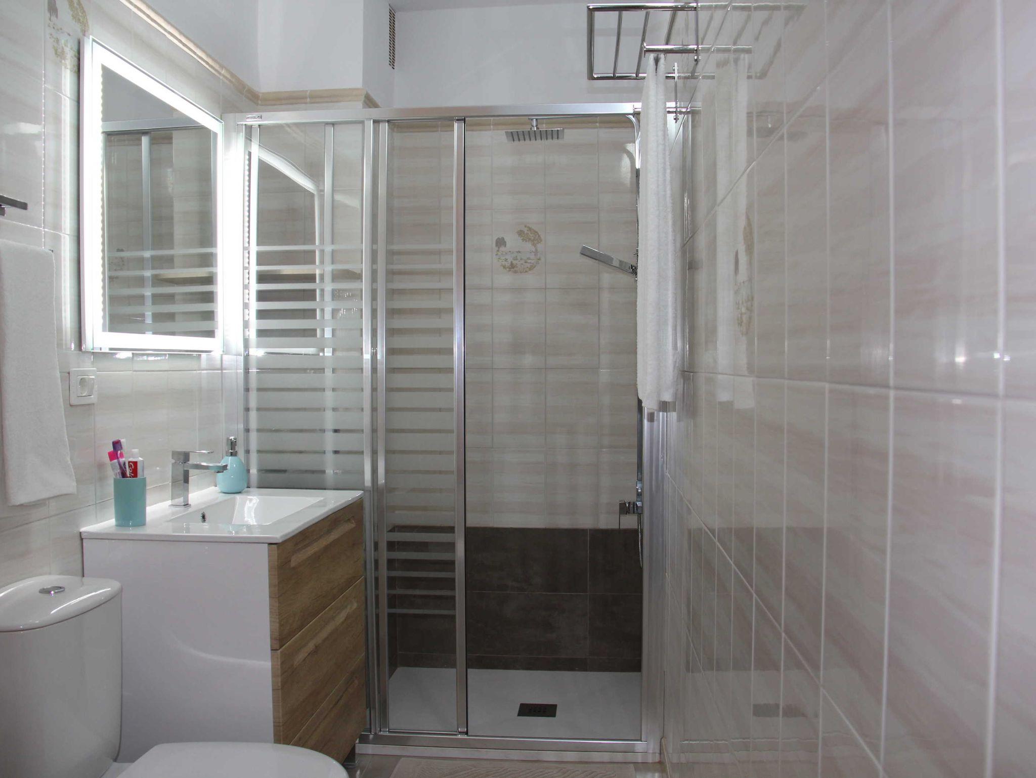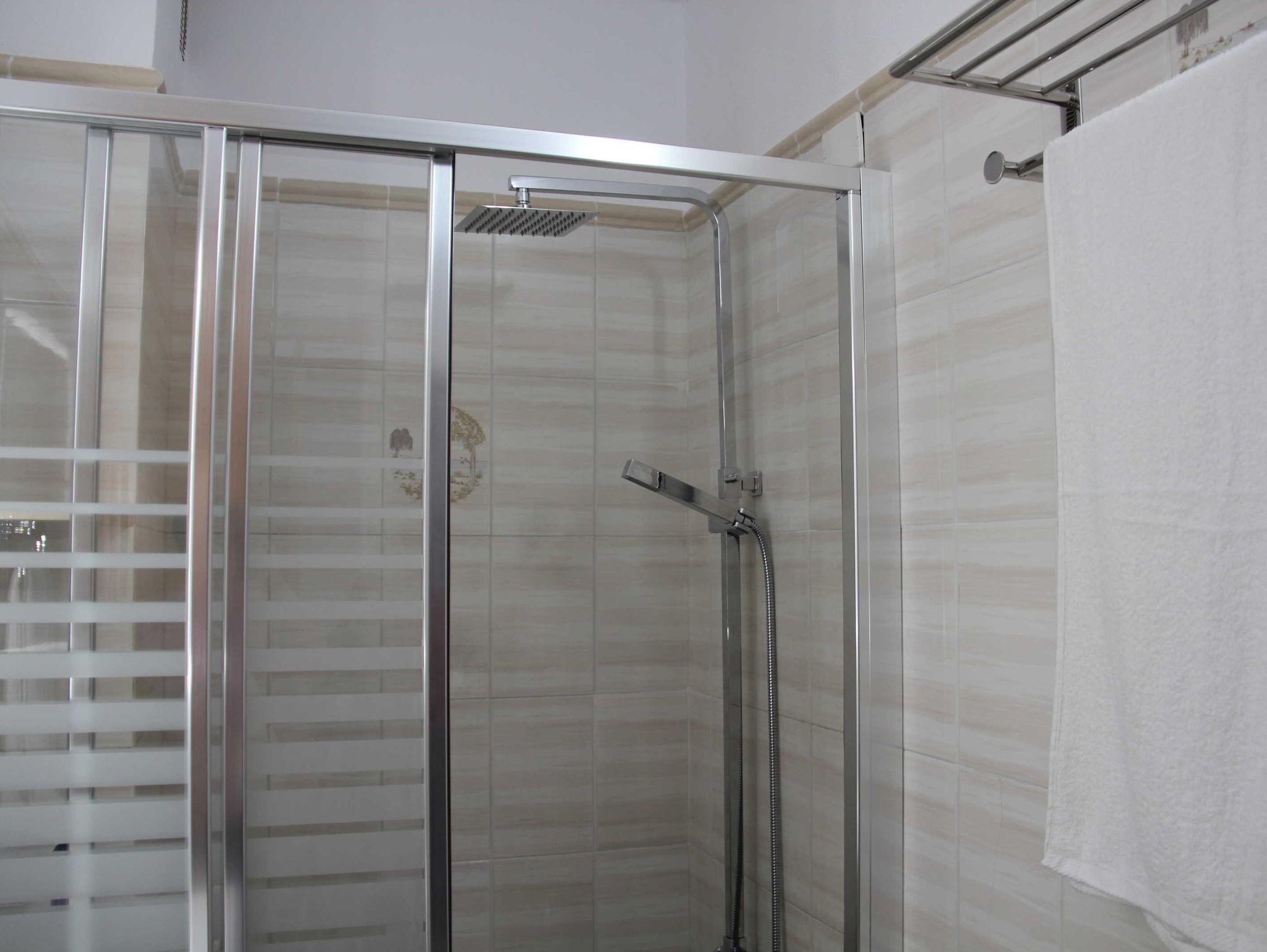 • Bad mit neuer Dusche, Waschtisch, Spiegel, Toilette, Fön