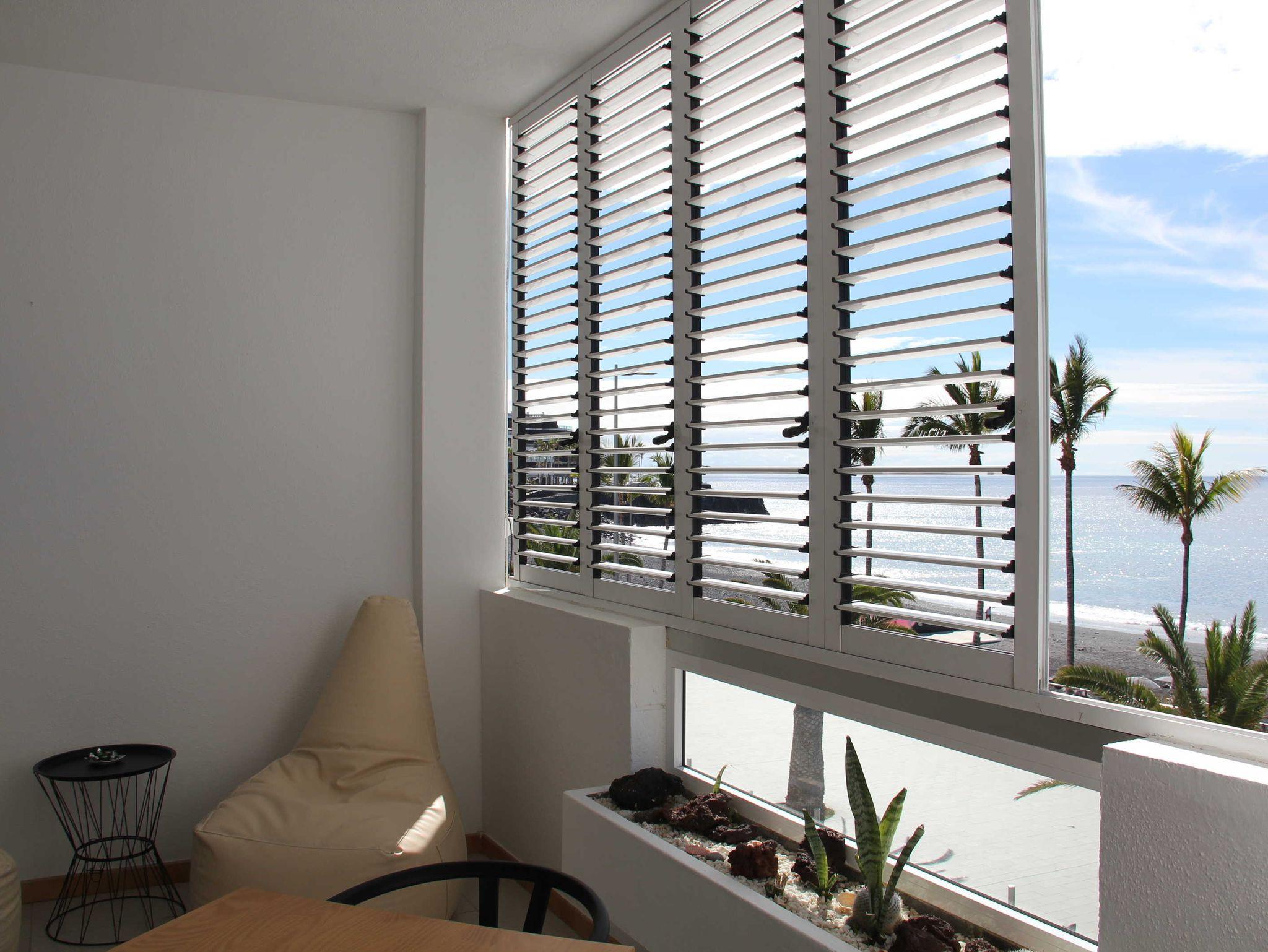 • Balkon mit Lamellenschiebetüren, um den Sonneneinfall zu regulieren oder Wind abzuhalten