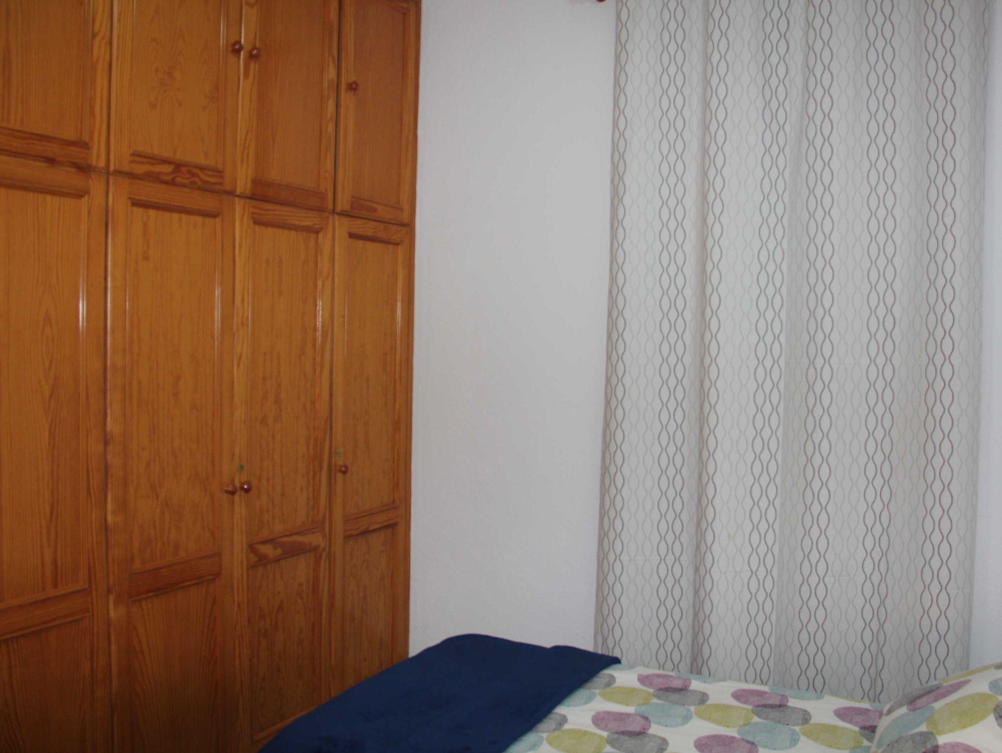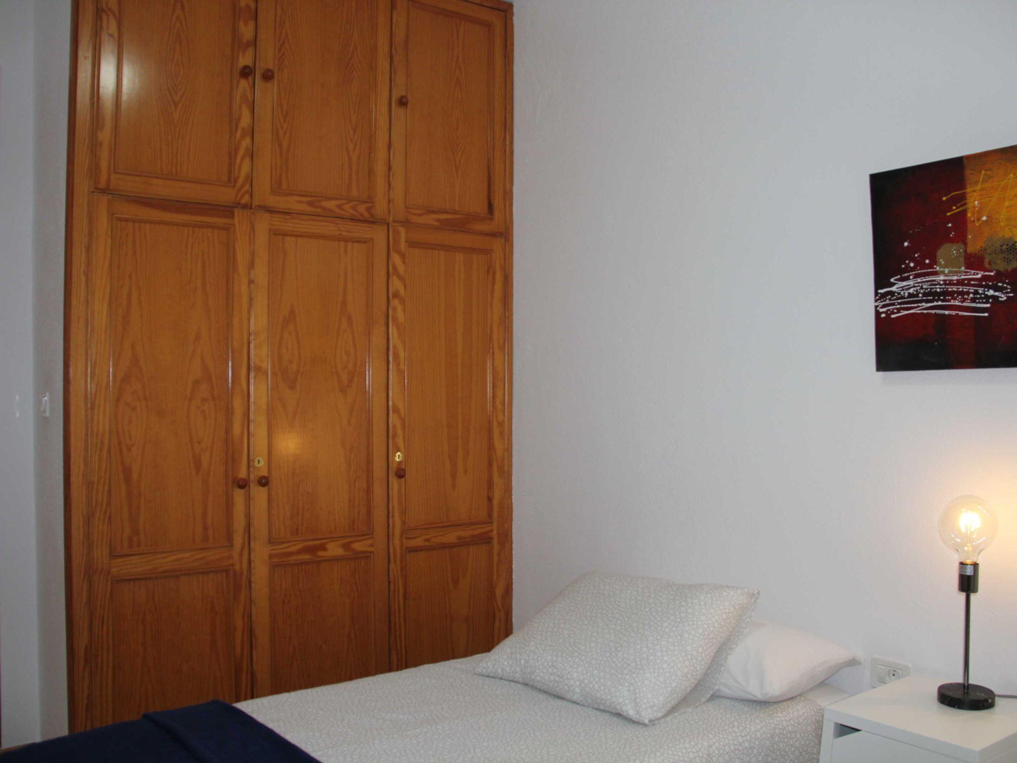 Am Ende des Flurs liegt das zweite Schlafzimmer, ebenfalls mit 2 Einzelbetten, großem Einbaukleiderschrank sowie Nachttisch nebst Lampe. Auch hier geht das Fenster in den Patio und es verfügt, ebenso wie das andere über einen Verdunkelungsvorhang samt schöner Gardine oben drüber.