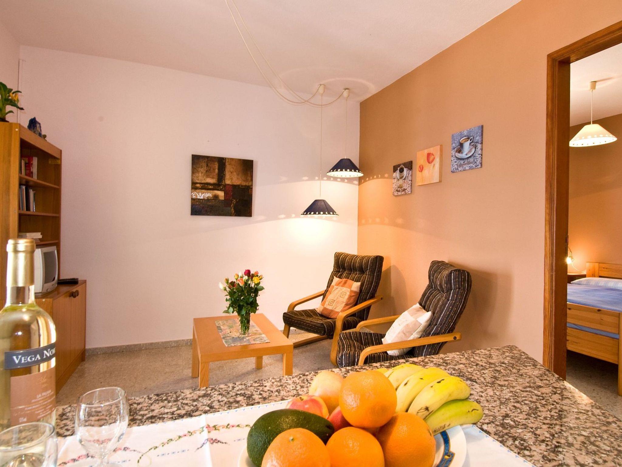 Der Wohnraum, den Sie über die Terrasse betreten, ist mit 2 Sesseln , einem kleinen Fernseher mit Sat-TV sowie Büchern und Spielen ausgestattet.
