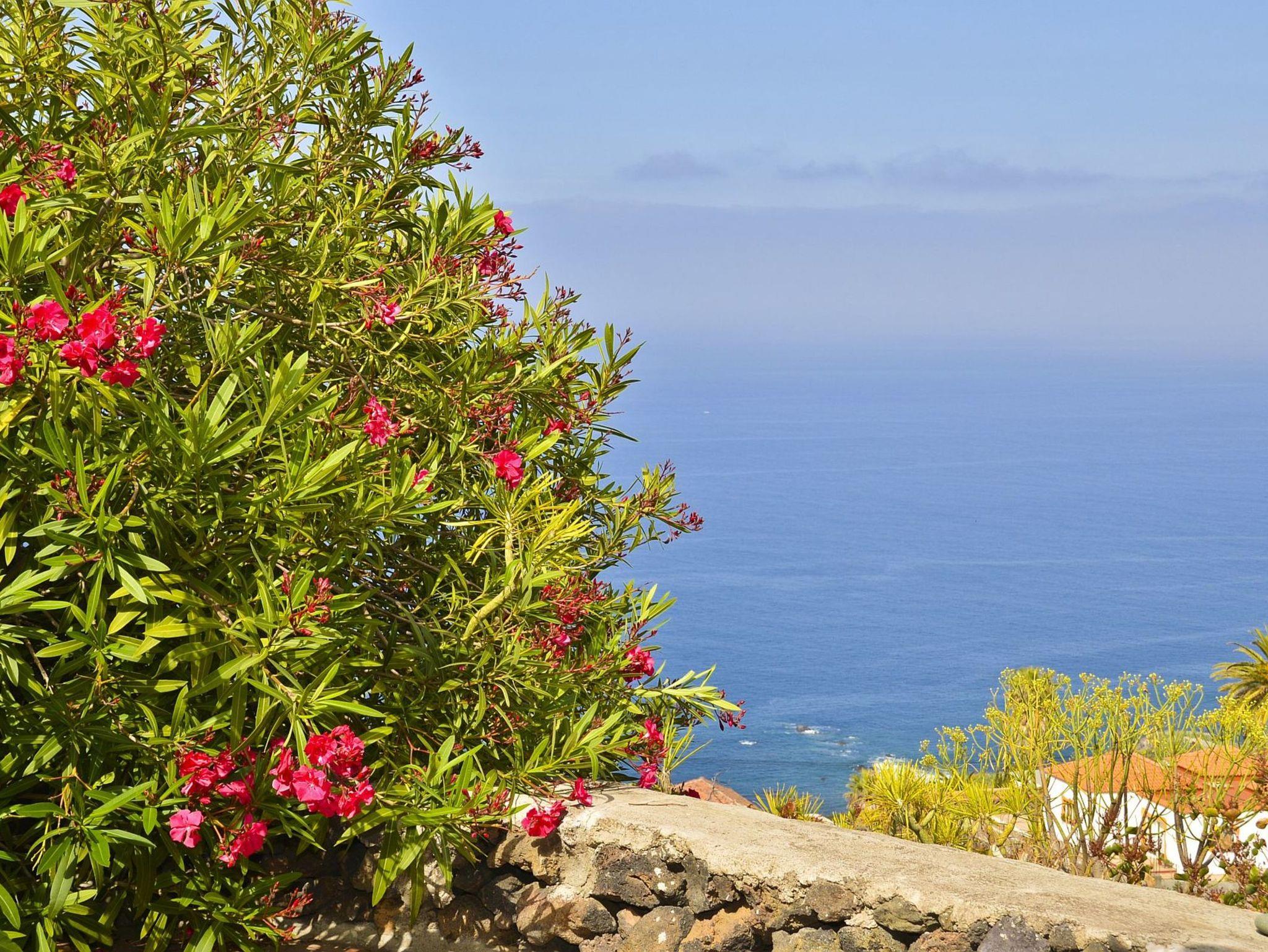 Palmen und Sträucher wie weiß- und rosé blühender Rhododendron und buntblättrige Bougainvillea säumen nicht nur den Weg von der Einfahrt zum Haus, sondern auch die Seiten der Terrassen.