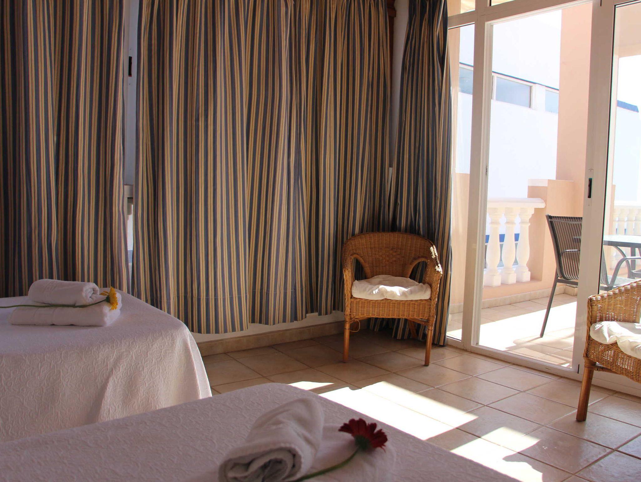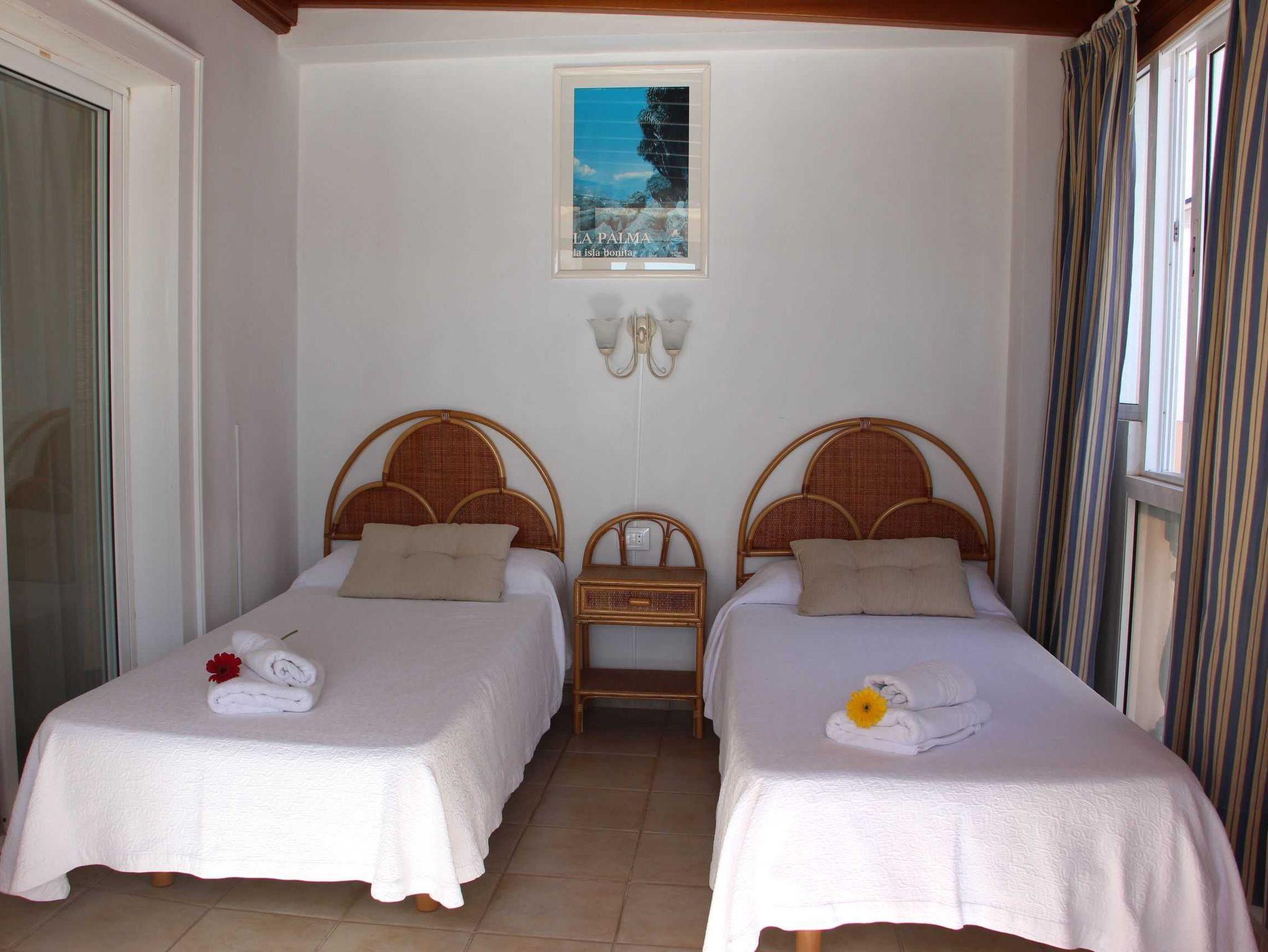 • 1 Schlafzimmer mit zwei Einzelbetten, Glasschiebetür zur Terrasse hin, Kommode, Meerblick