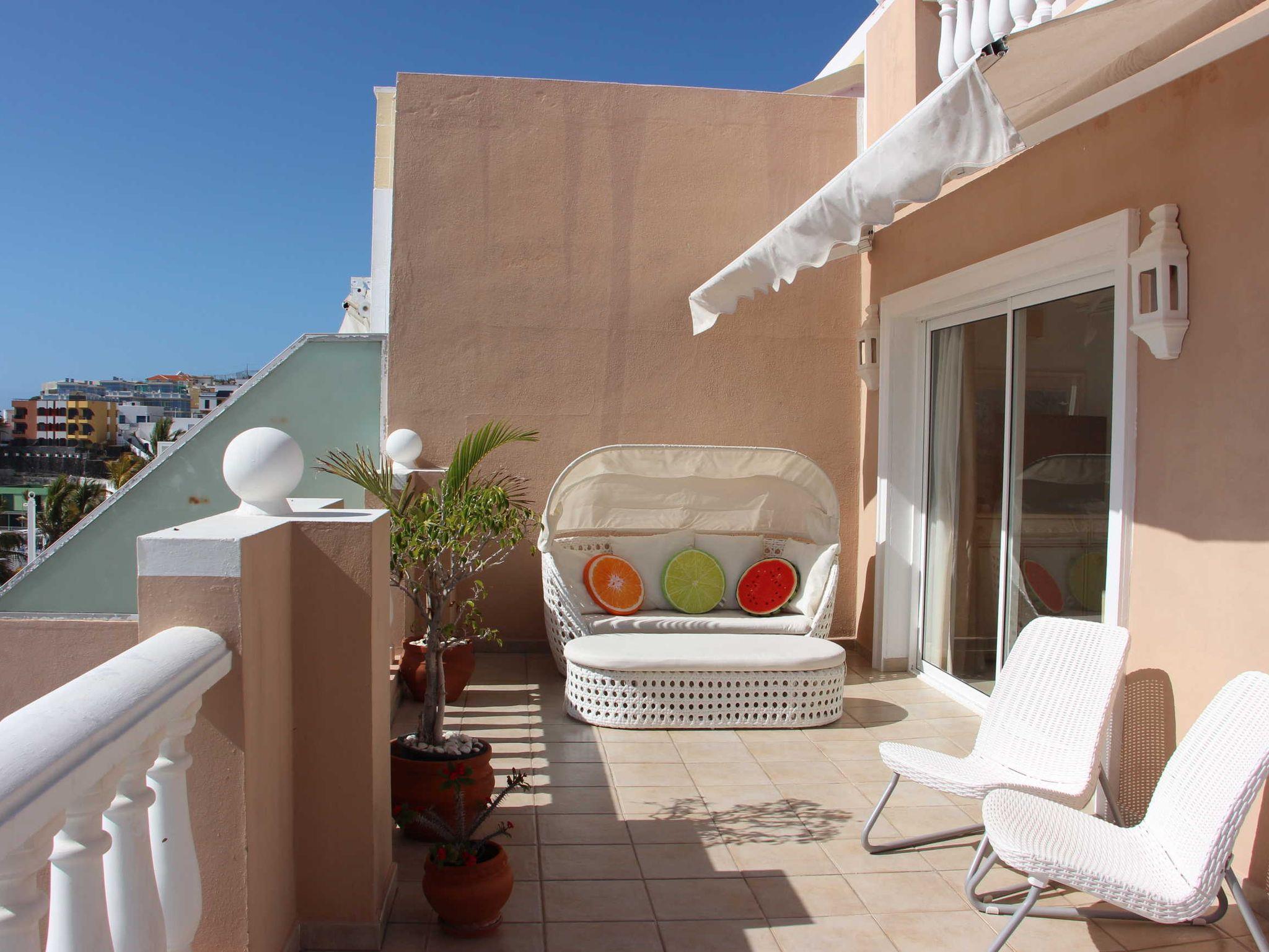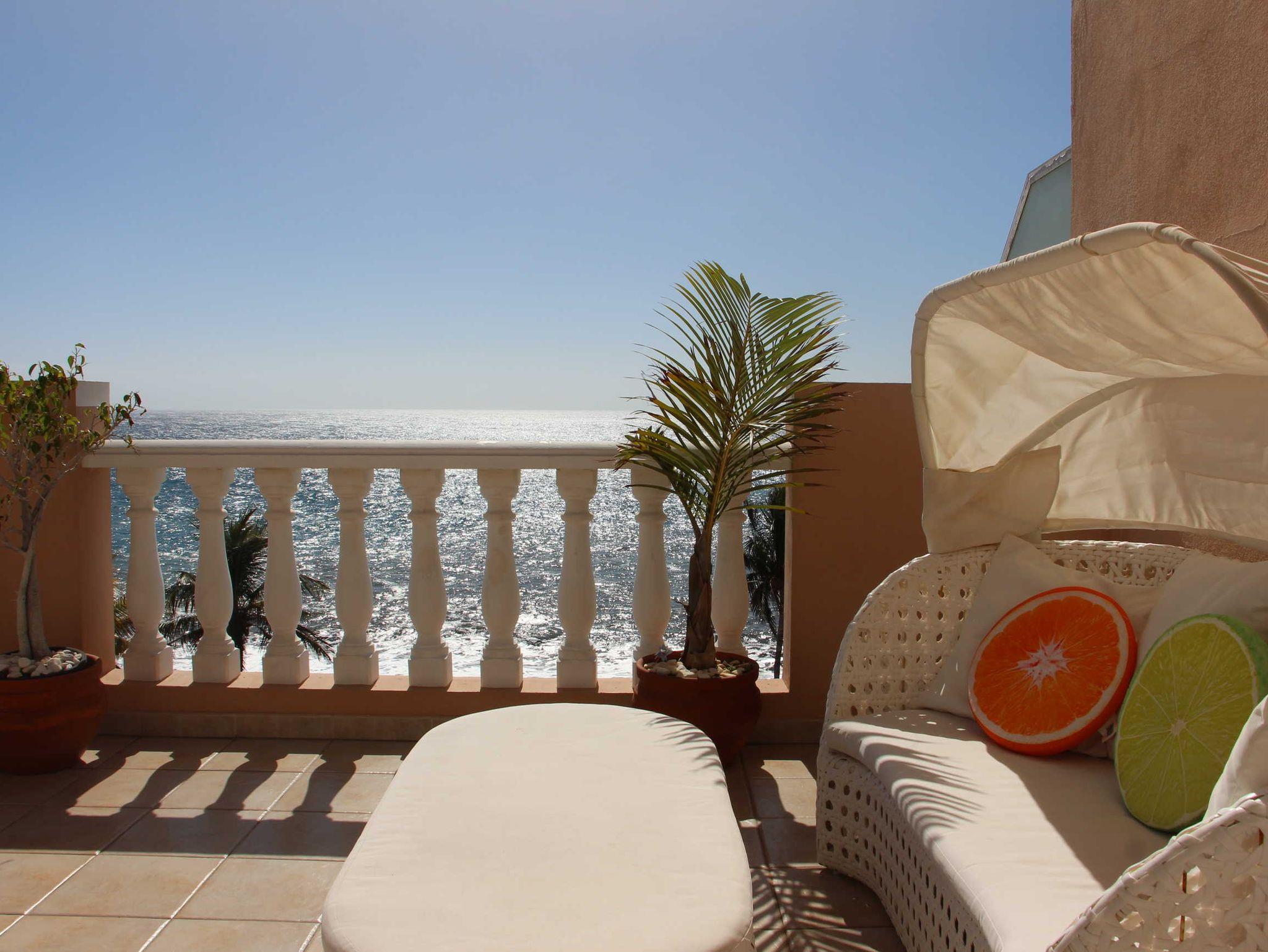 • Highlight: Große, L-förmige Dachterrasse mit Sonnenmarkise, möbliert mit: modernem Loungesofa, 2 Sonnenliegen, Esstisch für 4, Super-Meer- und Strandblick ca. 40qm