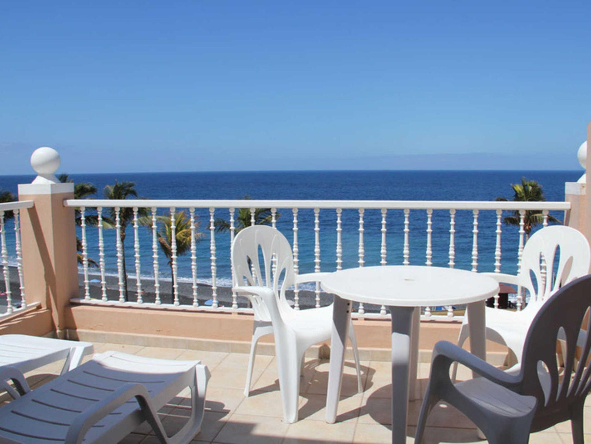 Das Apartmenthaus Regata liegt in Puerto Naos direkt gegenüber dem breiten Lavasandstrand mit Palmen.