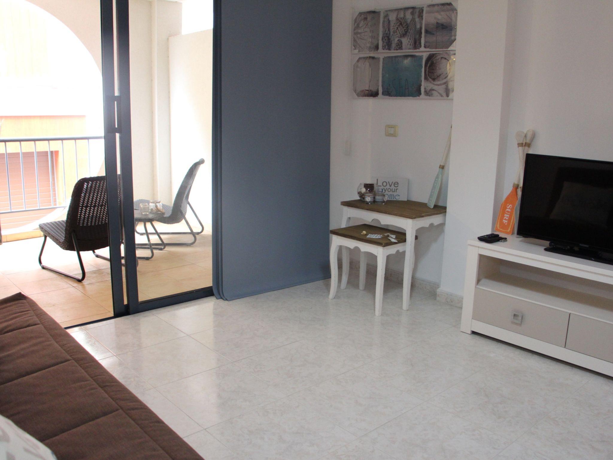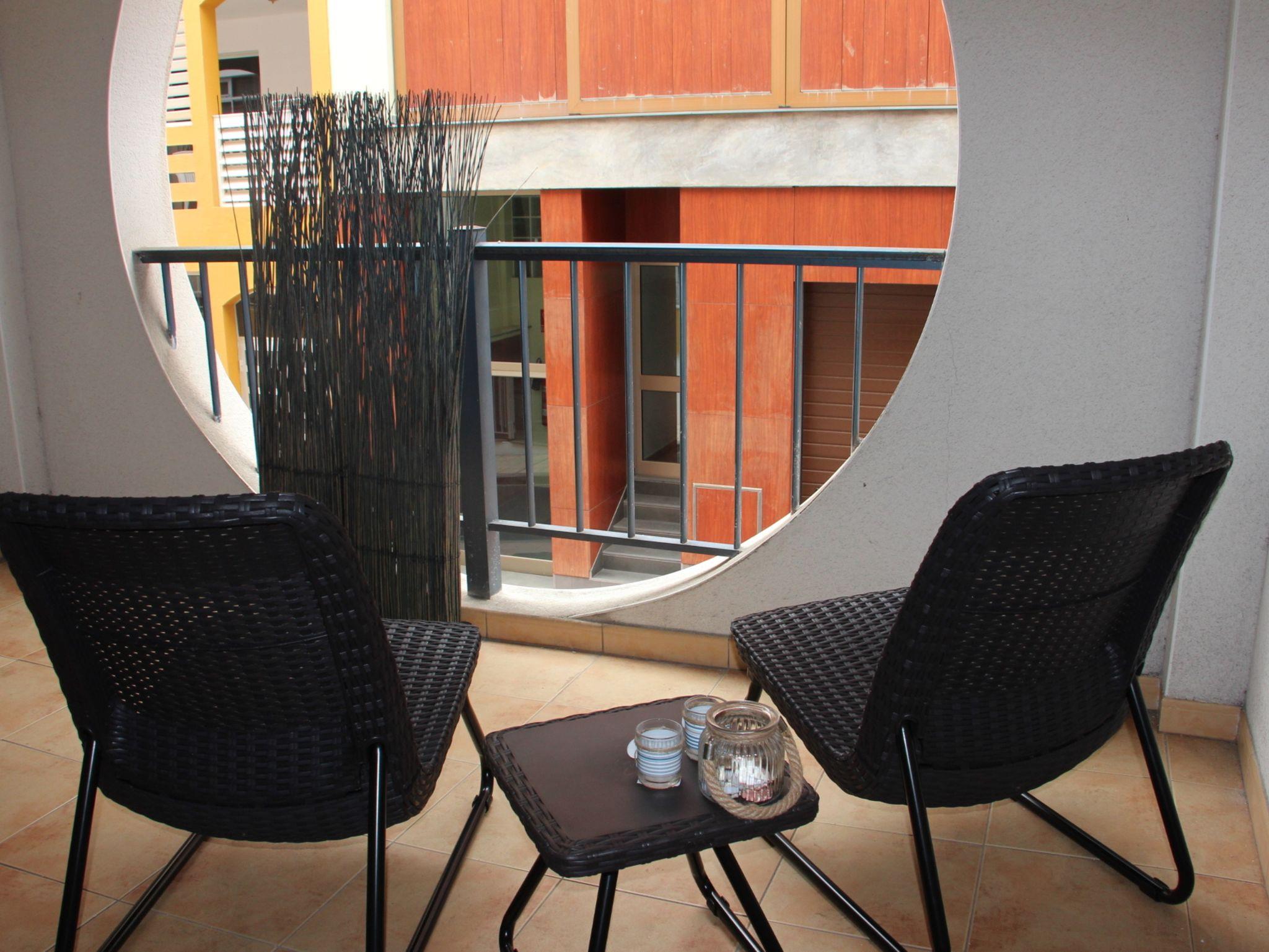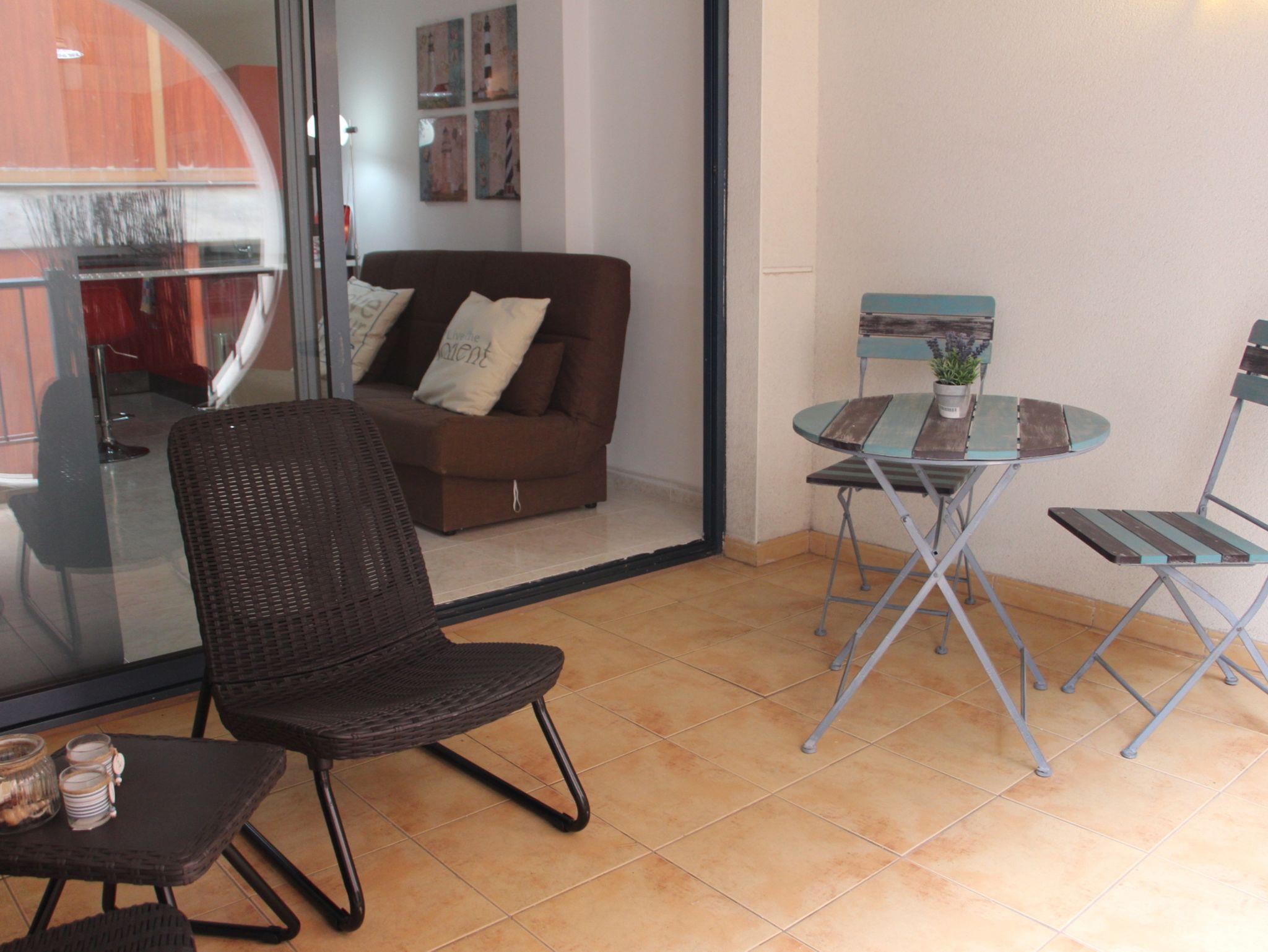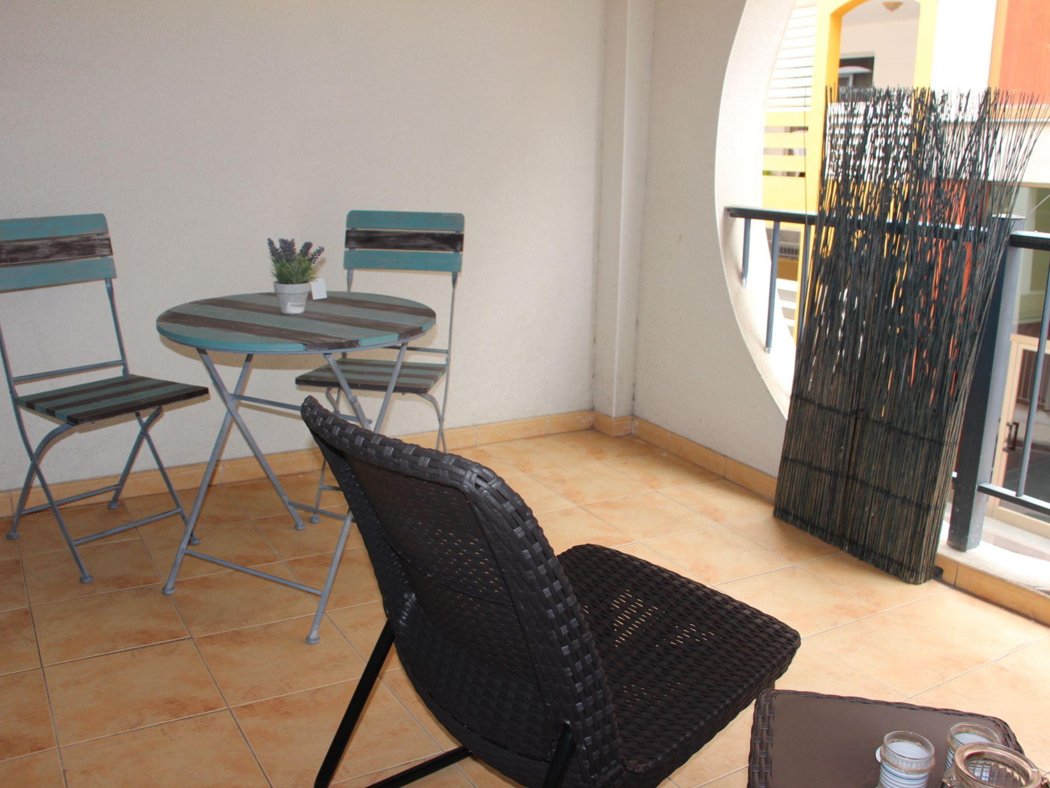 Die 10qm große Terrasse ist komplett überdacht und mit einem kleinen Tisch und 2 Stühlen sowie zwei bequemen kleinen Loungesesseln ausgestattet. In nur wenigen Minuten den Strand, einen Obst und Gemüseladen sowie den Supermarkt und einige Restaurants.