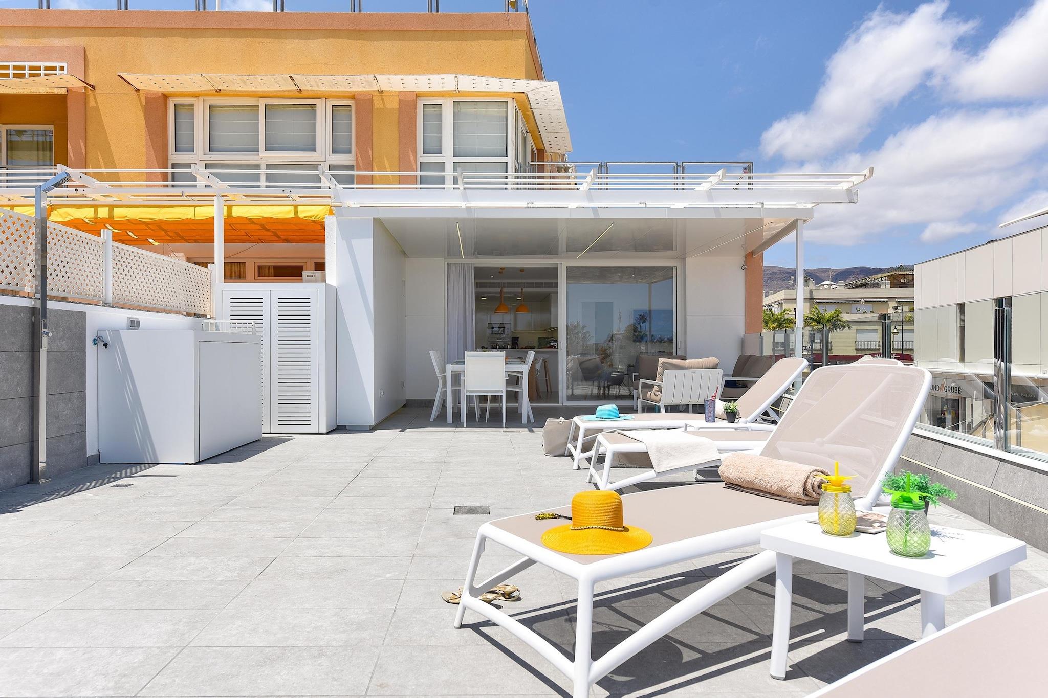 Apartment in the first line of the beach in the south of Gran Canaria has 3 bedrooms for 6 people with magnificent views of the Port of Mogán and a solarium terrace of 80 square meters. This very bright and spacious holiday flat has 3 bedrooms; two of them with two single beds each and the master bedroom with a double bed. There are 3 bathrooms, all of them with shower. The kitchen has all the accessories and appliances to make your stay as enjoyable as possible, with dishwasher, oven, microwave, washing machine, toaster and everything else you need. The living room has smart tv and satellite TV. There is free internet connection via wifi and air conditioning in the house. On the terrace you will find sun loungers and it is very spacious with fantastic and privileged views of the surroundings, especially of the beach and the Port of Mogán. In case you have rented a car, you don't have to worry about the parking space since there is one available in the building's garage. Apartment Mogán has an unbeatable location, which allows you to have access to all kinds of services and establishments in a matter of seconds. The marina and fishing port area is just a two minute walk away with many more restaurants and cafes. A walk along the quays and its picturesque streets where the violet of the bougainvillea and the bright white of the houses dotted with blue and green tones is one of the highlights of any visit to Gran Canaria. The port of Mogán has a lot to offer with activities such as private boat hire for sea excursions, sport fishing such as the Blue Marlin or even a submarine ride on the seabed.