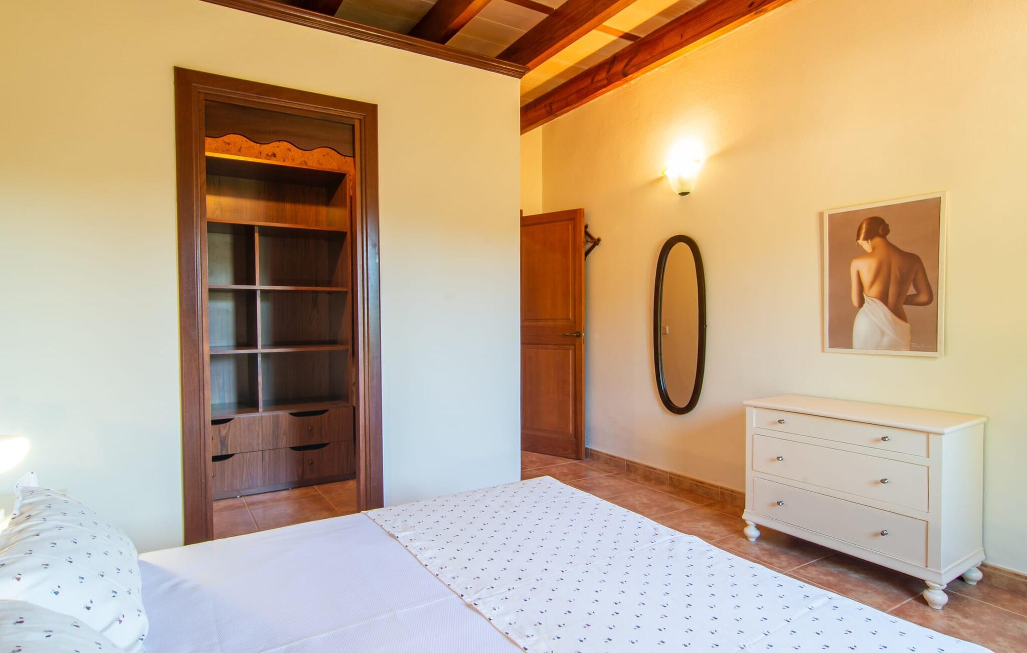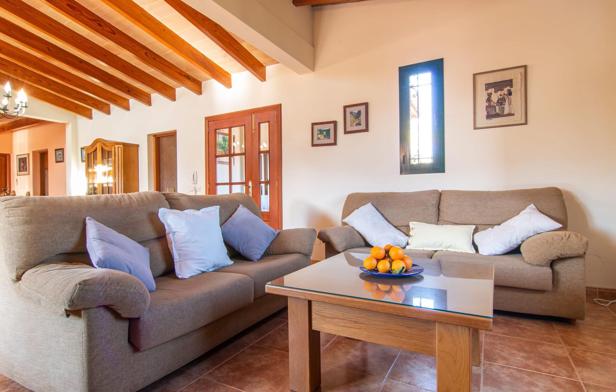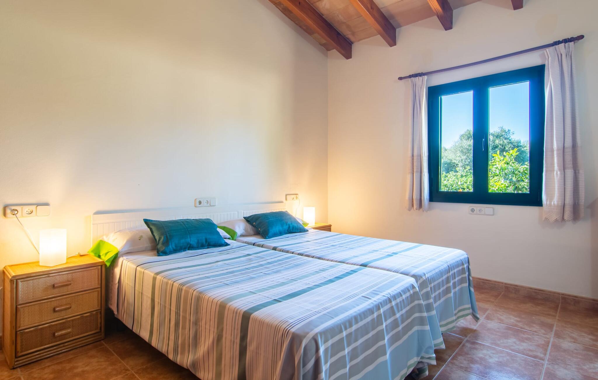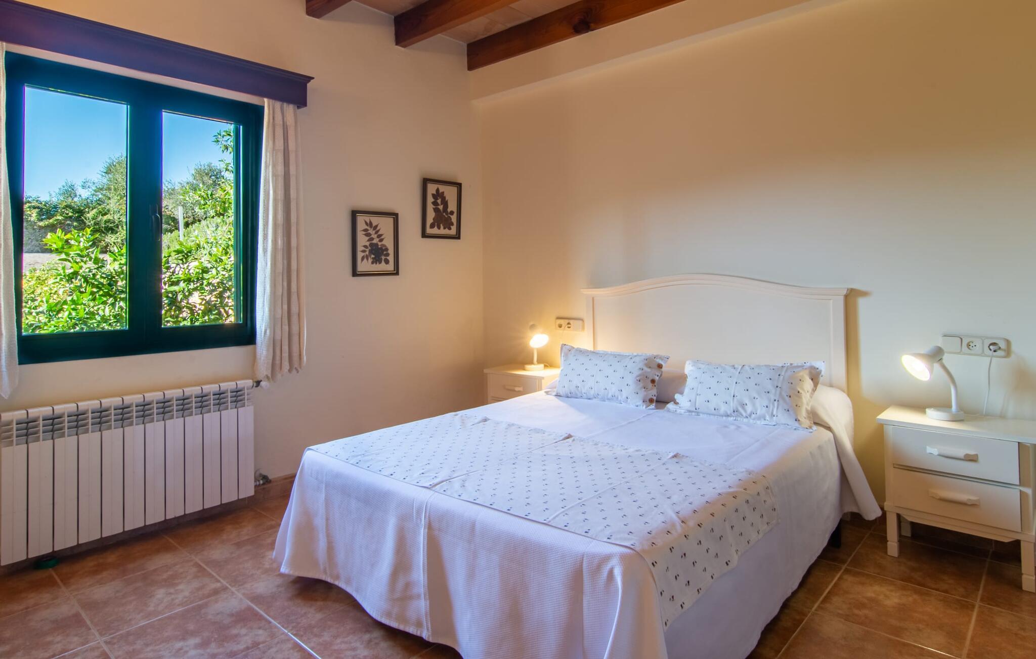 Denne vidunderlige rustikke og samtidig moderne finca i det østlige Mallorca imponerer ikke kun med sin familievenlige indretning, men også med sin charmerende landstedskarakter, som er tydeligt synlig både ude og inde. Det betyder, at feriehuset, der ligger vidunderligt ugeneret med mallorcansk bondegårdsflair, passer særligt godt ind i denne kystregion, som imponerer med sit blidt bakkede grønne landskab. Fincaen er omgivet af talrige træer og en frugthave. Samtidig byder det private poolområde med en omgivende terrasse på adskillige liggestole. Nogle af dem er beskyttet af en stilfuld pergola eller parasol. Der er også en børnegynge til rådighed for yngre besøgende, så de kan få aktiv underholdning. Der er behagelige udendørs siddepladser ved muret grill med integreret udekøkken. I kan nyde en vidunderlig udsigt fra den overdækkede altan med yderligere spiseplads på tagterrassen på første sal. Derfra har I direkte adgang til den rummelige stue med hyggelig pejs og åben spiseplads. Møblerne i den passende landhusstil afspejler den vellykkede symbiose af tradition og modernitet, som kun findes i fincaer på Mallorca. I det fuldt udstyrede køkken med en kogeø er det en fornøjelse at tilberede måltider sammen - for på en eller anden måde er det en del af en ferie at tilberede mad i en venlig atmosfære (selvfølgelig kan I inkludere grillen her). De hyggelige møbler med bløde farver skaber en behagelig atmosfære. Der er plads nok til op til syv personer og to babyer, hvilket gør fincaen ideel til en ferie med to familier. På stueplan på øverste etage er der et soveværelse med dobbeltseng med eget badeværelse og et andet rummeligt badeværelse. Yderligere tre soveværelser - to dobbeltværelser og et enkelt - er placeret i stueetagen og kan nås via en intern trappe fra opholdsstuen i åbent plan, ligesom et tredje badeværelse med badekar. Pula Viñas – dette behagelige navn resonerer med intensiteten af de endemiske vine, som I bestemt bør prøve under jeres ophold i dette fantastiske feriehus med pool. Denne rustikke, omfattende renoverede feriefinca imponerer med sin ejendom med en tilstødende frugthave, vidunderlige udendørs siddepladser og en privat pool. Det er tæt på den akustisk mærkbare landevej, der fører langs Mallorcas østkyst til Cala Ratjada. De smukke landsbyer Son Servera eller Costa del Pins kan nås på cirka 5 minutter og byder på gode shoppingmuligheder. En fin sandstrand, også kaldet Sa Marjal, venter på jer i Costa des Pins.