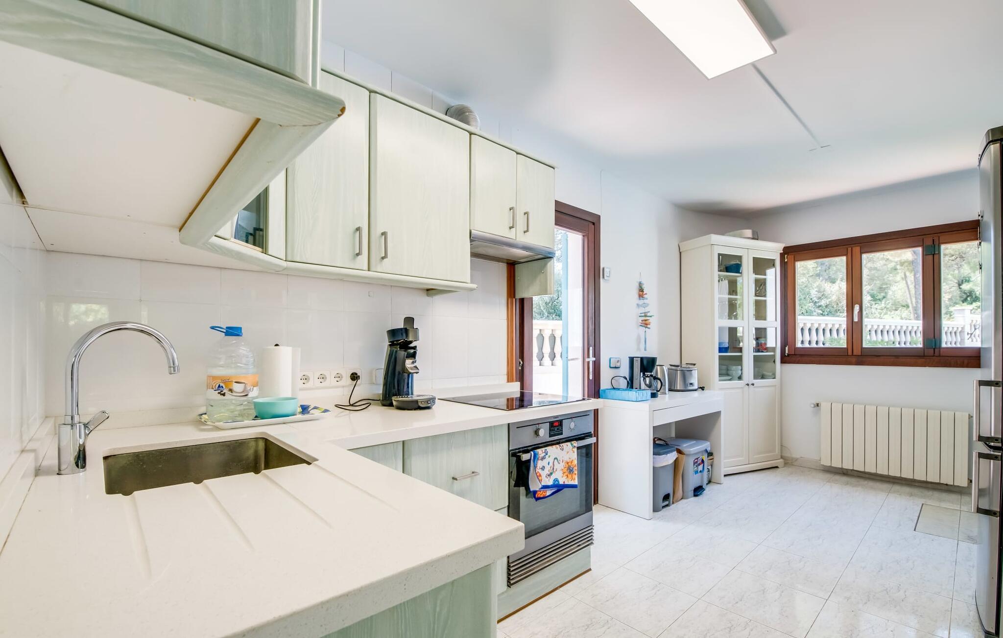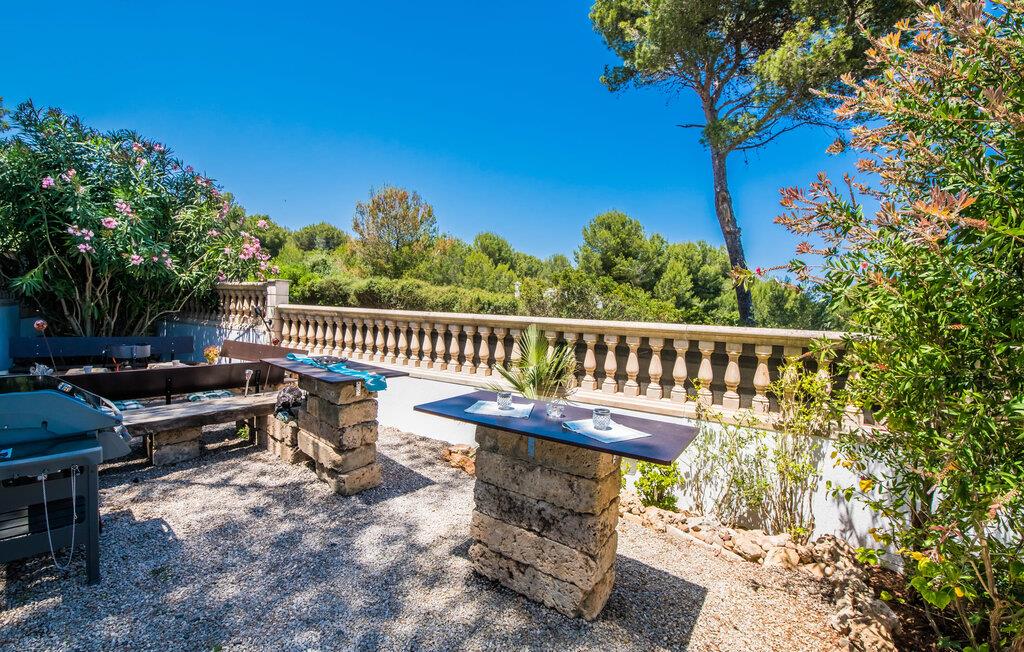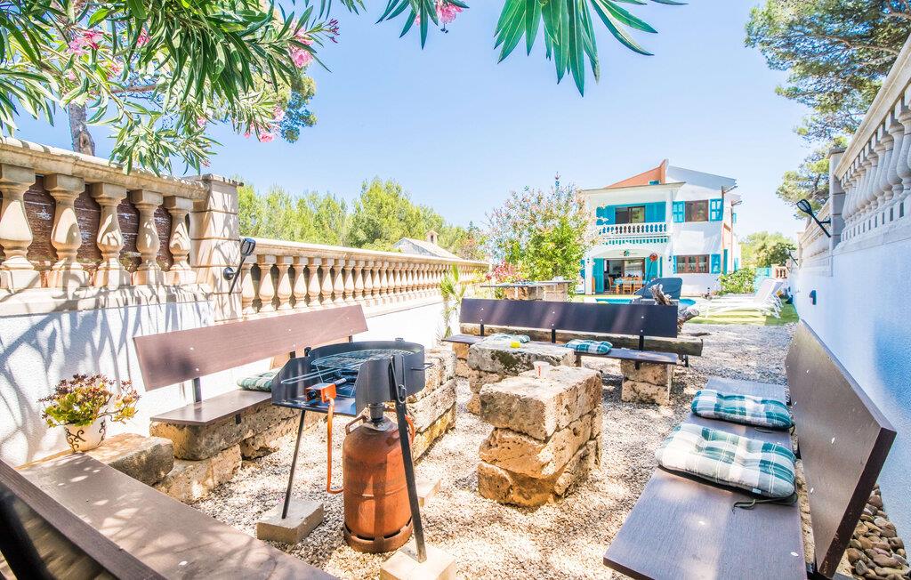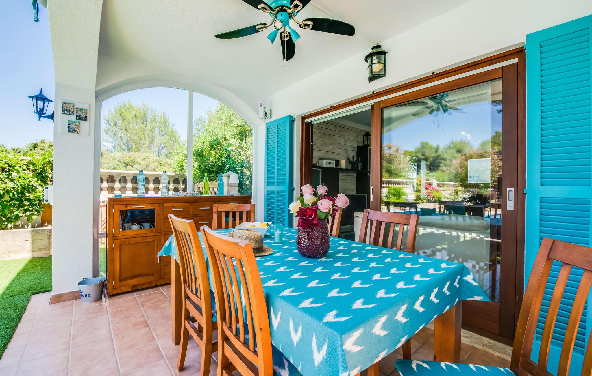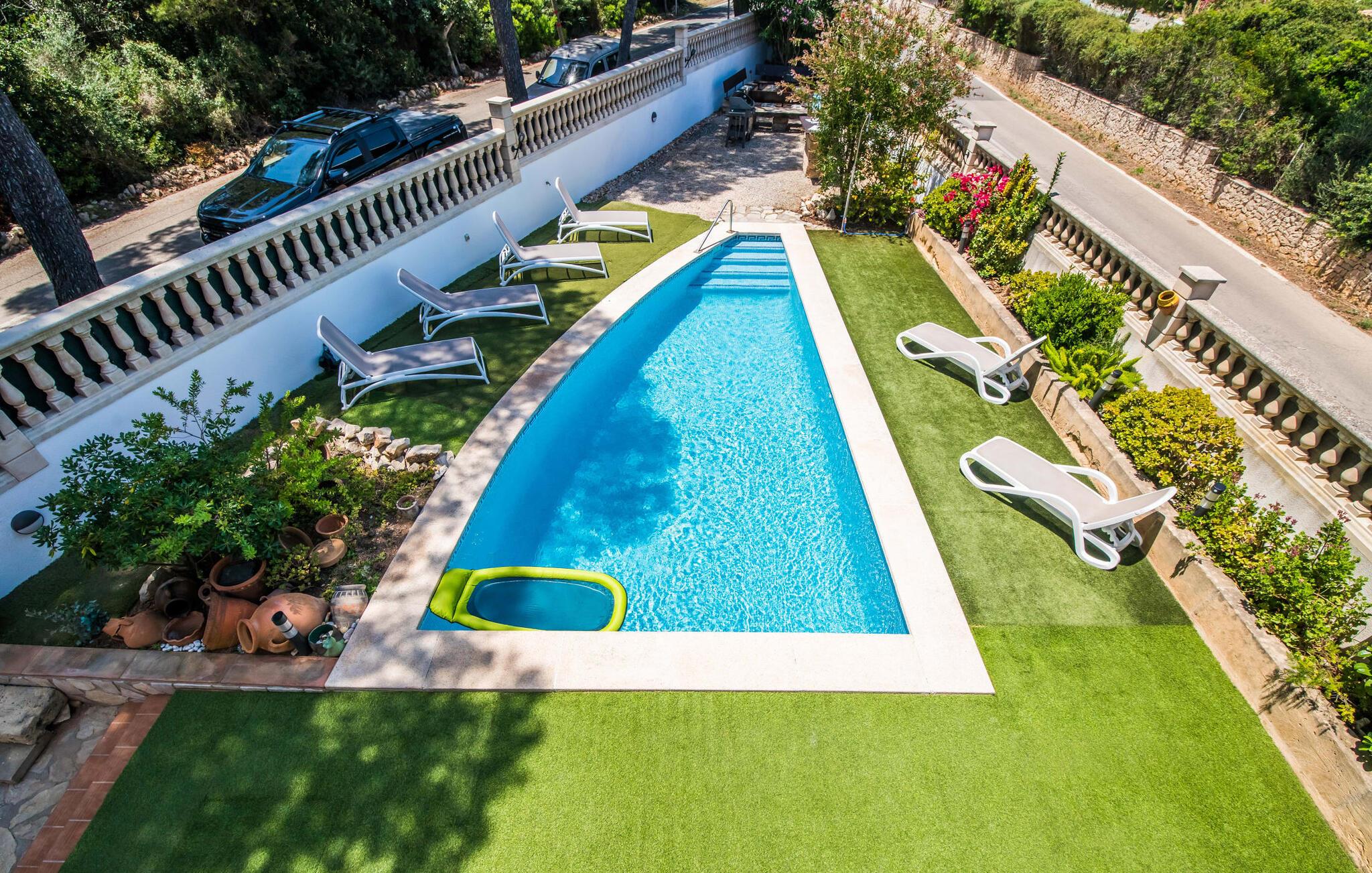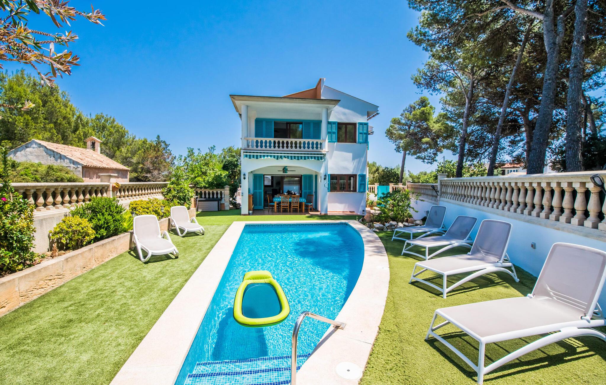 Placeringen er fantastisk: så tæt på havet, at I endda kan se det fra balkonen; En gåtur til vandet tager kun et par minutter. Villaen "Punta Blava", bygget i et typisk enfamilies boligområde, er indrettet i hvidt og har skodder, der skinner i samme turkisblå som poolen i haven. Huset på Mallorcas østkyst har en hyggelig maritim atmosfære og byder på masser af komfort, især for familier med børn. Højdepunkter: swimmingpoolen med kunstgræs og liggestole omkring, den overdækkede terrasse og grillpladsen med en paellapande. Der er en gynge i forhaven til de mindste. Indretningen er moderne, med masser af hvidt, kombineret med forskellige naturtoner og mørkt træ, som umiddelbart får jer til at føle jer godt tilpas. I stueplan er der åben opholds- og spiseafdeling samt veludstyret køkken med direkte adgang til udearealet. Også i stueetagen er der et soveværelse og et moderne badeværelse. En trappe fører til første sal med to soveværelser, hver med eget badeværelse. Ved havet: Dette er ikke noget problem selv med små børn, hvis I tilbringer jeres ferie i villaen "Punta Blava". Kun omkring 100 m adskiller jer fra kysten. Det smukke hus med turkise skodder og swimmingpool ligger på en lang grund i en urbanisering på øens østkyst. Cala Ratjada ligger mindre end 4 km derfra i bil. De nærmeste strande som Font de Sa Cala og Platja de Son Moll ligger henholdsvis kun 1,4 km og 2 km væk. En lille bugt med adgang til havet og en lille strand ligger lige udenfor jeres dør.