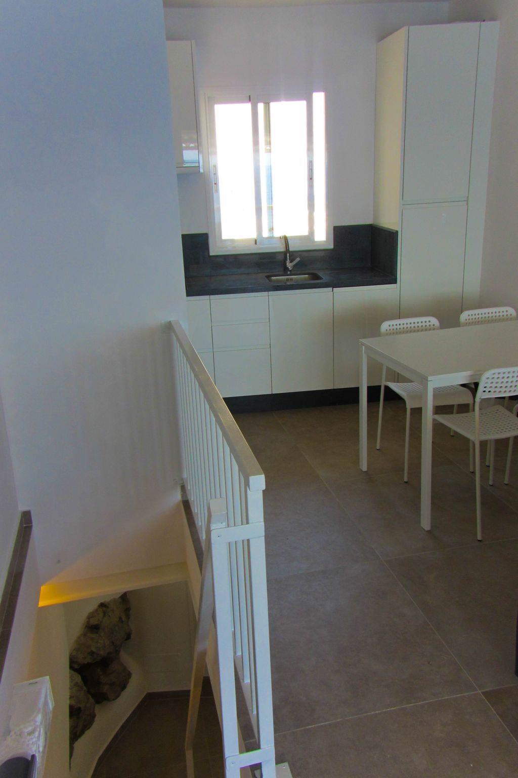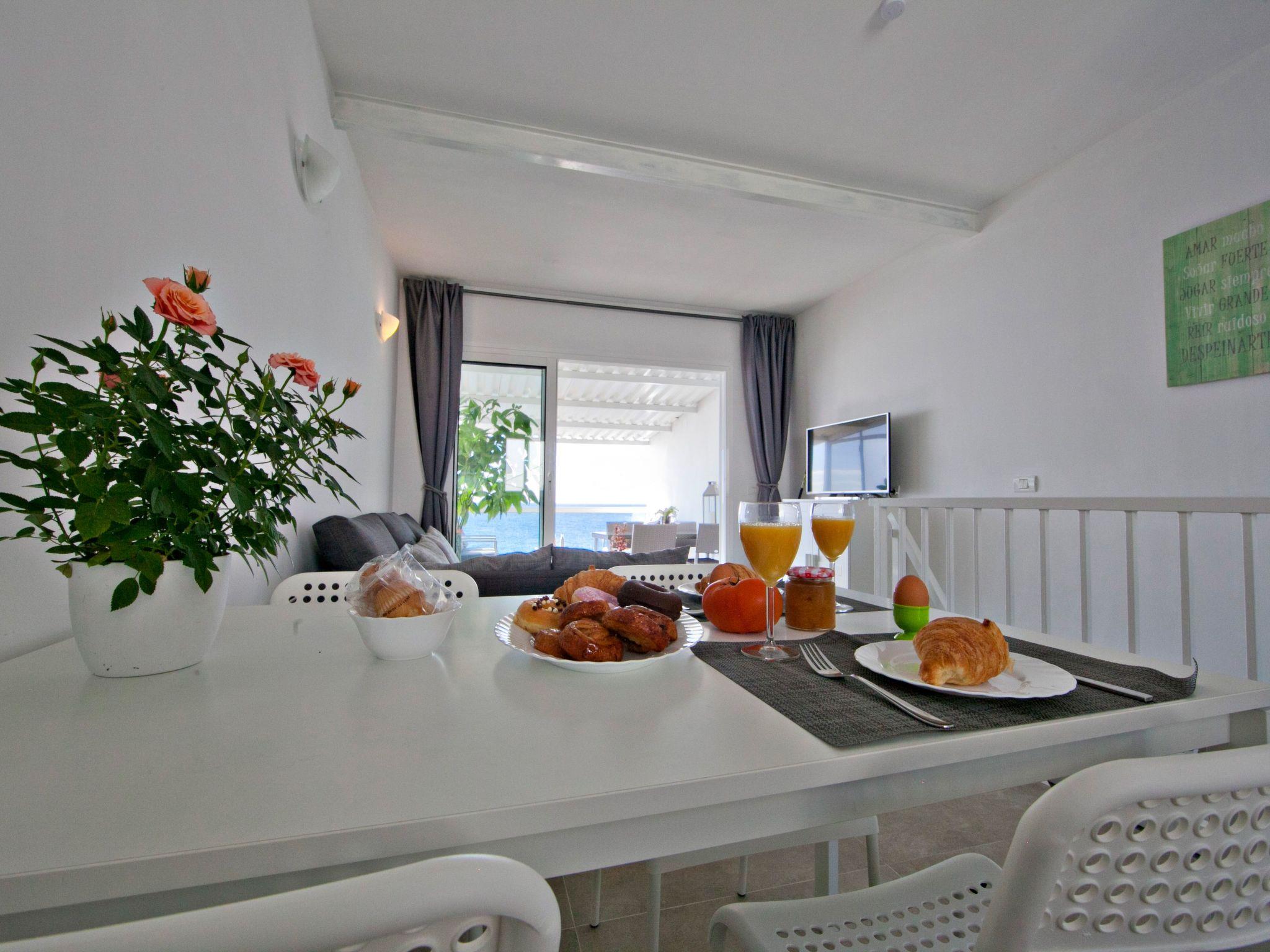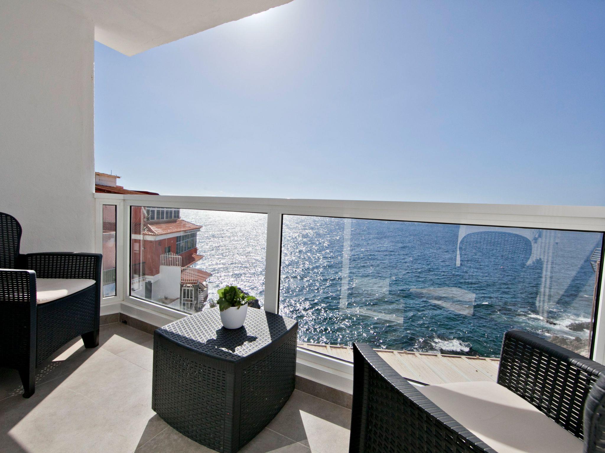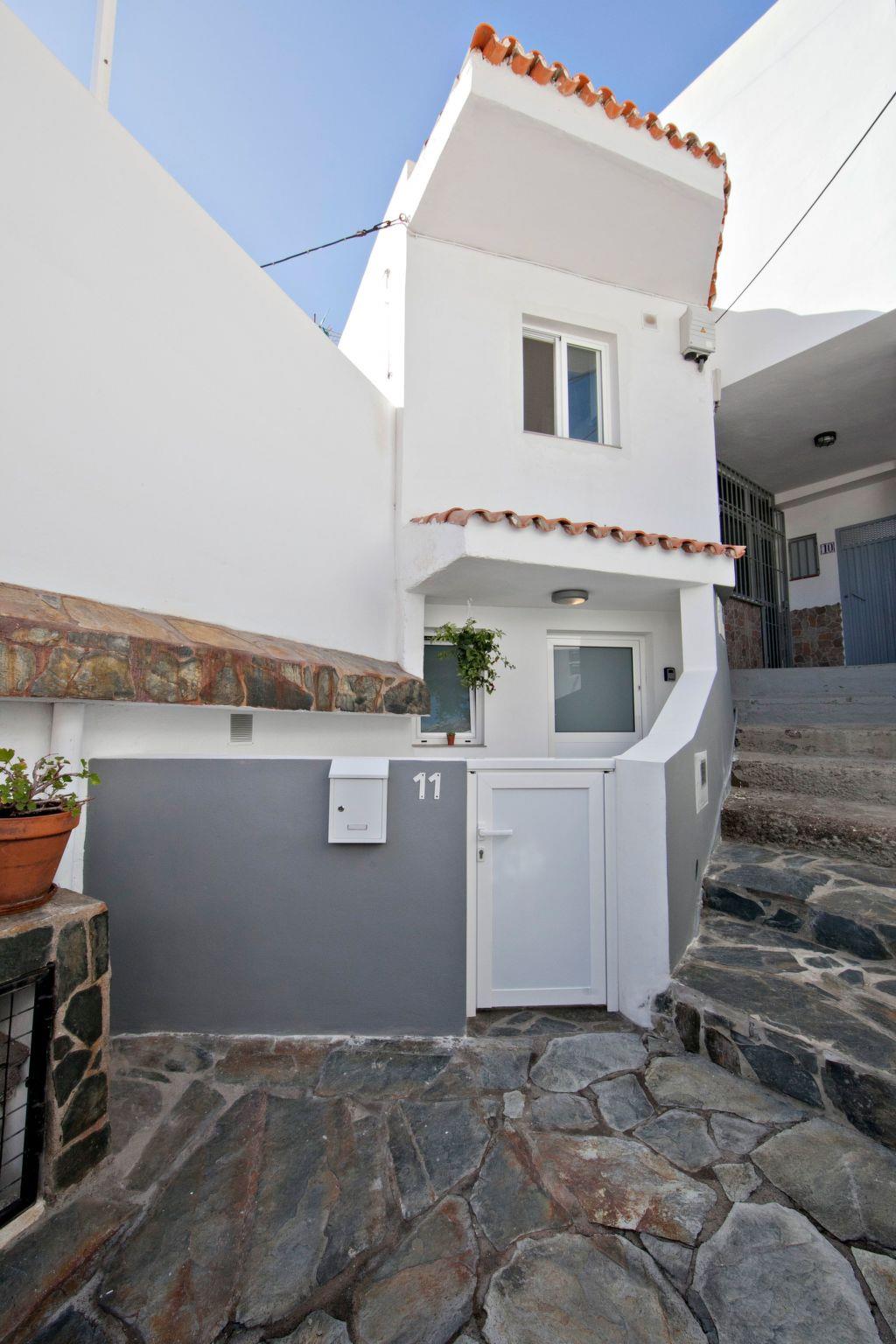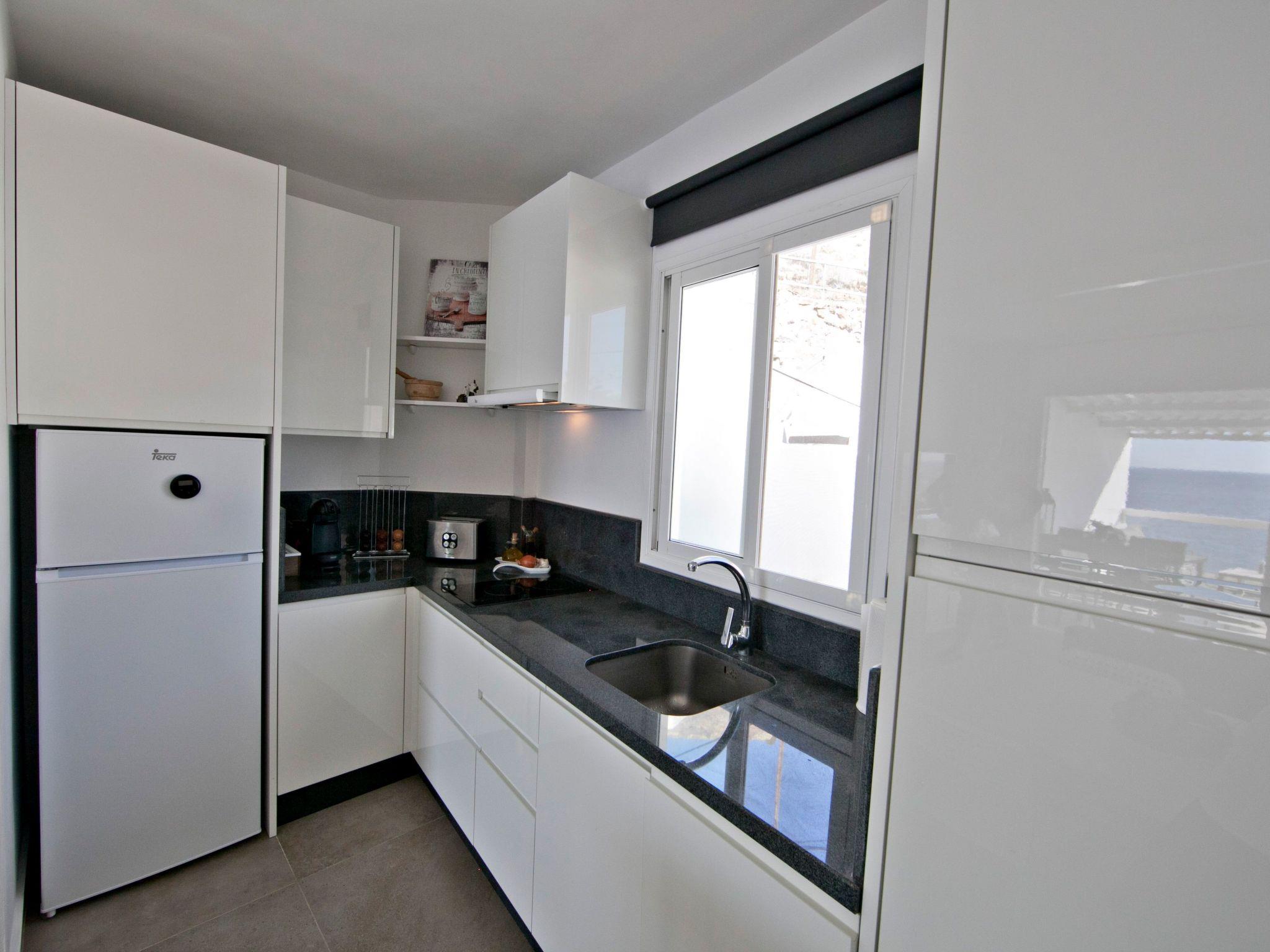 It is distributed in 2 floors and has a small patio at the entrance. Once inside you find a bathroom to your left hand containing a sink, build in shower and a toilet. On the other side of the bathroom you find the stairs to go up to the first floor. As a decoration detail you can still see a vulcanical rock that teaches us about the mountain on which the House is built. Below the staircase you find the lobby. Following you find a room with a three beds bunkbed in loft-style. This space is also covers a large wardrobe of 2 meters wide, 2.40 meters high and 90 cm deep. This is also the washing machine cabinet. Sliding doors separate this area from the main bedroom. In the master bedroom you find a 160 cm by 200cm bed. Also there are two bedside tables and lights to read. The special appeal of this bedroom are its large windows that lead onto a private balcony and giving a panoramic view to the Atlantic Ocean. You can sit on the balcony watching the dawn from comfortable chairs on the terrace. Rising to the first floor there is a well equipped kitchen dishwasher, Dolce Gusto coffee machine, refrigerator and freezer, induction cooker, sink and a microwave with oven function. In the kitchen you will find pots, pans, and everything you need for cooking. You have at your disposal a wide table with 4 chairs and a sofa bed. The living room also features a Smart TV with international satellite TV. From the lounge you can open huge windows to access the more than 15 m2 big terrace. The glass balustrade of the terrace create an aspect of infinity that will give you the feeling that you are in the sea. The terrace has a dining area with a table and 4 chairs and a chill-out area to relax and enjoy the Sun and the views. The House is easy to keep clean and recently refurbished using materials of high quality such as a high end porcelain stoneware floor. Also worth mentioning is that the House has a connection to the internet with a download speed of 300 Mb using a network cable. The WiFi router is placed in the Centre of the room giving coverage to the entire space. The total area of the House is more than 70m 2