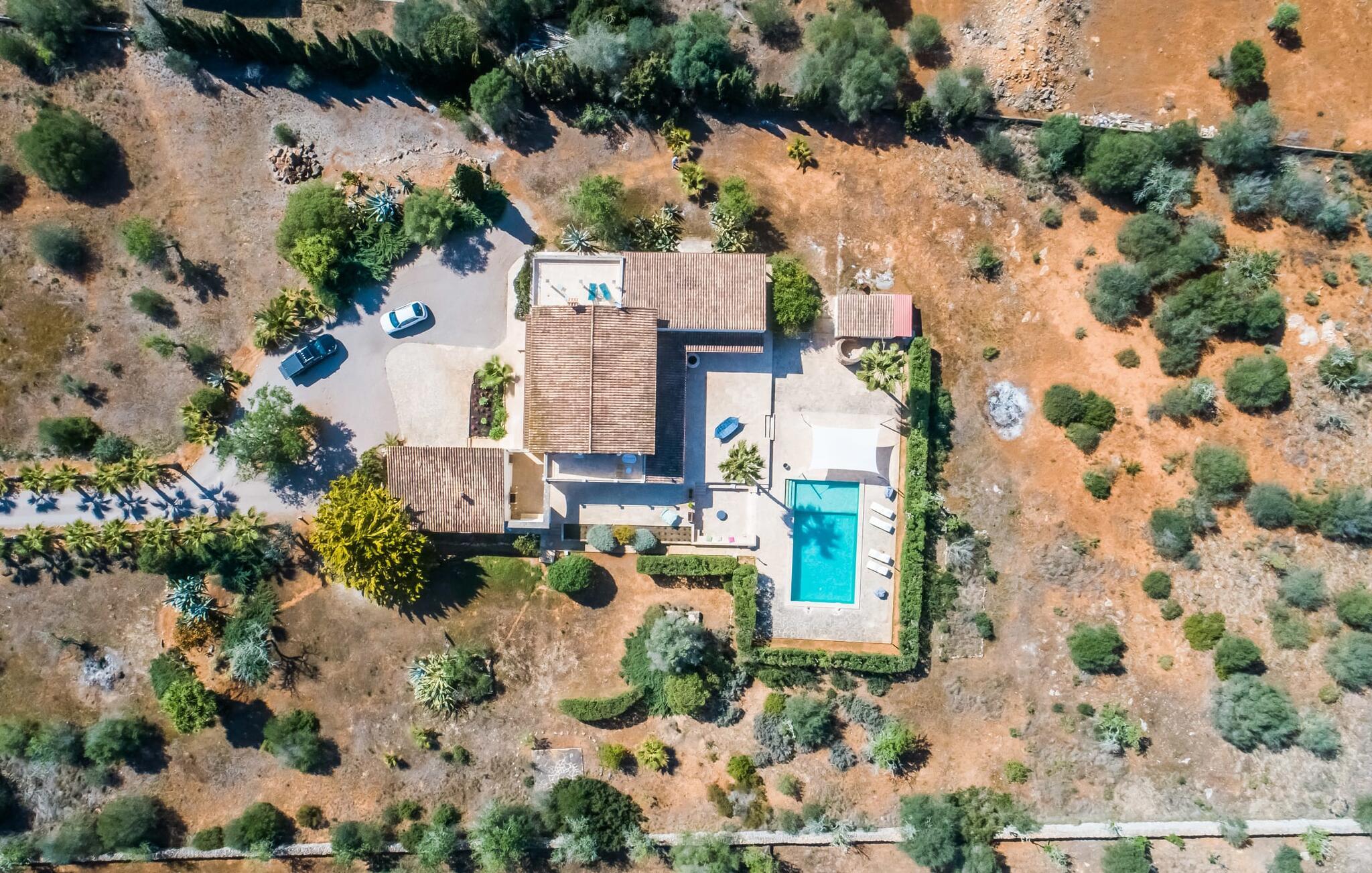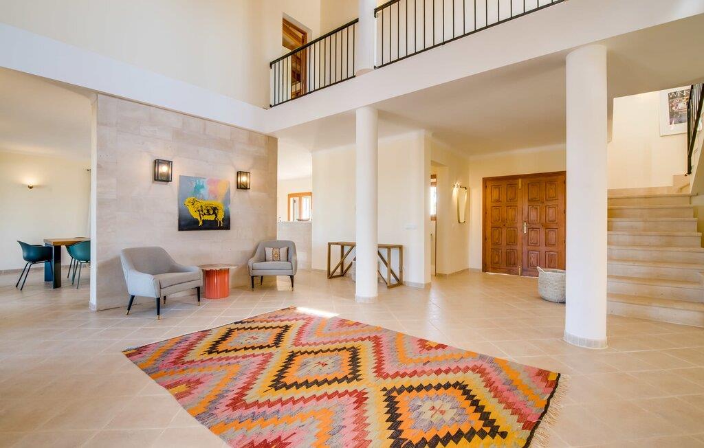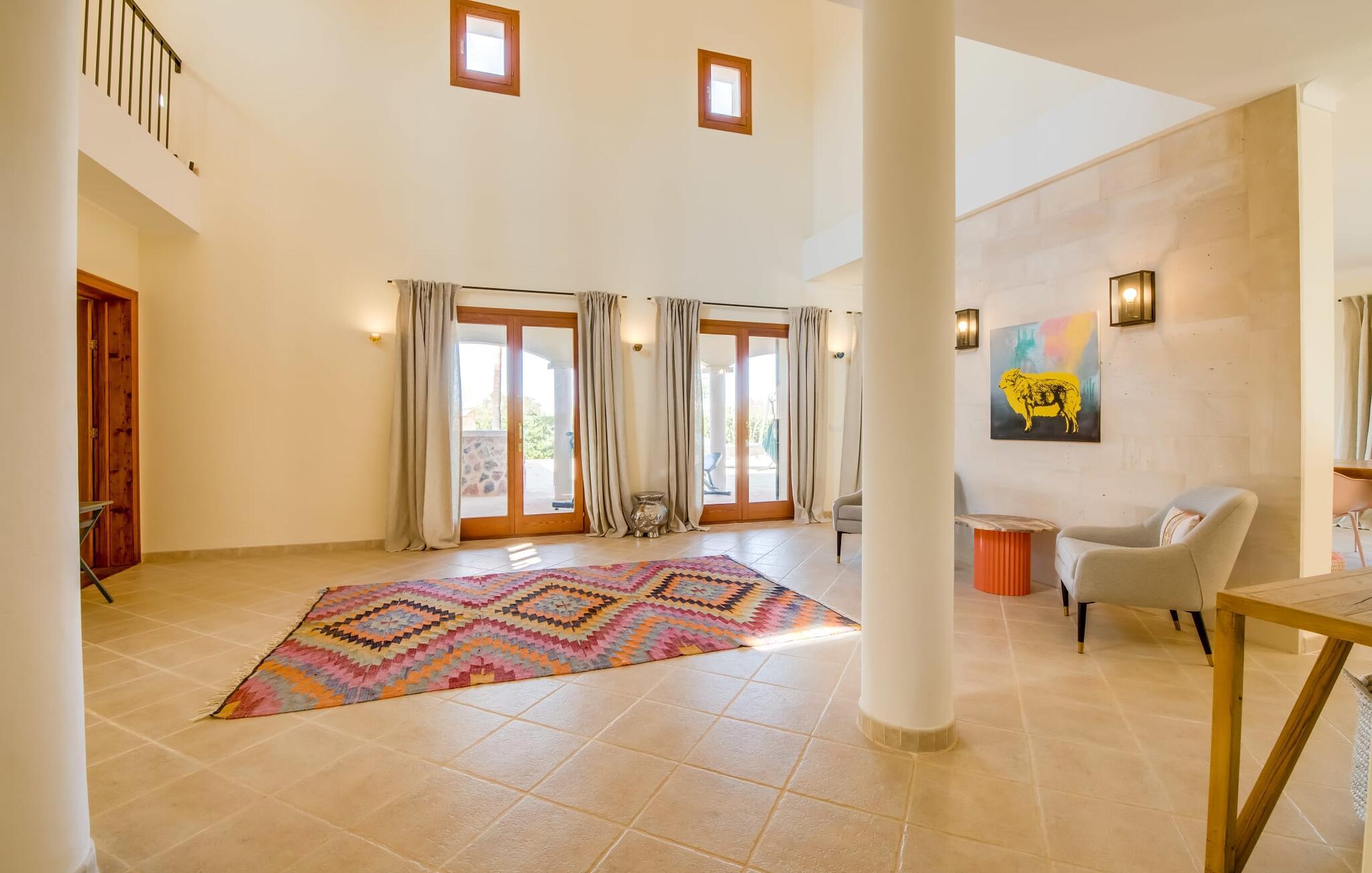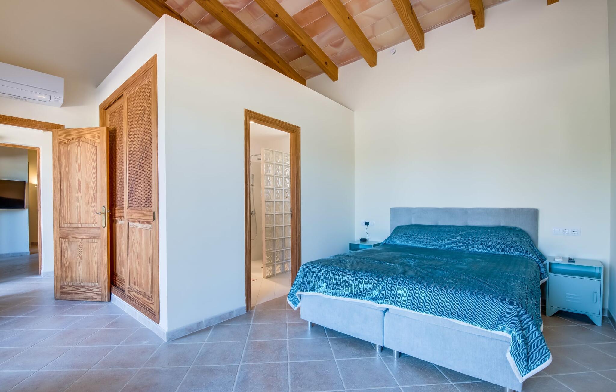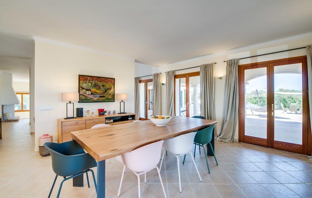 Velkommen til den sydlige del af Mallorca og til det smagfuldt højkvalitets bondehus "Roca del Rey" - tæt på kysten med smukke sandstrande med fremragende vandkvalitet og smukke byer som Santanyí og Felanitx, dvs. med en udsat beliggenhed. Naturskønheder som naturparken Mondragó eller saltmarkerne er uden sidestykke. Dette feriehus, som kan bookes hele året rundt, har en allé af palmer og er velegnet til 1-2 familier. Dette kan allerede ses på udendørsområdet ved den indhegnede pool med en imponerende poolstørrelse. Hele terrassearealet er udlagt med naturstensflader, indhegnet af grønne hække og beskyttet mod indsyn. Perfekt afslapning efter pooltid – ren luksus under det sejldækkede siddeområde eller på området to trin lavere med murstensbænke! I kan vælge andre yndlingssteder på udsatte eller overdækkede terrasser foran og bag huset - disse giver også mulighed for udendørs sport med fitnessudstyr til rådighed. Hvis I ikke vil være aktiv, kan I slappe af i hængekøjen eller hellige jer selv at tilberede måltider i ro og mag - der er en moderne grill i haven. Indretningen af det to-etagers feriehus med en generøs 375 m² tilbyder jer alternativer: Et af de en-suite badeværelser kan også hurtigt nås udefra. Derudover tilbyder det fuldt udstyrede køkken, som er adskilt fra det rummelige funktionelle opholds- og spiseområde med en disk, et godt alternativ til grillen. At lave mad sammen i sådanne behagelige premium-møbler kan også være en del af en afslappende ferie. Indretningen er venlig og lys med bløde farver i lyse toner. Komfort og hygge er meget vigtigt her – og ikke kun i pejsestuen, der er et par trin lavere. Når I booker denne usædvanligt velholdte feriebolig for op til seks personer, vil I opleve absolut komfort i tre dobbeltværelser med aircondition, hver med eget badeværelse og smart-tv. To er i stueetagen. Badeværelserne tilbyder også maksimal tilfredshed med brusekabiner. Fra den åbne foyer kan I se på tværs af galleriet til øverste etage - arkitektur, der forstår at imponere. Der vil I opdage master soveværelset med walk-in closet, et komplet badeværelse og to attraktive tagterrasser med den bedste udsigt. En ferie på Mallorca i "Roca des Rey" er en ferie i særklasse. Og hvornår bestiller du? Ferie i syd - det fantastiske og yderst familievenlige bondehus "Roca del Rey" imponerer med sit store pool- og terrasselandskab. Shopping, strandferie, vandreture i naturreservatet, golf – der er mange aktiviteter, der tilbydes. På grund af dens nærhed til Santanyí og bugten af samme navn, er placeringen af stuehuset næsten ideel. Takket være den optimale forbindelse til landevejen er rejsetiden til landsbyerne og strandene ca. 4-5 minutter.