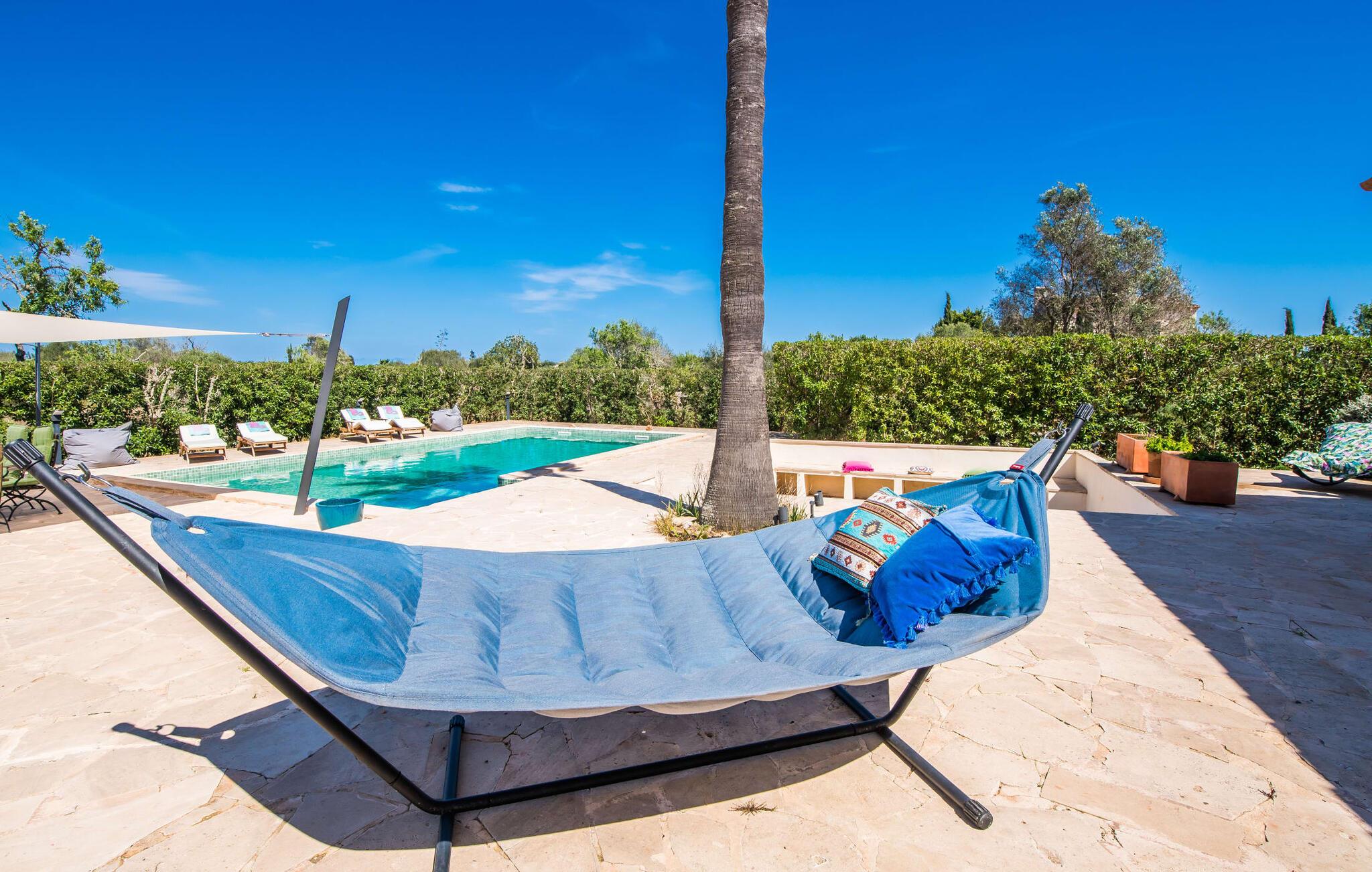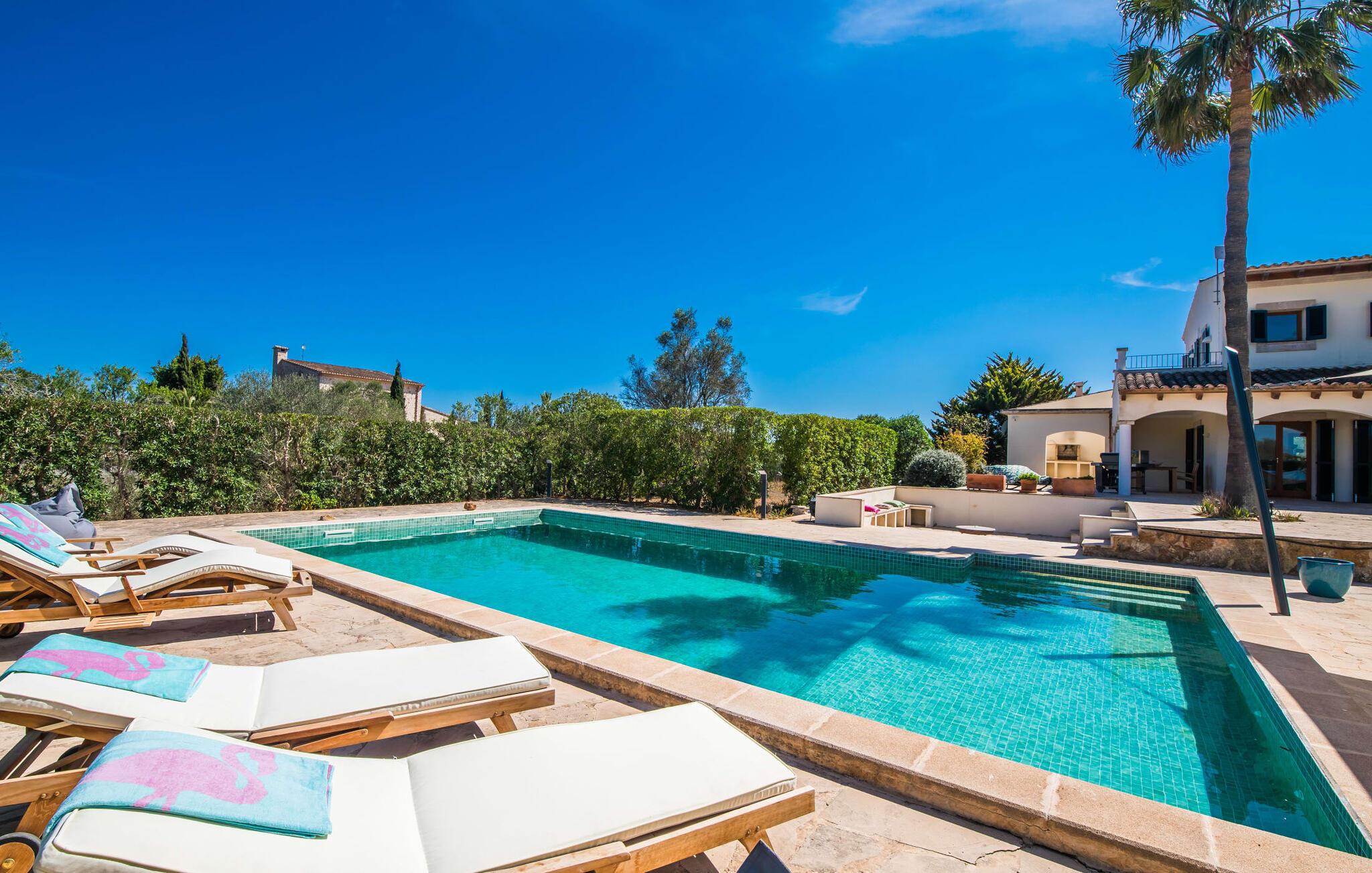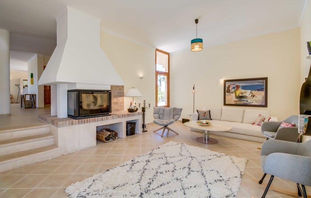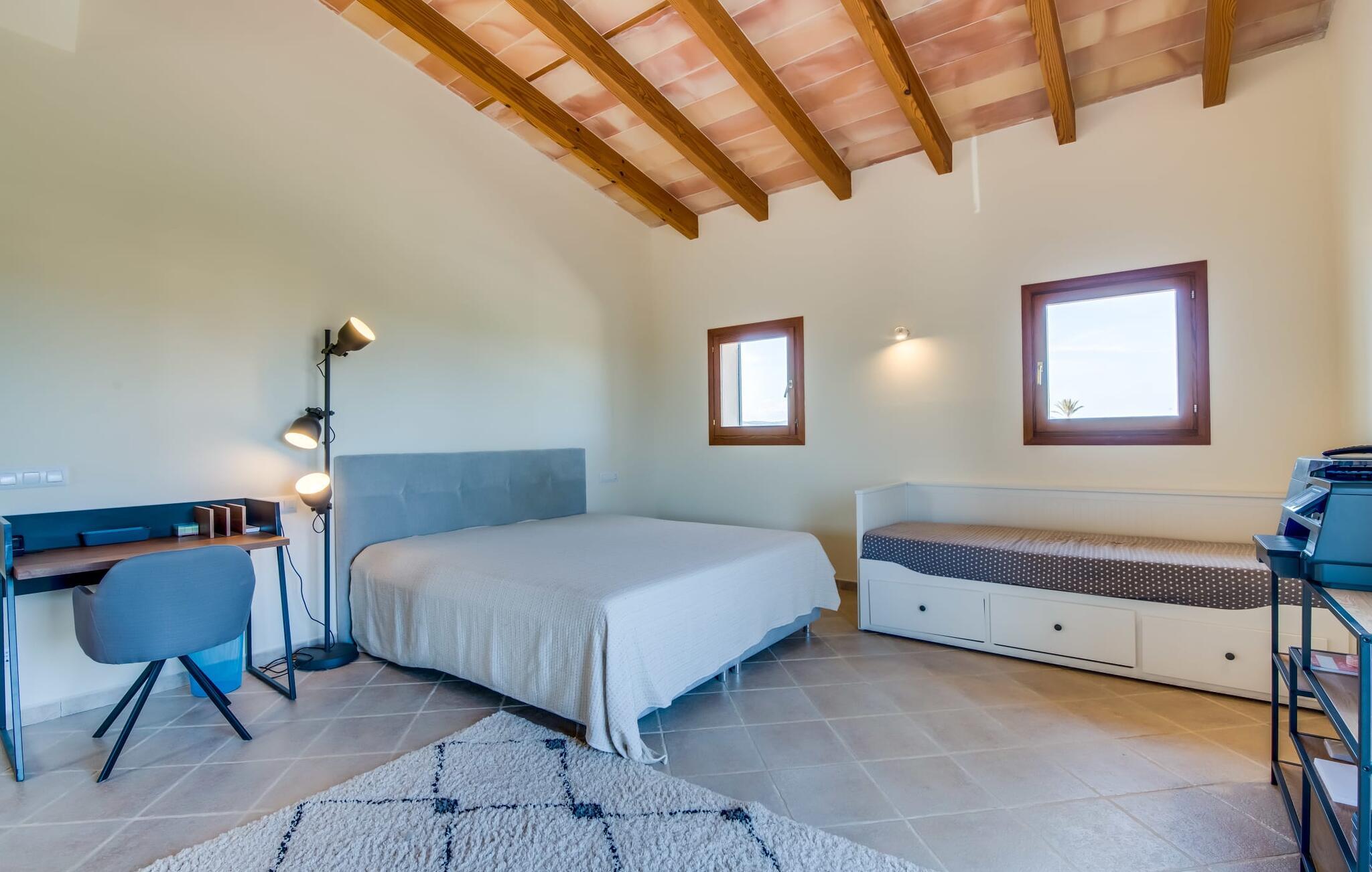 Velkommen til den sydlige del af Mallorca og til det smagfuldt højkvalitets bondehus "Roca del Rey" - tæt på kysten med smukke sandstrande med fremragende vandkvalitet og smukke byer som Santanyí og Felanitx, dvs. med en udsat beliggenhed. Naturskønheder som naturparken Mondragó eller saltmarkerne er uden sidestykke. Dette feriehus, som kan bookes hele året rundt, har en allé af palmer og er velegnet til 1-2 familier. Dette kan allerede ses på udendørsområdet ved den indhegnede pool med en imponerende poolstørrelse. Hele terrassearealet er udlagt med naturstensflader, indhegnet af grønne hække og beskyttet mod indsyn. Perfekt afslapning efter pooltid – ren luksus under det sejldækkede siddeområde eller på området to trin lavere med murstensbænke! I kan vælge andre yndlingssteder på udsatte eller overdækkede terrasser foran og bag huset - disse giver også mulighed for udendørs sport med fitnessudstyr til rådighed. Hvis I ikke vil være aktiv, kan I slappe af i hængekøjen eller hellige jer selv at tilberede måltider i ro og mag - der er en moderne grill i haven. Indretningen af det to-etagers feriehus med en generøs 375 m² tilbyder jer alternativer: Et af de en-suite badeværelser kan også hurtigt nås udefra. Derudover tilbyder det fuldt udstyrede køkken, som er adskilt fra det rummelige funktionelle opholds- og spiseområde med en disk, et godt alternativ til grillen. At lave mad sammen i sådanne behagelige premium-møbler kan også være en del af en afslappende ferie. Indretningen er venlig og lys med bløde farver i lyse toner. Komfort og hygge er meget vigtigt her – og ikke kun i pejsestuen, der er et par trin lavere. Når I booker denne usædvanligt velholdte feriebolig for op til seks personer, vil I opleve absolut komfort i tre dobbeltværelser med aircondition, hver med eget badeværelse og smart-tv. To er i stueetagen. Badeværelserne tilbyder også maksimal tilfredshed med brusekabiner. Fra den åbne foyer kan I se på tværs af galleriet til øverste etage - arkitektur, der forstår at imponere. Der vil I opdage master soveværelset med walk-in closet, et komplet badeværelse og to attraktive tagterrasser med den bedste udsigt. En ferie på Mallorca i "Roca des Rey" er en ferie i særklasse. Og hvornår bestiller du? Ferie i syd - det fantastiske og yderst familievenlige bondehus "Roca del Rey" imponerer med sit store pool- og terrasselandskab. Shopping, strandferie, vandreture i naturreservatet, golf – der er mange aktiviteter, der tilbydes. På grund af dens nærhed til Santanyí og bugten af samme navn, er placeringen af stuehuset næsten ideel. Takket være den optimale forbindelse til landevejen er rejsetiden til landsbyerne og strandene ca. 4-5 minutter.