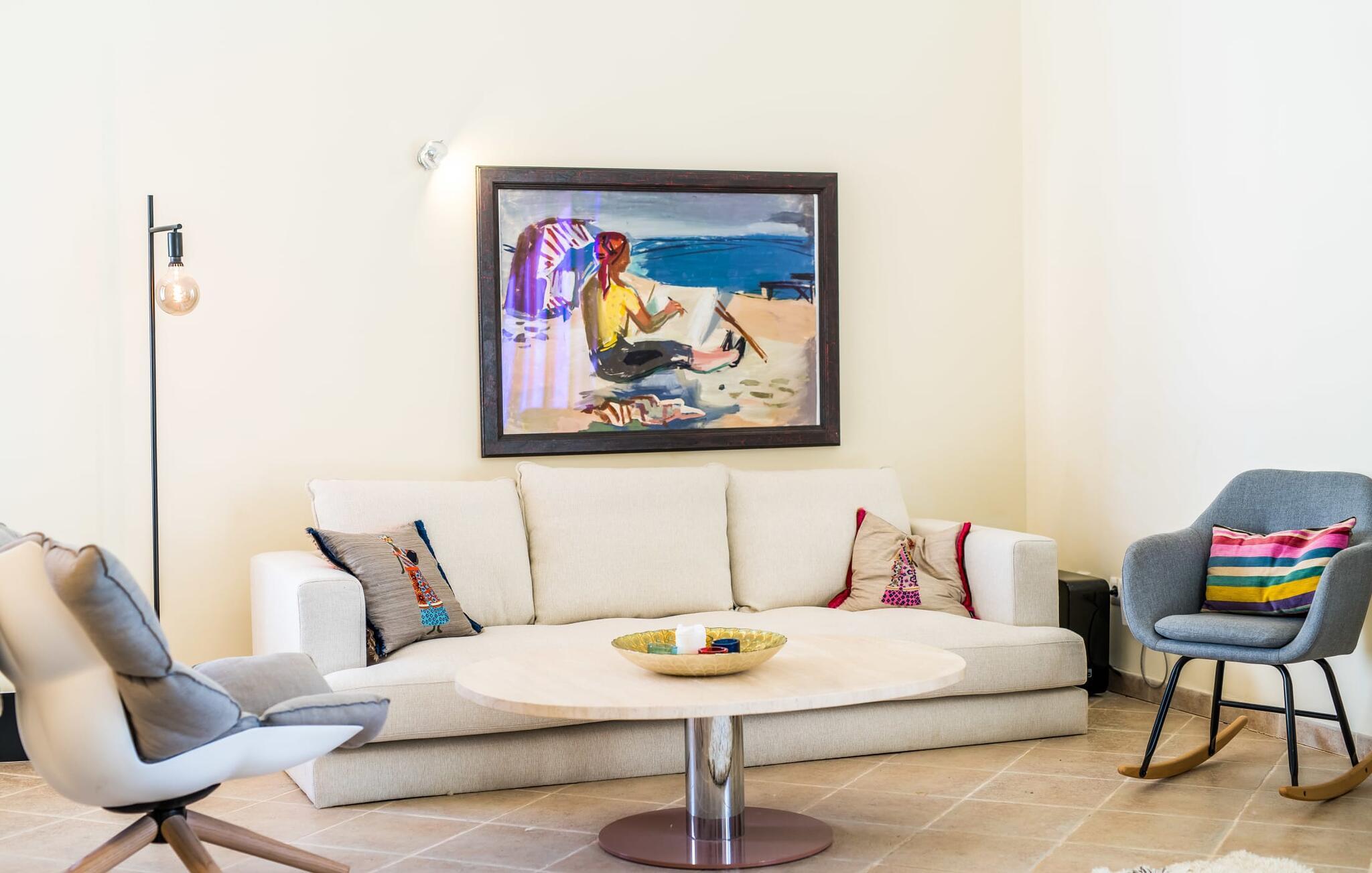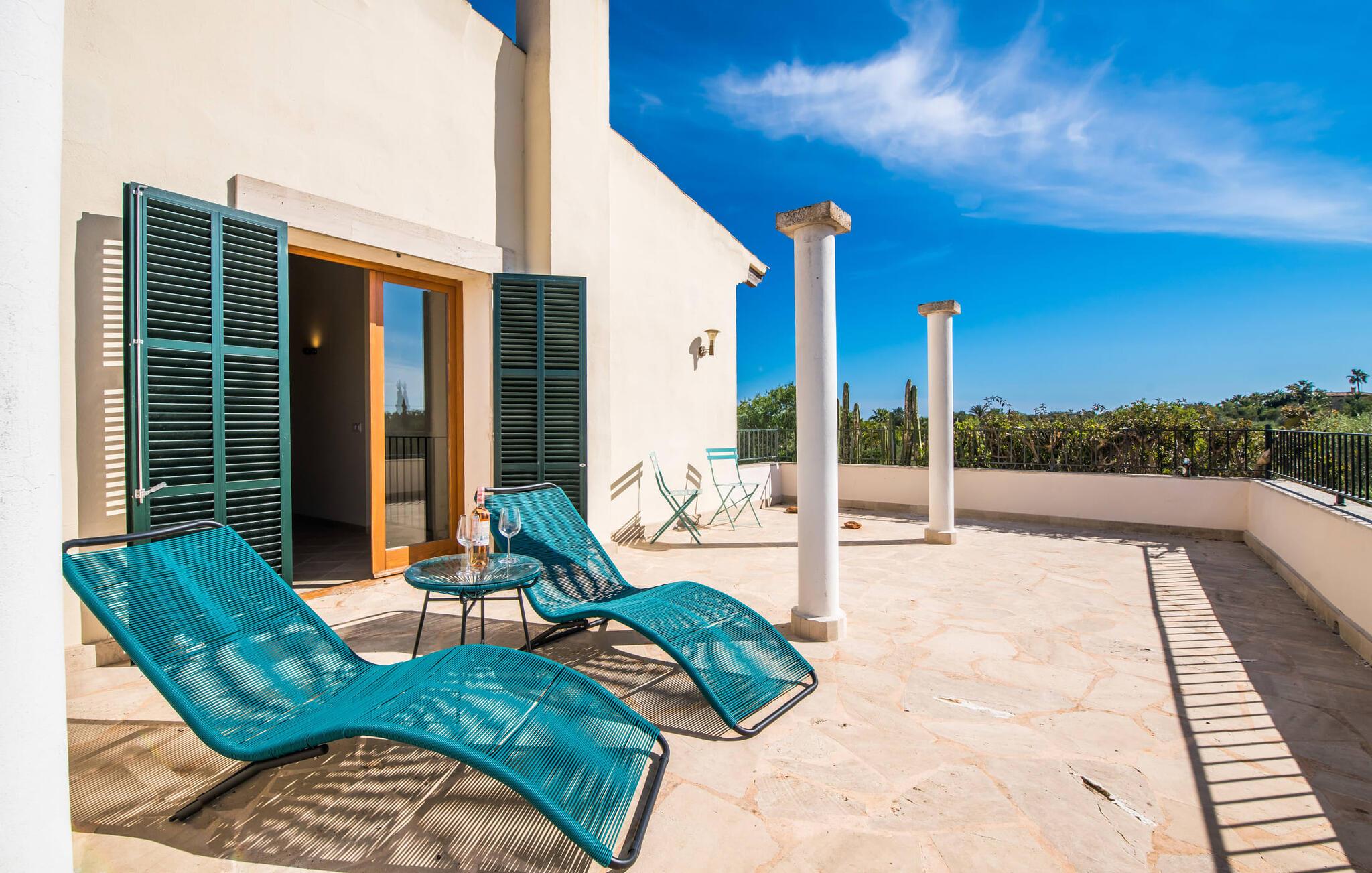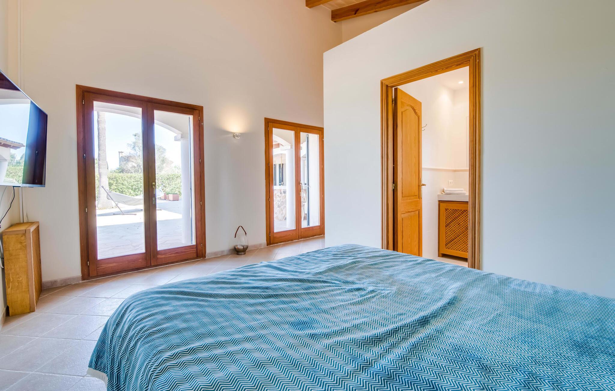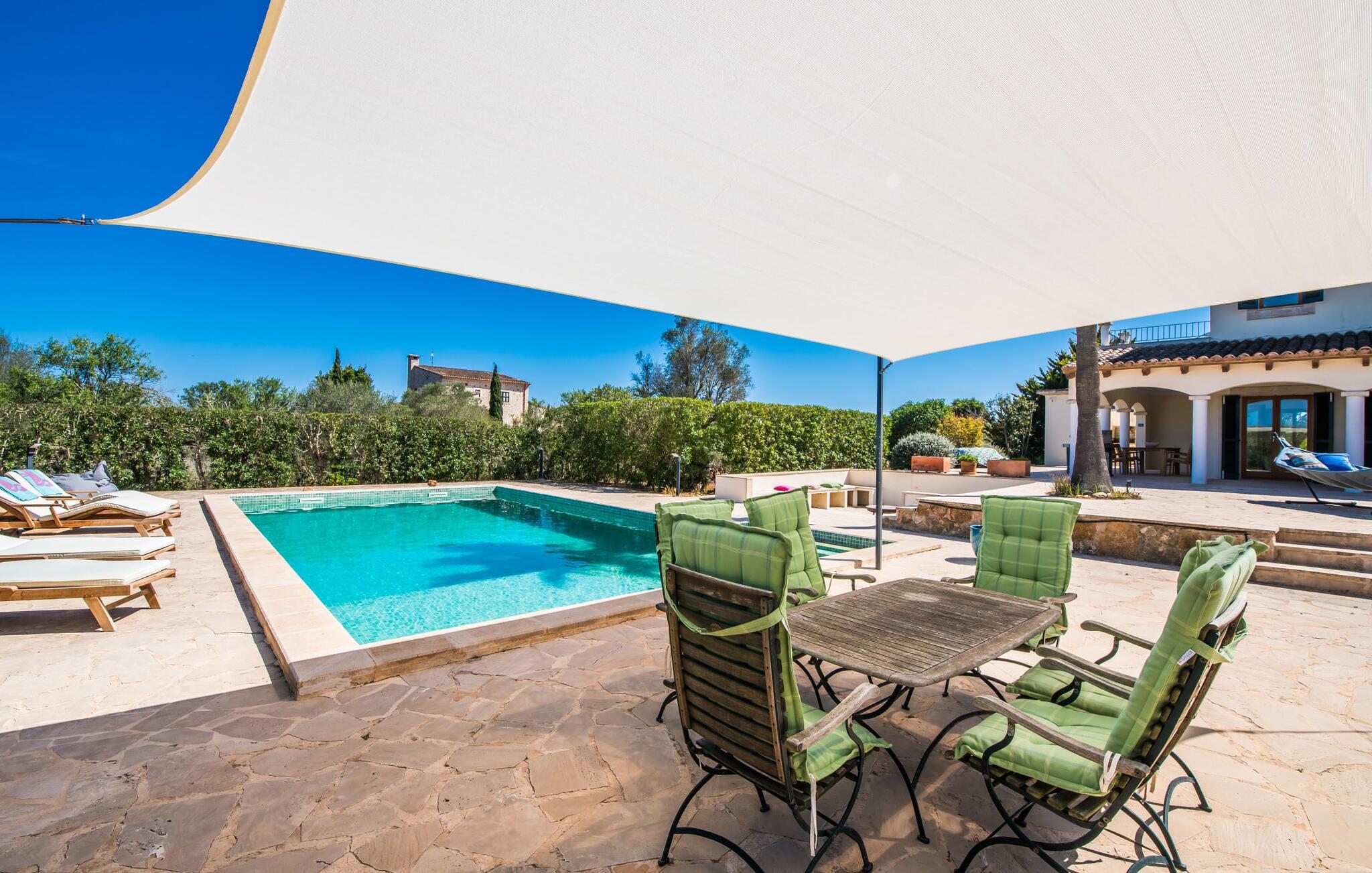 Velkommen til den sydlige del af Mallorca og til det smagfuldt højkvalitets bondehus "Roca del Rey" - tæt på kysten med smukke sandstrande med fremragende vandkvalitet og smukke byer som Santanyí og Felanitx, dvs. med en udsat beliggenhed. Naturskønheder som naturparken Mondragó eller saltmarkerne er uden sidestykke. Dette feriehus, som kan bookes hele året rundt, har en allé af palmer og er velegnet til 1-2 familier. Dette kan allerede ses på udendørsområdet ved den indhegnede pool med en imponerende poolstørrelse. Hele terrassearealet er udlagt med naturstensflader, indhegnet af grønne hække og beskyttet mod indsyn. Perfekt afslapning efter pooltid – ren luksus under det sejldækkede siddeområde eller på området to trin lavere med murstensbænke! I kan vælge andre yndlingssteder på udsatte eller overdækkede terrasser foran og bag huset - disse giver også mulighed for udendørs sport med fitnessudstyr til rådighed. Hvis I ikke vil være aktiv, kan I slappe af i hængekøjen eller hellige jer selv at tilberede måltider i ro og mag - der er en moderne grill i haven. Indretningen af det to-etagers feriehus med en generøs 375 m² tilbyder jer alternativer: Et af de en-suite badeværelser kan også hurtigt nås udefra. Derudover tilbyder det fuldt udstyrede køkken, som er adskilt fra det rummelige funktionelle opholds- og spiseområde med en disk, et godt alternativ til grillen. At lave mad sammen i sådanne behagelige premium-møbler kan også være en del af en afslappende ferie. Indretningen er venlig og lys med bløde farver i lyse toner. Komfort og hygge er meget vigtigt her – og ikke kun i pejsestuen, der er et par trin lavere. Når I booker denne usædvanligt velholdte feriebolig for op til seks personer, vil I opleve absolut komfort i tre dobbeltværelser med aircondition, hver med eget badeværelse og smart-tv. To er i stueetagen. Badeværelserne tilbyder også maksimal tilfredshed med brusekabiner. Fra den åbne foyer kan I se på tværs af galleriet til øverste etage - arkitektur, der forstår at imponere. Der vil I opdage master soveværelset med walk-in closet, et komplet badeværelse og to attraktive tagterrasser med den bedste udsigt. En ferie på Mallorca i "Roca des Rey" er en ferie i særklasse. Og hvornår bestiller du? Ferie i syd - det fantastiske og yderst familievenlige bondehus "Roca del Rey" imponerer med sit store pool- og terrasselandskab. Shopping, strandferie, vandreture i naturreservatet, golf – der er mange aktiviteter, der tilbydes. På grund af dens nærhed til Santanyí og bugten af samme navn, er placeringen af stuehuset næsten ideel. Takket være den optimale forbindelse til landevejen er rejsetiden til landsbyerne og strandene ca. 4-5 minutter.