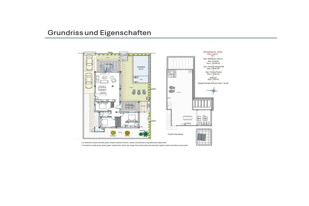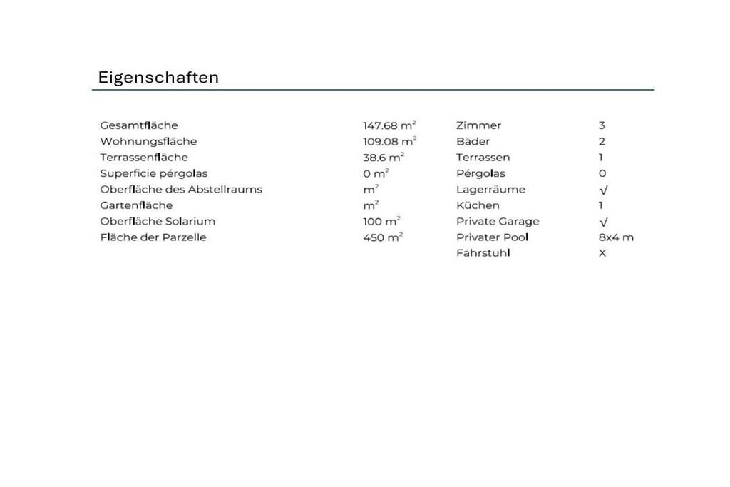 - Wohnzimmer mit Smart-TV - Küche (Ceranfeld, Ofen, Microwelle, Spülmaschine, Kühlschrank, Froster, Nespressomaschine) - 3 Schlafzimmer (maximal 6 Personen) - 2 Bäder - Klimaanlage, Waschmaschine und WLAN - Großer Poolbereich mit Lounge Sitzecke und Sonnenliegen - Grillplatz mit großem Tisch, 6 Stühlen und Gasgrill - Dachterrasse - 2 PKW Stellplätze (Zufahrt abschließbar) - Objekt ist security-überwacht - Umfangreiche Key-Holder Services vor Ort Bis auf eine Stufe im Eingangsbereich und der Treppe zur Dachterrasse ist das Objekt barrierefrei !!! Vermietung startet ab Juni 2024!!!
