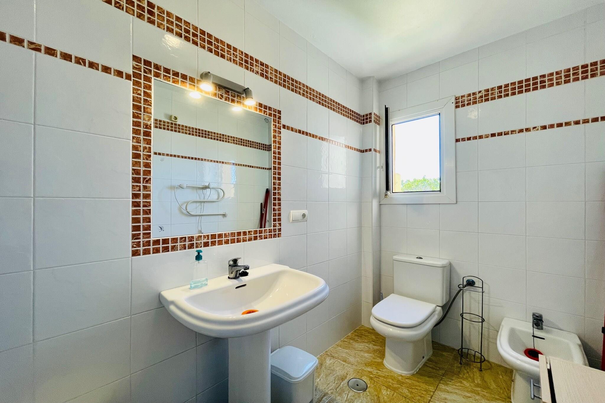 Stueetage: (Indgang (deles med andre gæster, adgang udefra)) På 1. etage: (Indgang , Køkken(kogeplade, elkedel, brødrister, emhætte, ovn, mikrobølgeovn, køle-fryseskab, Saftpresser), stue / spisestue(Fjernsyn(fladskærm, Internationale TV-kanaler), spisebord, sofahjørne), soveværelse(enkeltseng, enkeltseng), Soveværelse med badeværelse(dobbeltseng(135 x 190 cm), bruser, håndvask, toilet), badeværelse(badekar med bruser, håndvask, toilet), klimaanlæg, terrasse) garage, havedøre, have(deles med andre gæster, oplyst), havemøbler, swimmingpool(deles med andre gæster, udendørs, opened from Jun upto and including Sep)