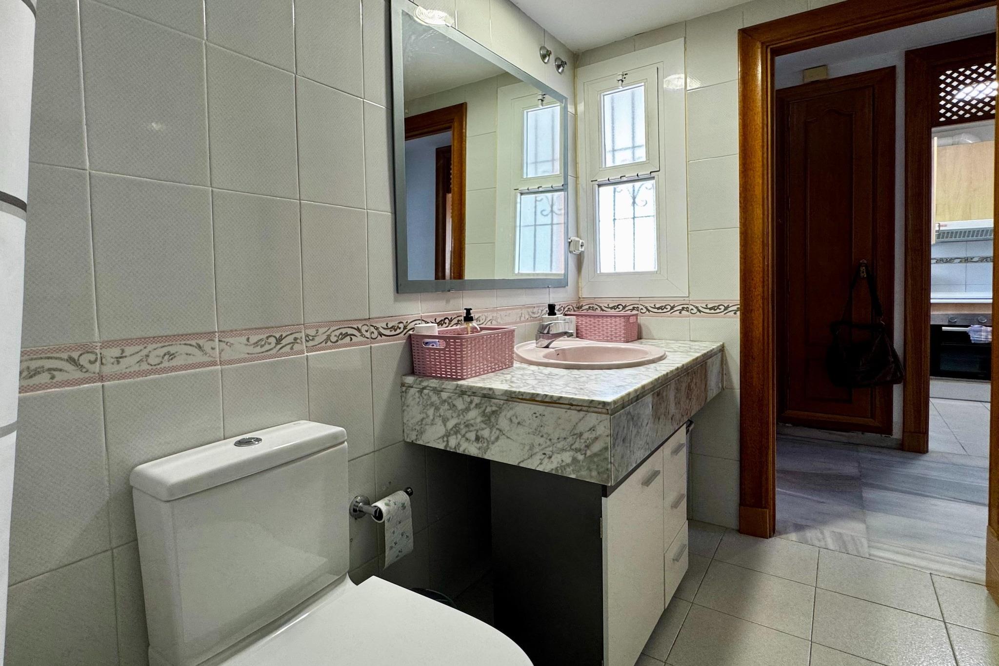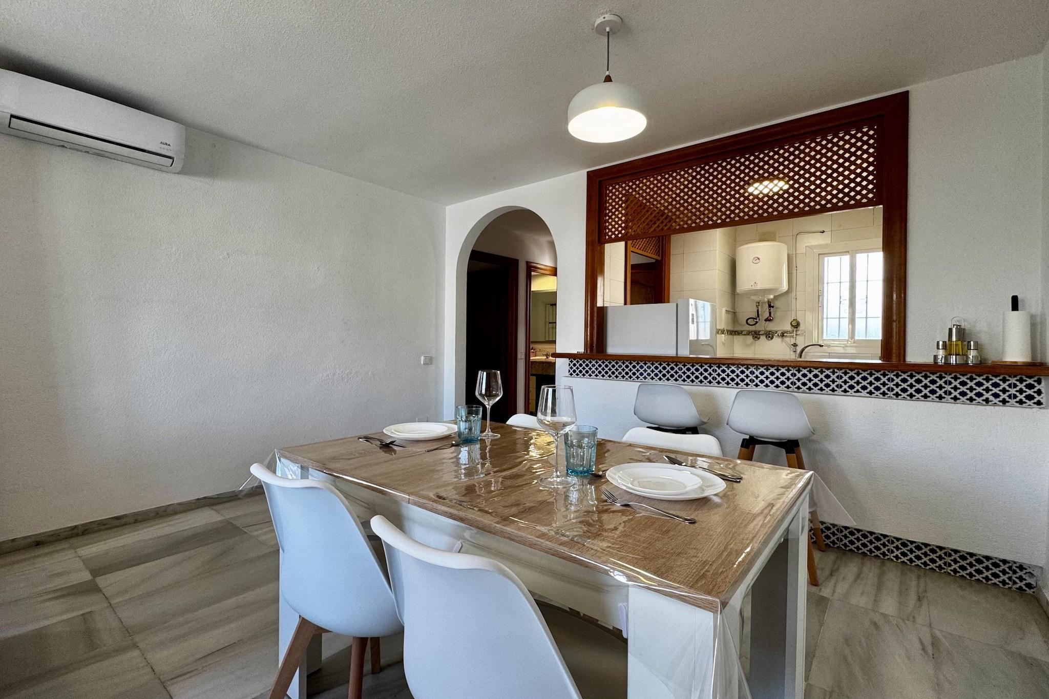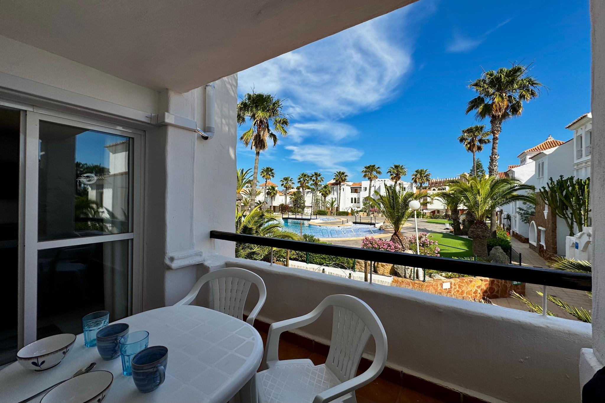 Nyd en afslappende ferie ved kysten i denne stilfulde lejlighed beliggende i hjertet af Poblado Golf Center, kun en kort gåtur fra den smukke Playa Serena. Omgivet af anlagte haver tilbyder dette charmerende tilflugtssted adgang til en fælles swimmingpool, en legeplads og åbne grønne områder, der er perfekte til både familier og par. Lejligheden er smagfuldt indrettet i moderne stil og er fuldt udstyret til både feriegæster og fjernarbejdere. Du finder højhastigheds-Wi-Fi, internationalt tv og et komfortabelt indendørs opholdsområde designet til både afslapning og produktivitet. Træd ud på den private terrasse, der er ideel til solrige morgenmader, videoopkald eller en aftendrink med fredfyldt udsigt over haven og poolen. Med en frisk kystbrise, der driver igennem, vil du måske aldrig forlade stedet. Inden for gåafstand kan du udforske det bløde sand ved Playa Serena og dens rolige promenade, eller spille tee på den nærliggende Playa Serena Golfklub, der ligger kun få minutter væk. Området byder også på en række restauranter, strandbarer og cykelstier, hvilket gør det nemt at udforske kystlinjen i dit eget tempo. For naturelskere er naturparken Punta Entinas-Sabinar kun en kort køretur væk, et paradis for fuglekiggeri, vandreture og uspolerede strande. Uanset om du søger sol, sport eller ro, tilbyder denne velbeliggende lejlighed den ideelle base for en uforglemmelig andalusisk ferie.