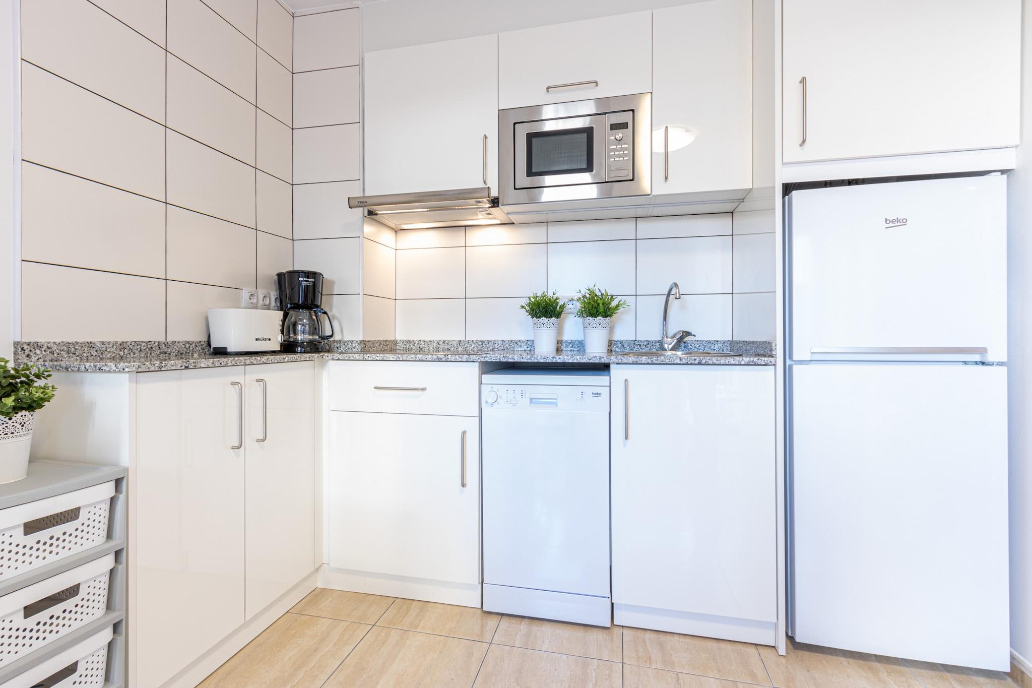 På 1. etage: (Stue(dobbeltsovesofa, Fjernsyn(parabol, Tyske TV-kanaler), klimaanlæg), åbent køkken(kogeplade(glaskeramisk), brødrister, kaffemaskine, mikrobølgeovn, opvaskemaskine , køleskab, vaskemaskine, ()), soveværelse(dobbeltseng), badeværelse(bruser, håndvask, toilet), Internetadgang) , Internetadgang, balkon, parkering, strygejern