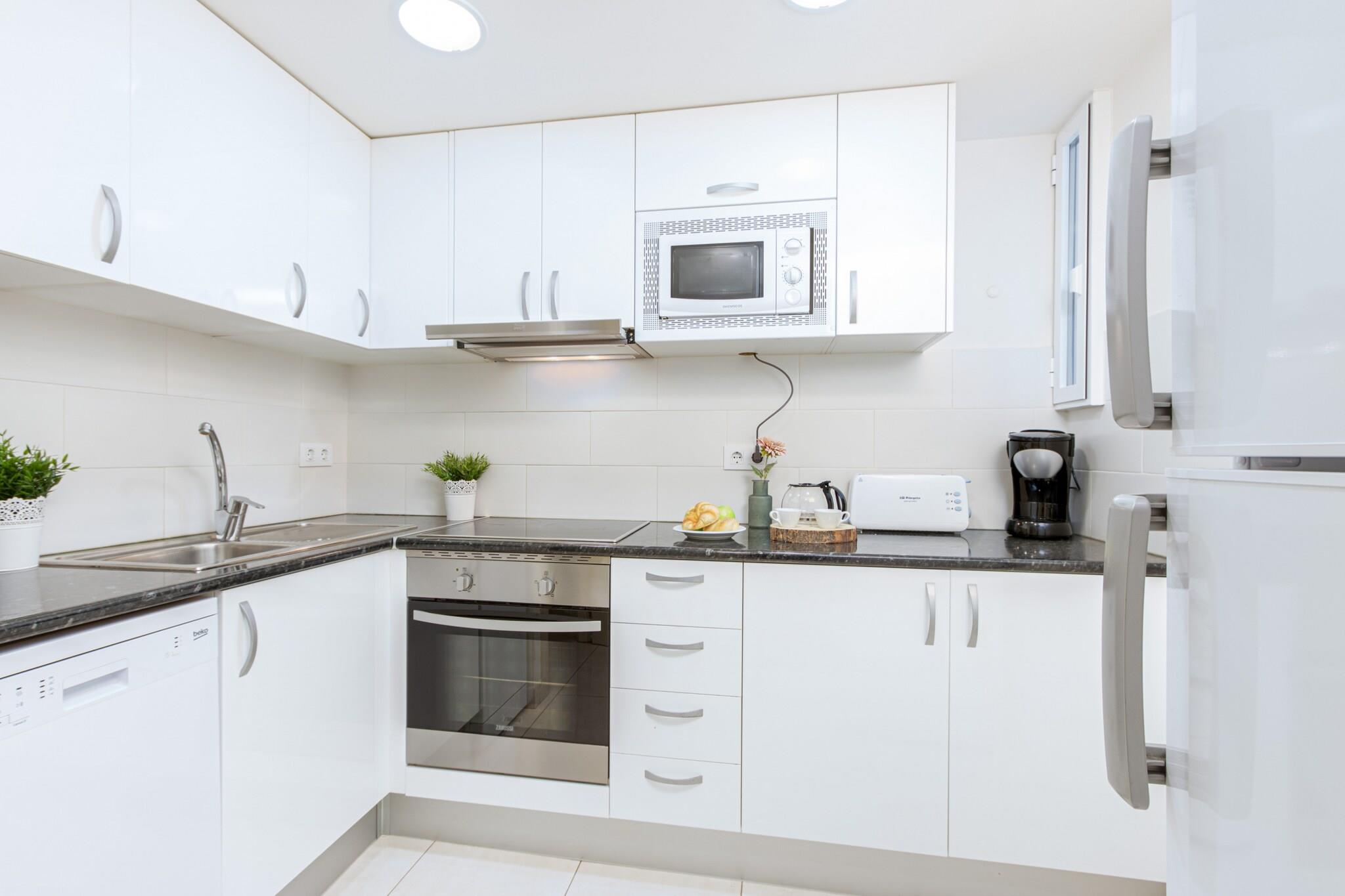 På 1. etage: (åbent køkken(brødrister, kaffemaskine, ovn, mikrobølgeovn, opvaskemaskine , køleskab, fryser, ), stue / spisestue(Fjernsyn, spisebord, sofahjørne), soveværelse(dobbeltseng), soveværelse(enkeltseng, enkeltseng), soveværelse(enkeltseng, enkeltseng), badeværelse(bruser)) vaskemaskine, balkon, varme(central), klimaanlæg, elevator, strygejern