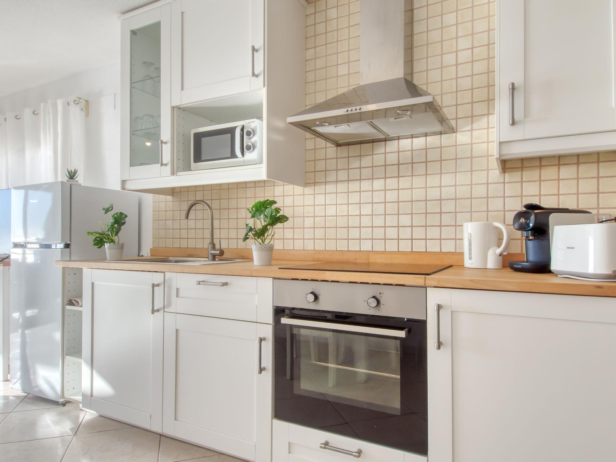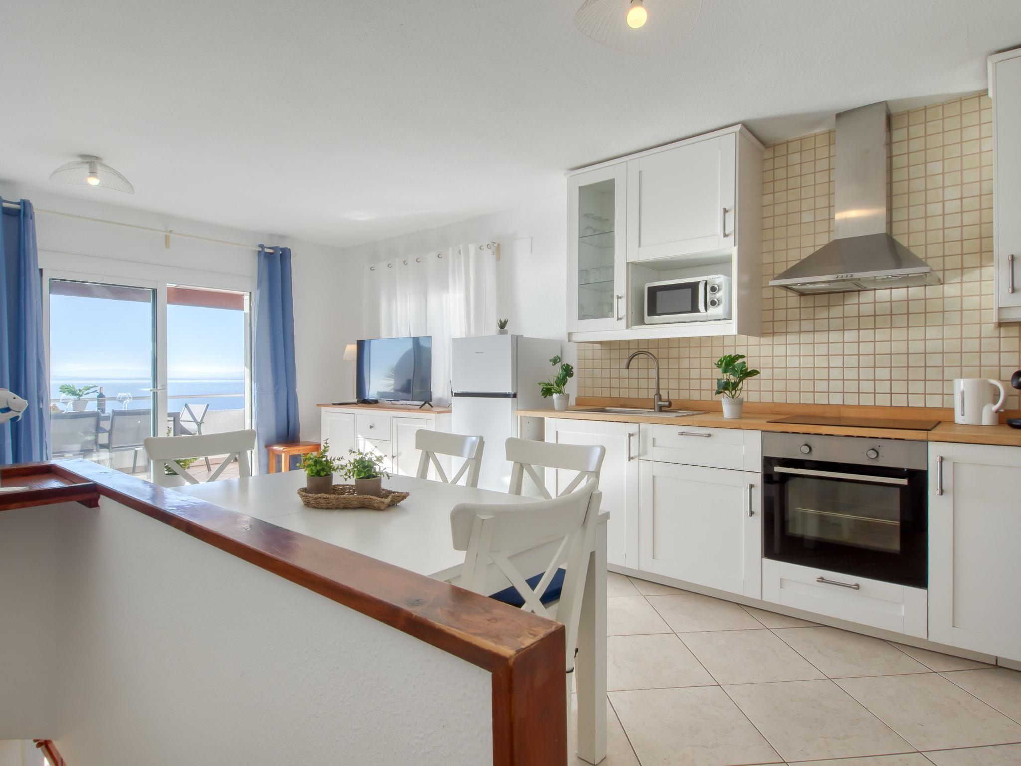 3-room terraced house 60 m2 on 2 levels. Bright, practical and cosy furnishings: living/dining room with dining table, satellite TV, air conditioning and forced-air heating. Exit to the terrace, south facing position and west facing position. Open kitchen in the entrance (oven, 4 ceramic glass hob hotplates, toaster, kettle, microwave, freezer, electric coffee machine). On the lower ground floor: 1 room with 1 french bed (150 cm, length 190 cm), electric heater and fan. Exit to the terrace. 1 room with 2 beds (90 cm, length 190 cm). Shower/WC. Terrace 15 m2. Terrace furniture. Marvellous panoramic view of the sea and the mountains. Facilities: washing machine, iron, hair dryer. Internet (WiFi, free). Parking space n 29. Please note: non-smokers only. TV only ES, FR. No lift. 60 steps to access the dwelling. HUTG-020465 // Reg. Nr.: ESFCTU00001701900004864600000000000000HUTG-020465-953