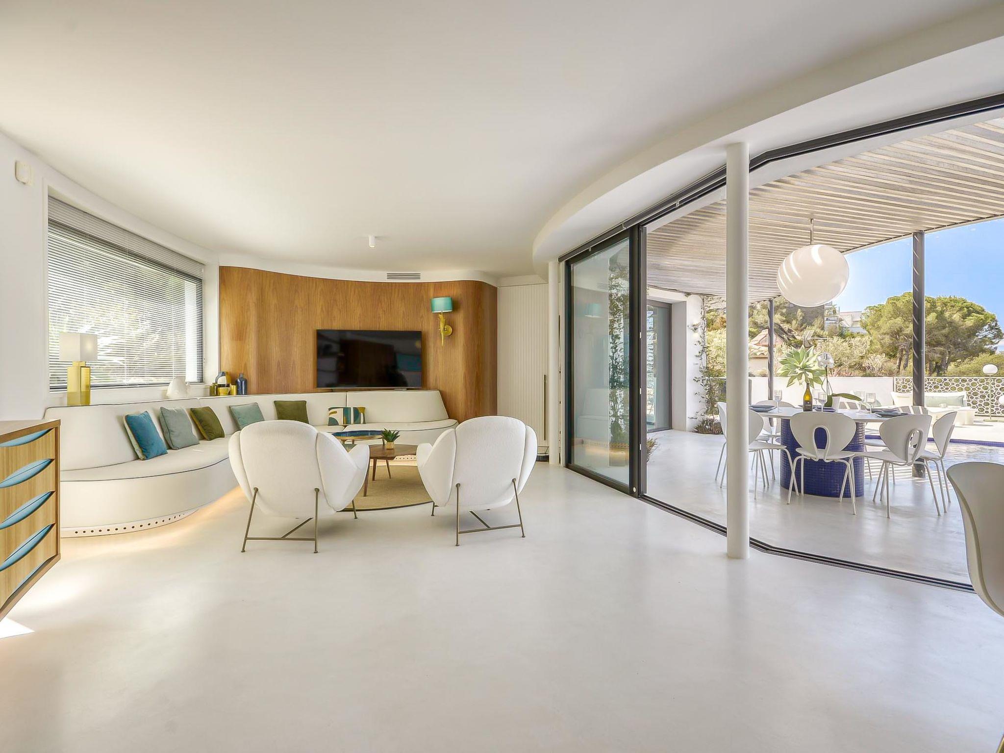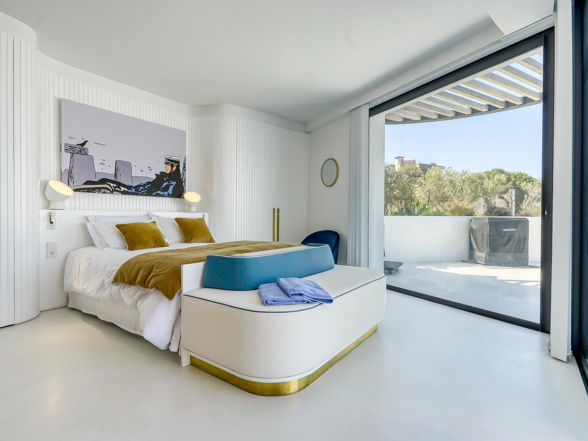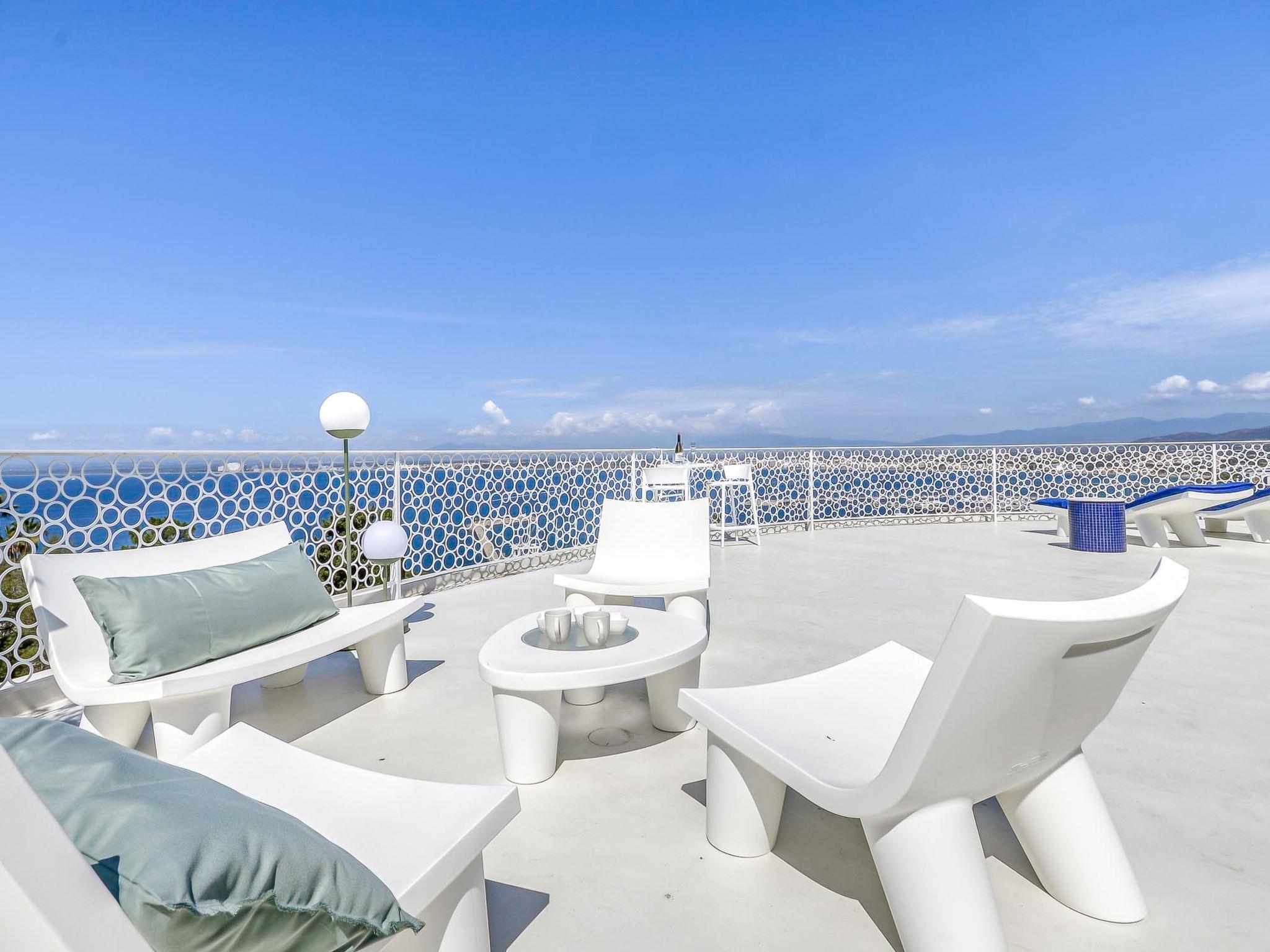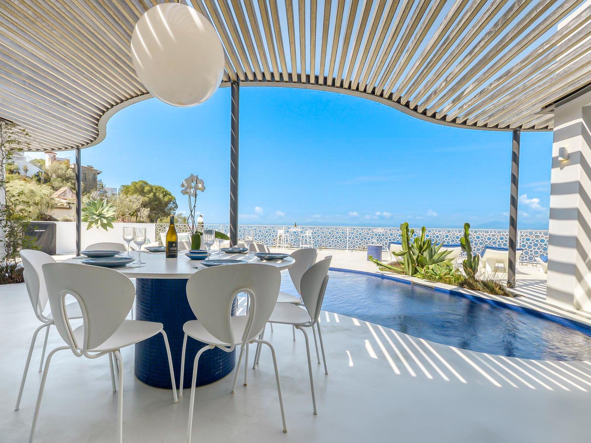 5-room villa 280 m2 on 2 levels, south-west facing position. Spacious, fully renovated, very modern and stylish furnishings: upper floor: 1 room with 1 french bed (160 cm, length 200 cm), shower/WC, air conditioning and forced-air heating. Exit to the balcony. 1 room with 1 french bed (160 cm, length 200 cm), shower/WC, air conditioning and forced-air heating. Exit to the balcony. 1 large room with 1 french bed (160 cm, length 200 cm), shower/WC, air conditioning and forced-air heating. Exit to the balcony. Sep. WC. 2nd upper floor: (spiral staircase) open living/dining room with satellite TV, air conditioning and forced-air heating. Exit to the terrace, to the swimming pool, south facing position and west facing position. 1 large room with 1 french bed (160 cm, length 200 cm), shower/WC, air conditioning and forced-air heating. Exit to the terrace, to the swimming pool. Open kitchen (oven, dishwasher, 3 induction hot plates, toaster, kettle, microwave, freezer, electric coffee machine, Capsules for coffee machine (Nespresso), cooking island). Large terrace. Terrace furniture, deck chairs (4). Marvellous panoramic view of the sea. Facilities: washing machine, dryer, iron, children's high chair, baby cot, hair dryer. Internet (WiFi, free). Garage (2 cars). Please note: non-smoking house. TV only FR. Please note: Wi-Fi only on the main floor. HUTG-066989-563 // Reg. Nr.: ESFCTU00001701900022265700000000000000HUTG-066989-563