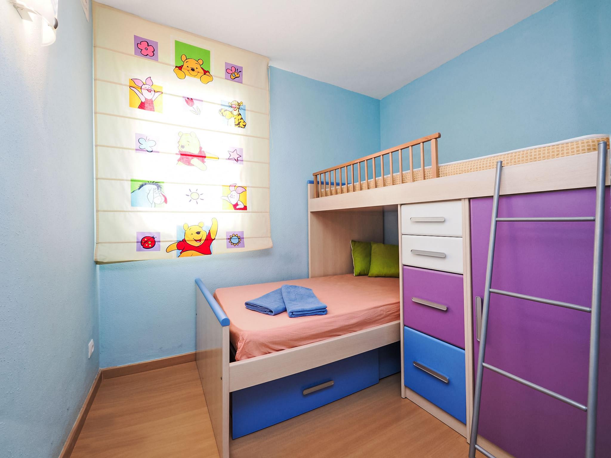 3-room apartment 57 m2 on 4th floor. Bright, practical furnishings: living/dining room with 1 sofabed and TV. Exit to the balcony. 1 room with 1 french bed (150 cm). 1 children's room with 1 x 2 bunk beds (90 cm, length 180 cm). Open kitchen (oven, 2 ceramic glass hob hotplates, microwave, freezer, electric coffee machine) with bar. Bath/shower/WC. Heating, air-conditioning, forced-air heating. Upper floor: (steep stair). Exit to the terrace. Balcony 9 m2, large terrace 60 m2. Terrace furniture, deck chairs. View of the swimming pool, the garden and the countryside. Facilities: washing machine. HUTG049162 // Reg. Nr.: ESFCTU00001701900039236700000000000000HUTG-049162-334