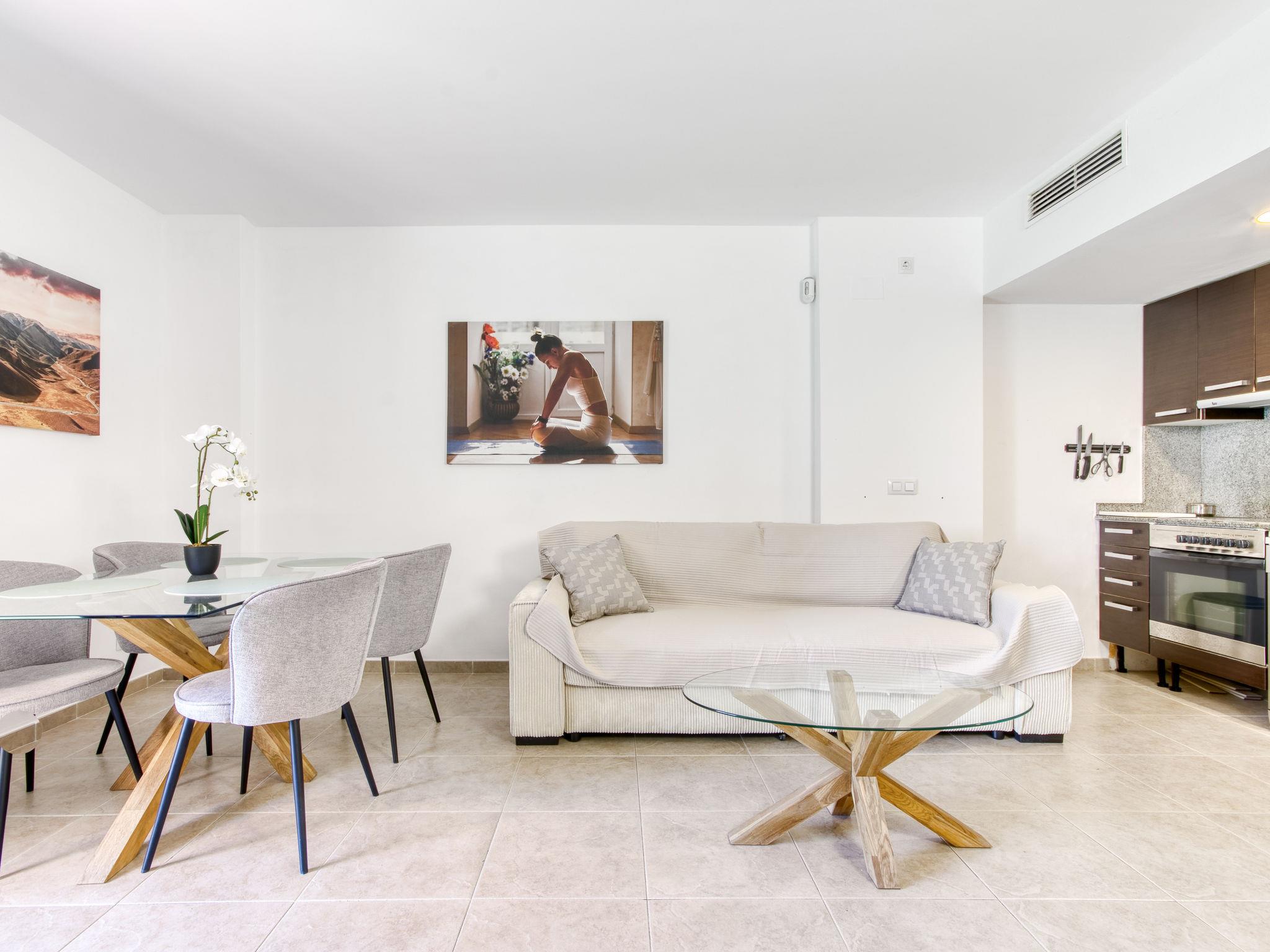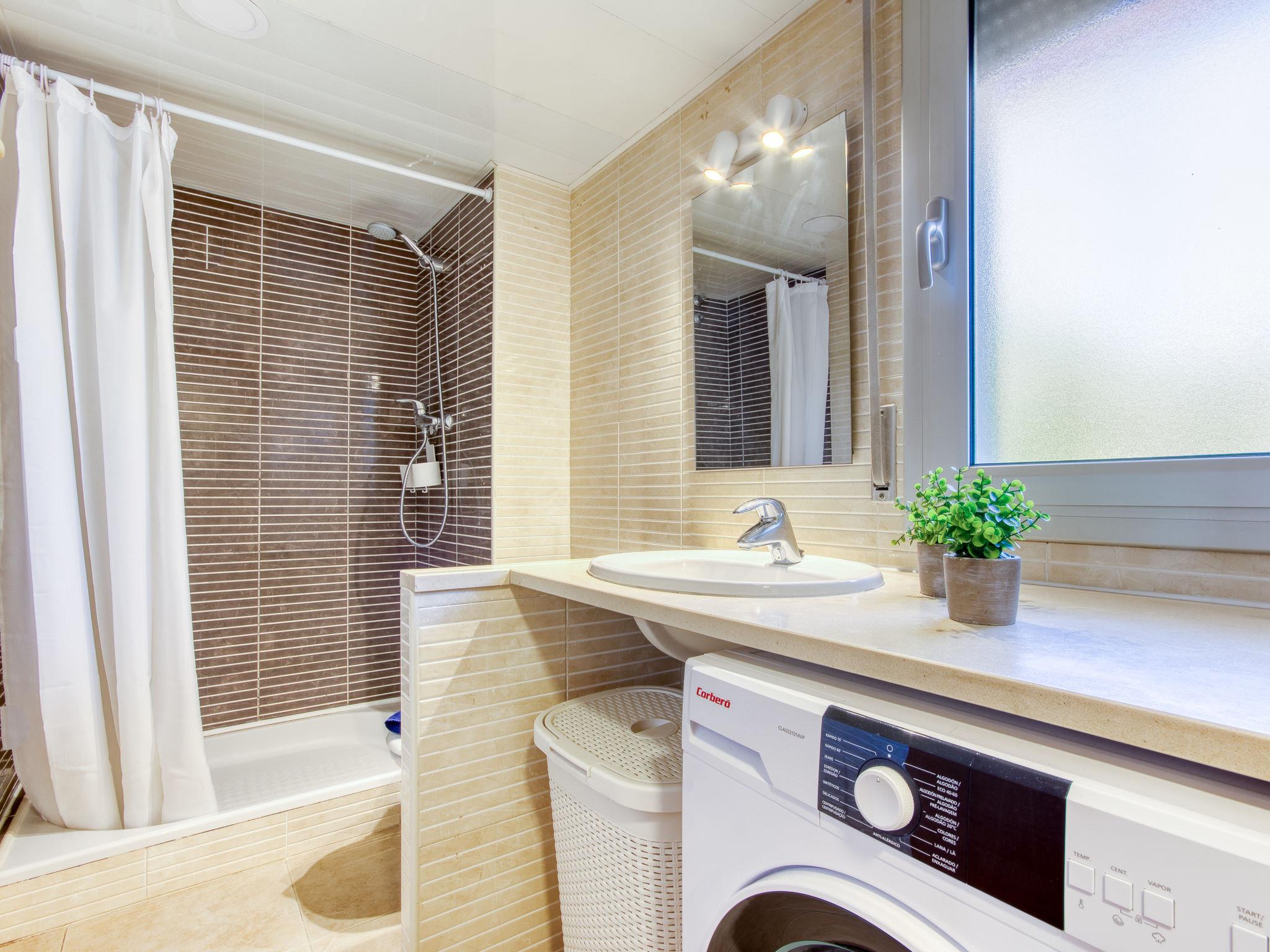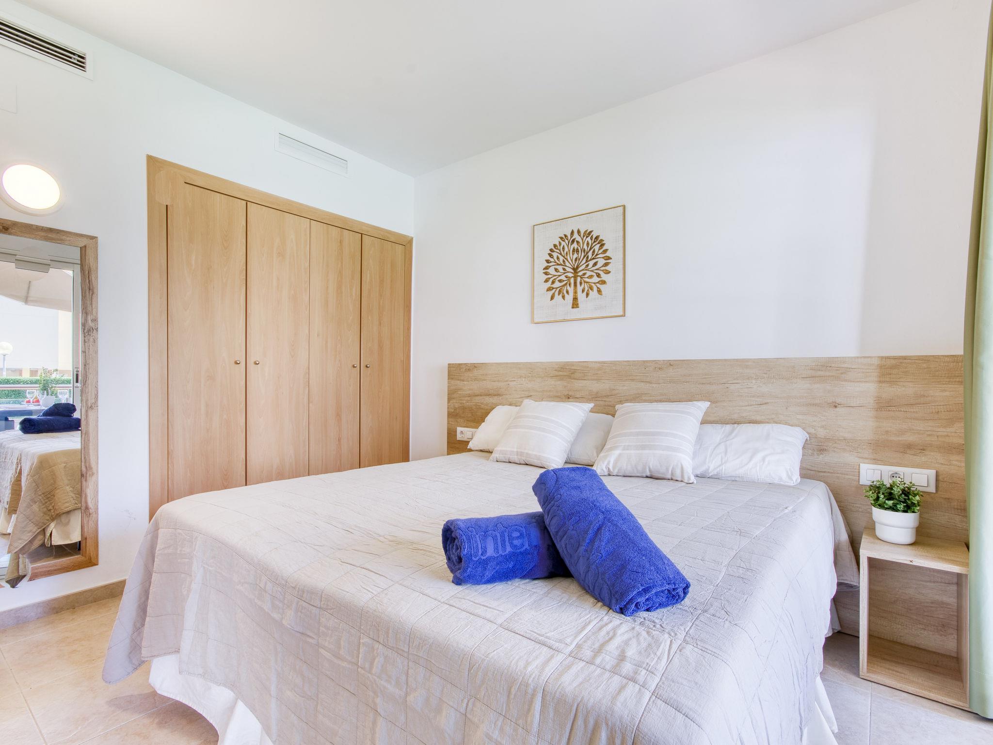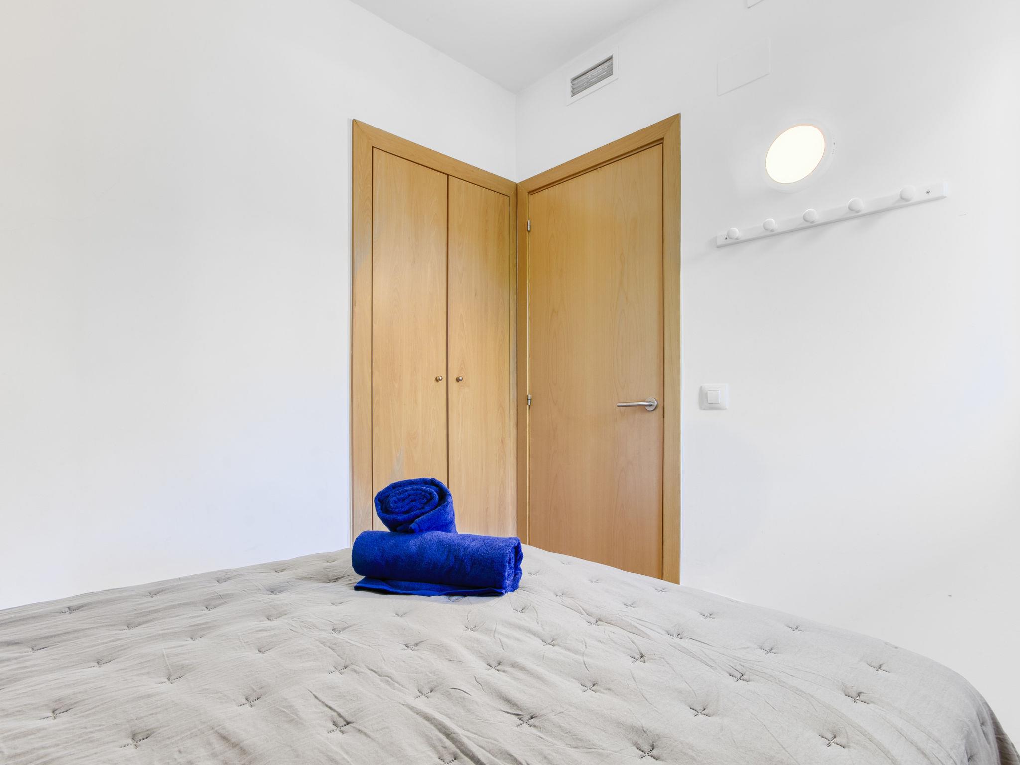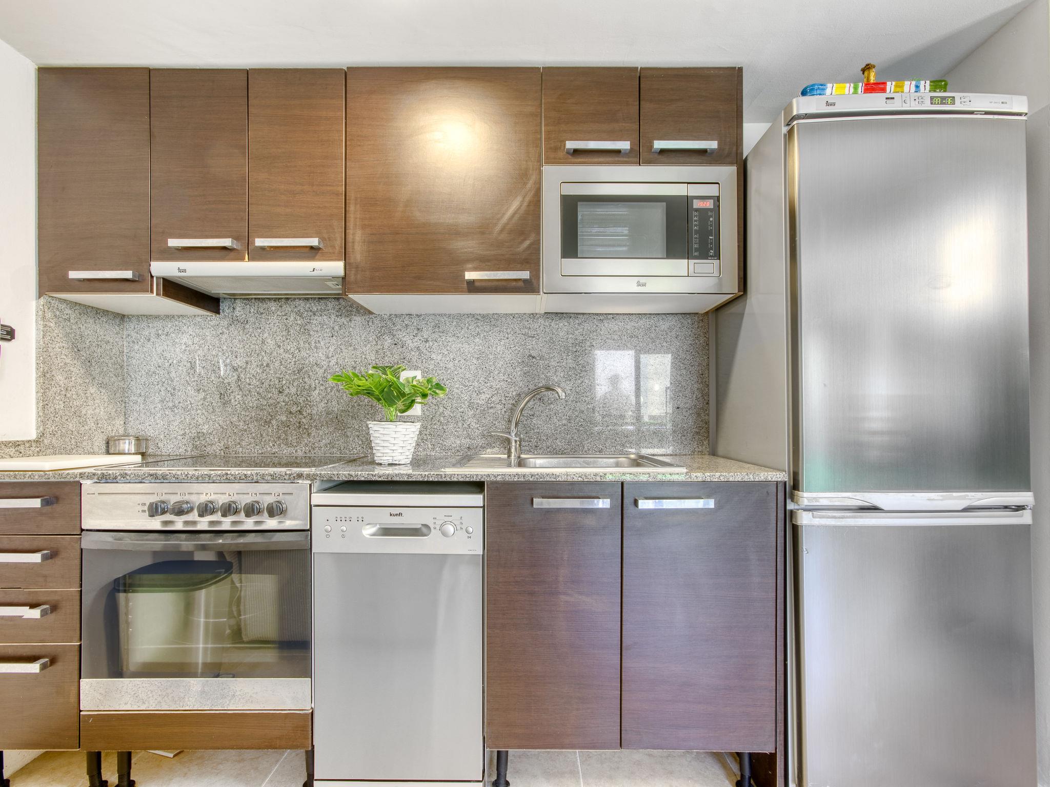 3-room apartment 56 m2, on the ground floor. Spacious and bright: living/dining room with dining table, TV, air conditioning and forced-air heating. Exit to the terrace, south facing position and west facing position. 1 room with 1 french bed (150 cm, length 190 cm), air conditioning and forced-air heating. 1 room with 1 french bed (150 cm, length 190 cm), air conditioning and forced-air heating. Open kitchen (oven, dishwasher, 4 ceramic glass hob hotplates, toaster, kettle, microwave, freezer, electric coffee machine). Shower/WC. Terrace. Terrace furniture. View of the swimming pool and the garden. Facilities: washing machine. Internet (WiFi, free). Parking space n 121 (roofed). Please note: non-smokers only. TV only ES, FR. HUTG-012219 // Reg. Nr.: ESFCTU00001701900037925200000000000000000HUTG-0122194