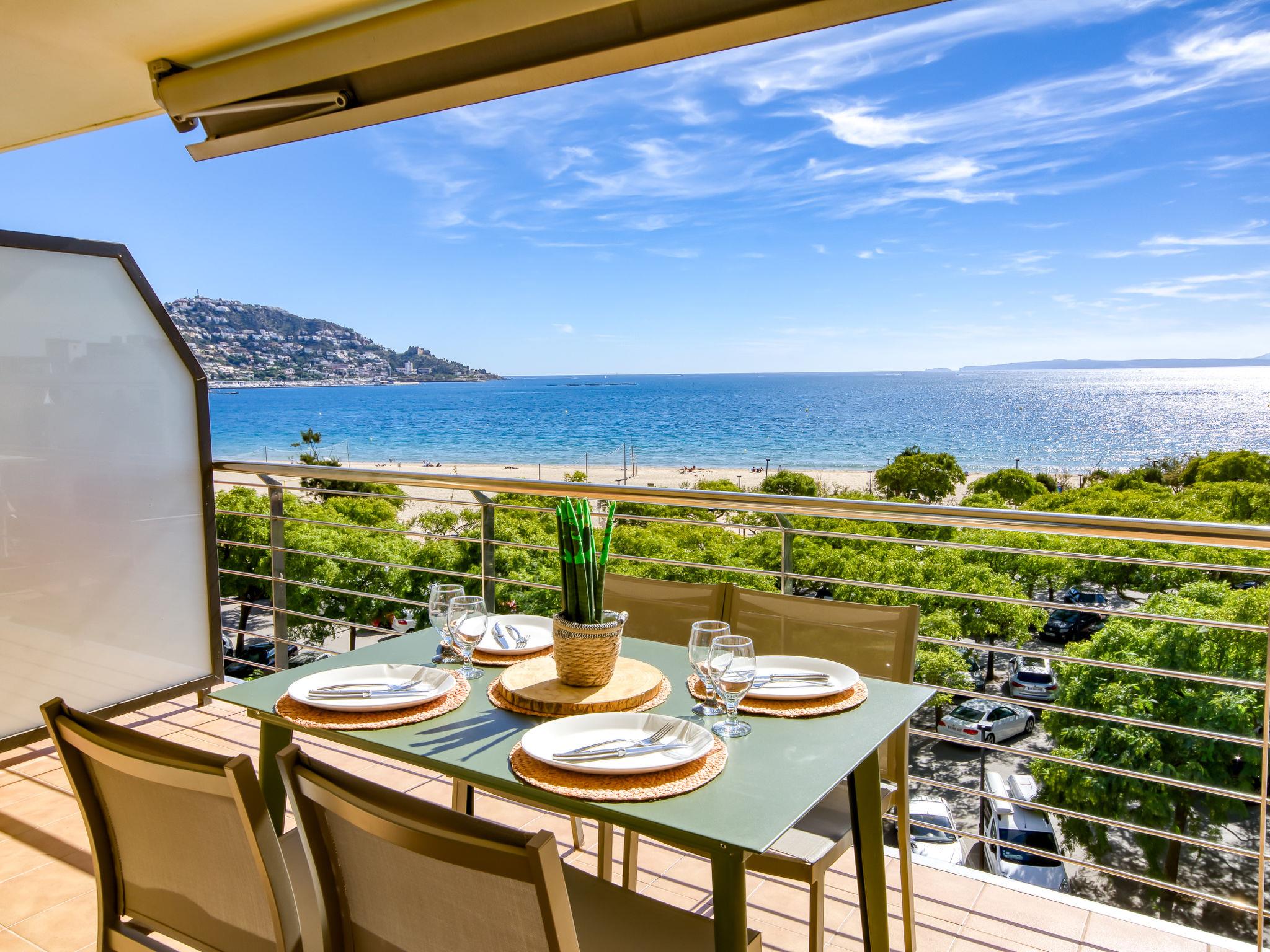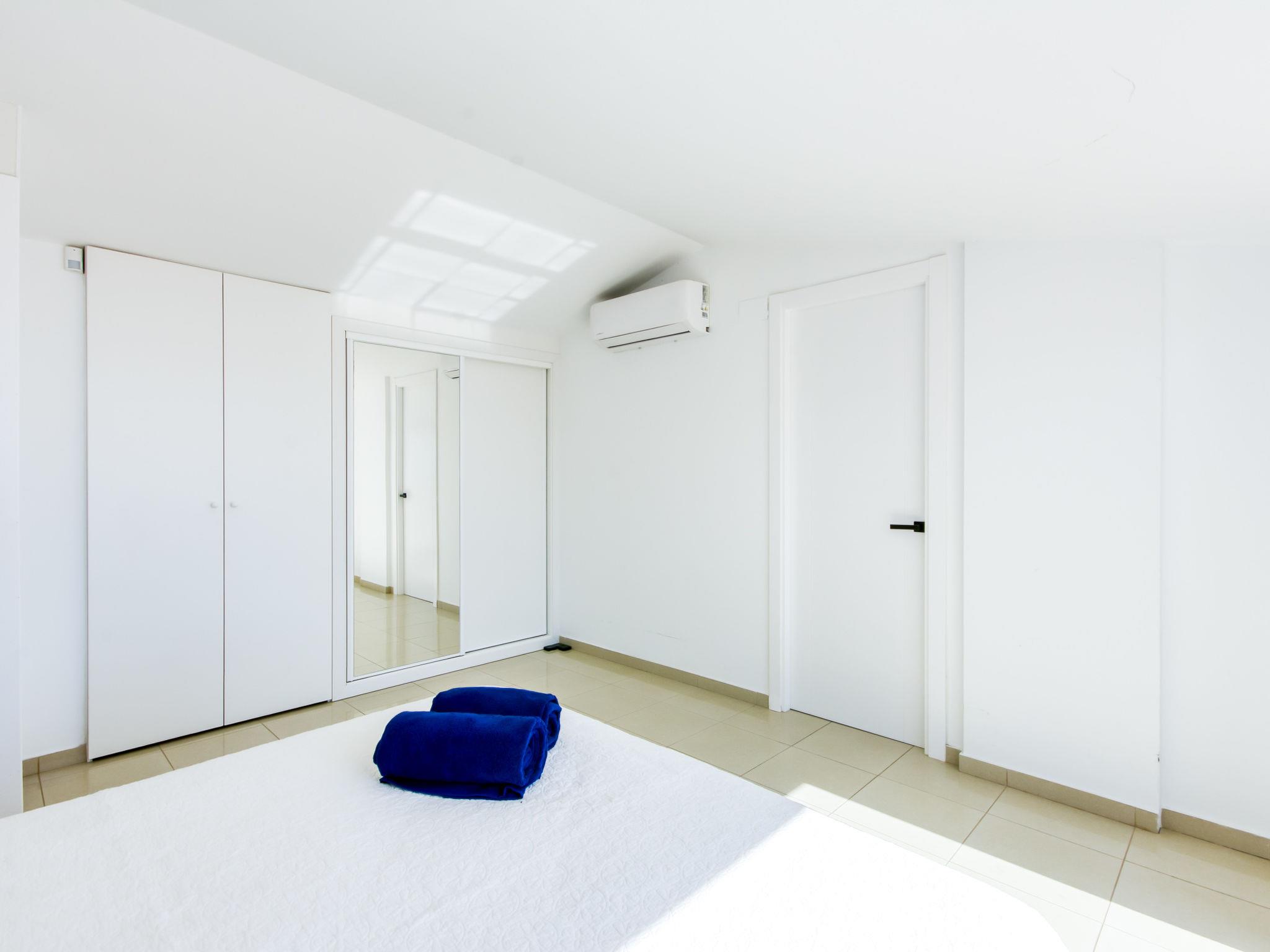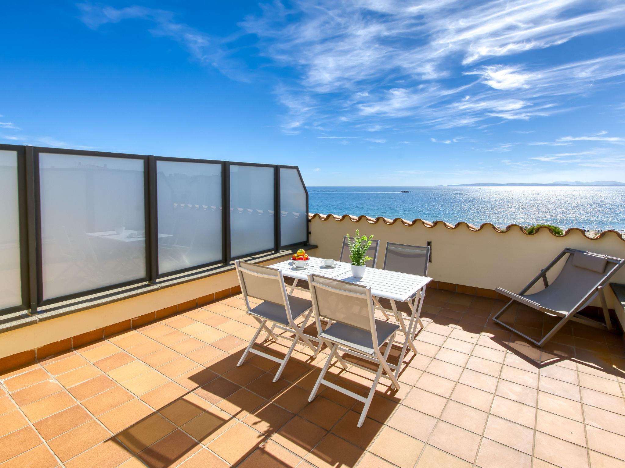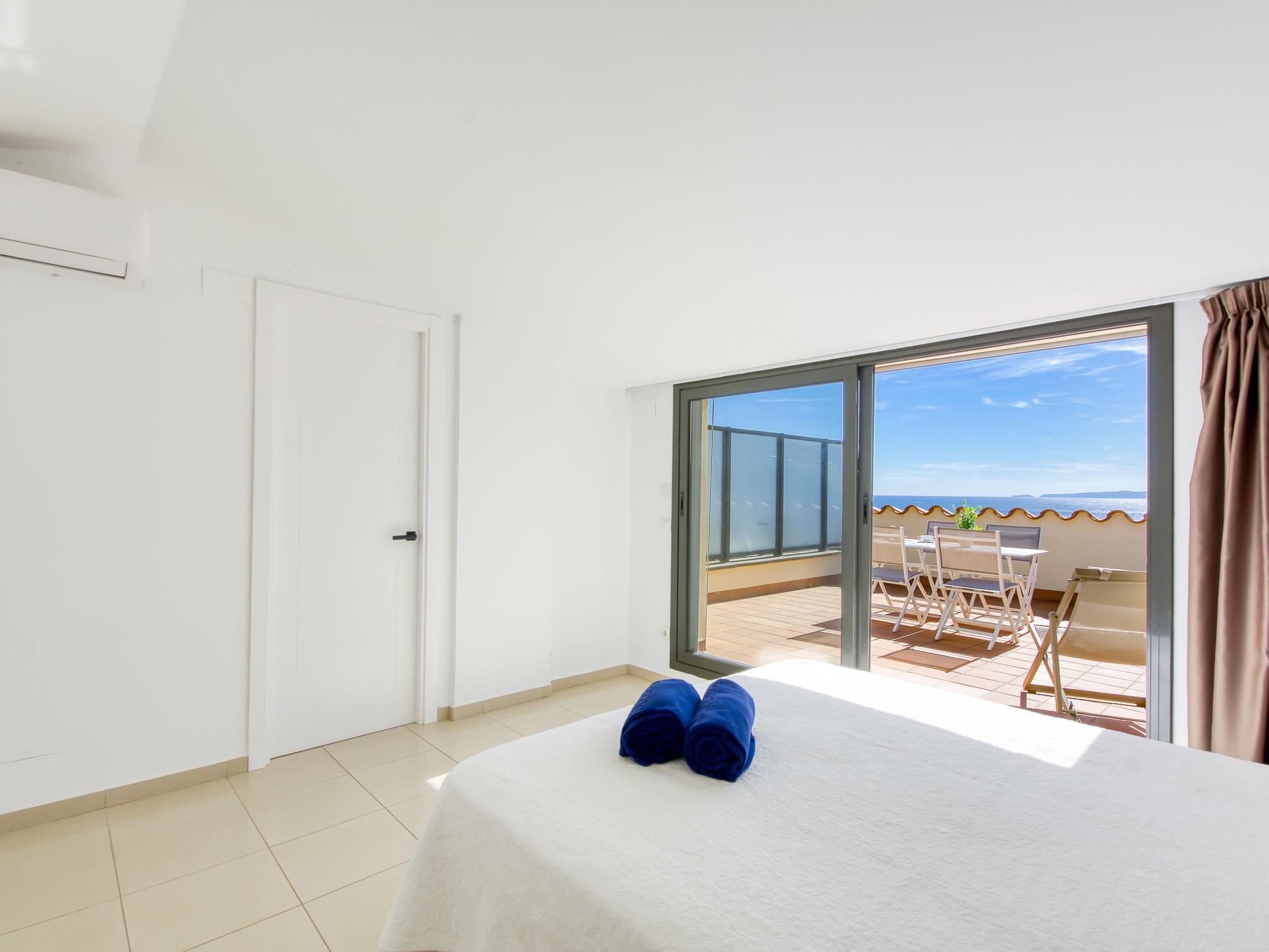 3-room apartment 70 m2 on 2 levels on 4th floor, south facing position. Spacious and bright, modern and cosy furnishings: living/dining room with dining table, satellite TV and digital TV (flat screen), air conditioning. Exit to the terrace, south facing position and west facing position. 1 room with 1 french bed (160 cm, length 190 cm). Kitchen (oven, dishwasher, 4 ceramic glass hob hotplates, microwave, freezer, electric coffee machine). Bath/WC. No heating option. Upper floor: 1 large room with 1 bed (90 cm, length 190 cm), 1 french bed (160 cm, length 190 cm), bath/WC. Exit to the terrace. Large balcony 15 m2, south facing position and west facing position, large terrace 20 m2, south facing position and west facing position. Terrace furniture. Marvellous panoramic view of the sea. Facilities: washing machine, iron. Internet (WiFi, free). Garage space n 73. Please note: TV only FR, ES. Animals are not accepted in the pool or in community areas. HUTG013467 // Reg. Nr.: ESFCTU000017019000011589000000000000000000HUTG0134675