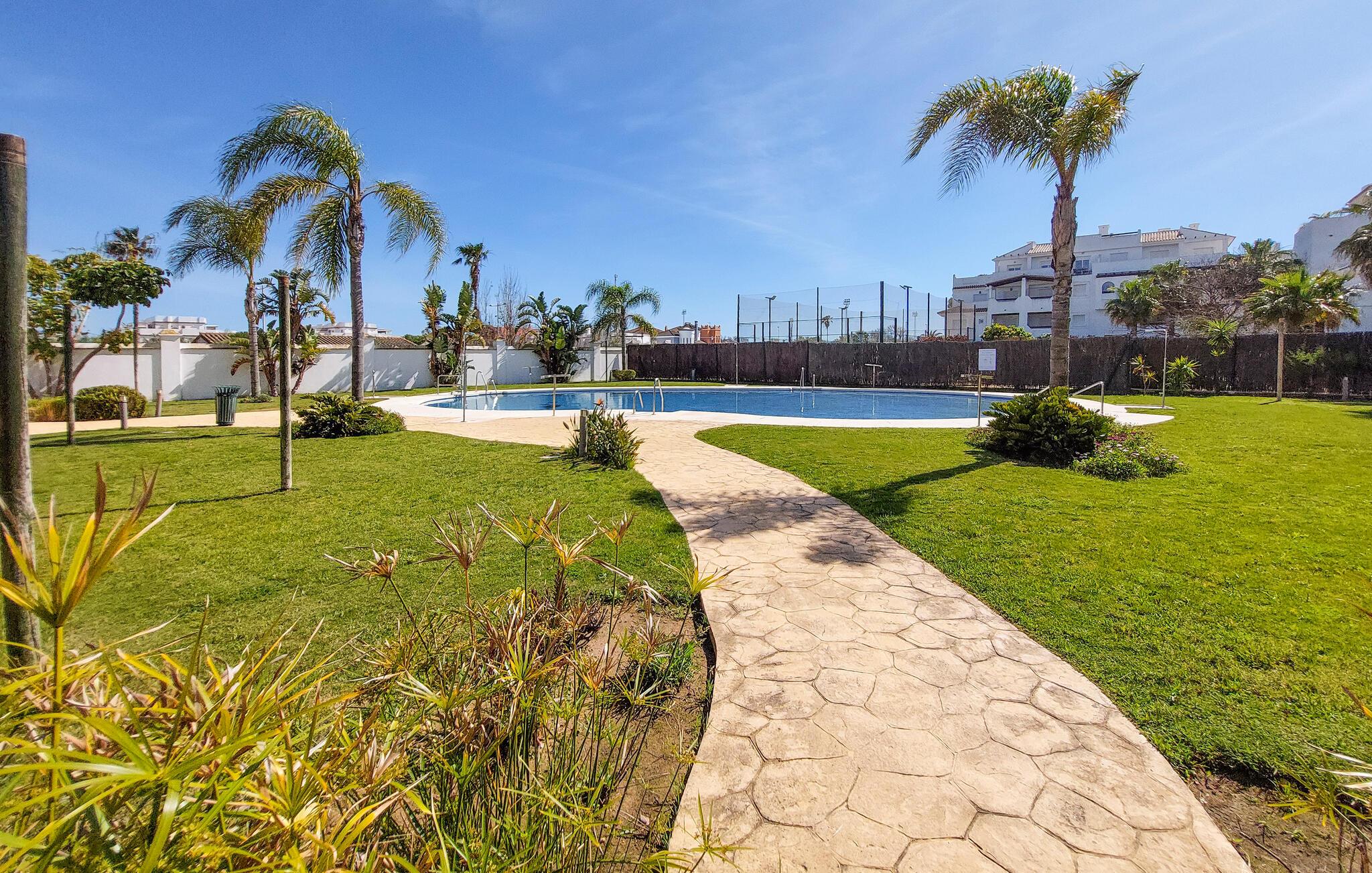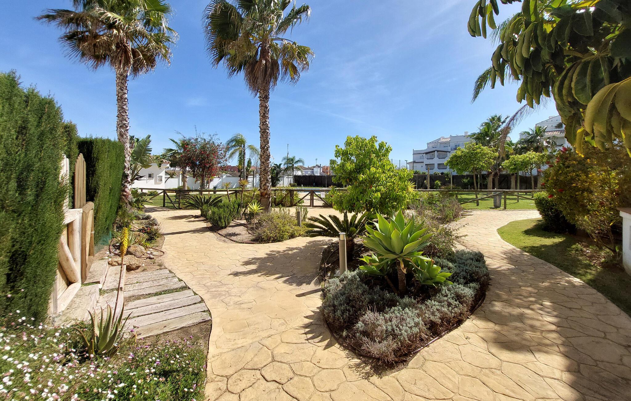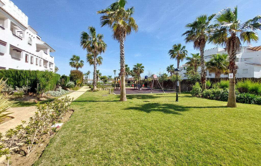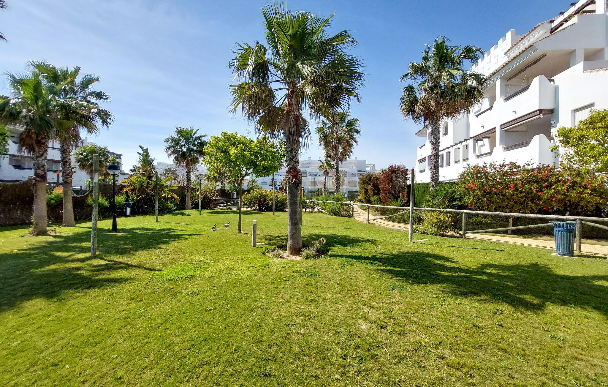 Gå en tur udenfor i skyggen af palmer, nyd solen ved poolen, og tag en forfriskende dukkert i det klare vand, lige når I har lyst. Og så er der kun få skridt ned til stranden. I nærheden af jeres lejlighed kan I spille golf og udforske flere gamle kirker samt fæstningen Castillo de Luna i Rota.