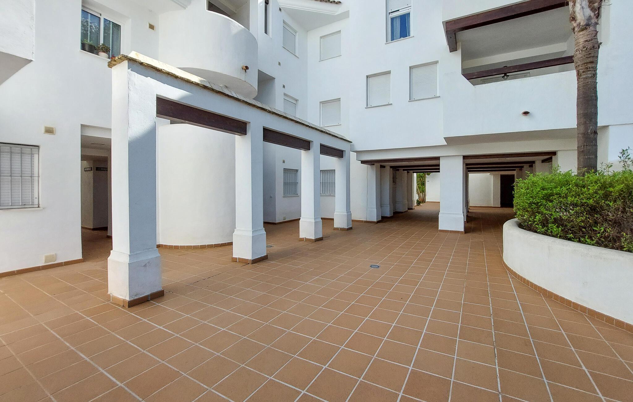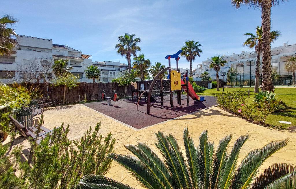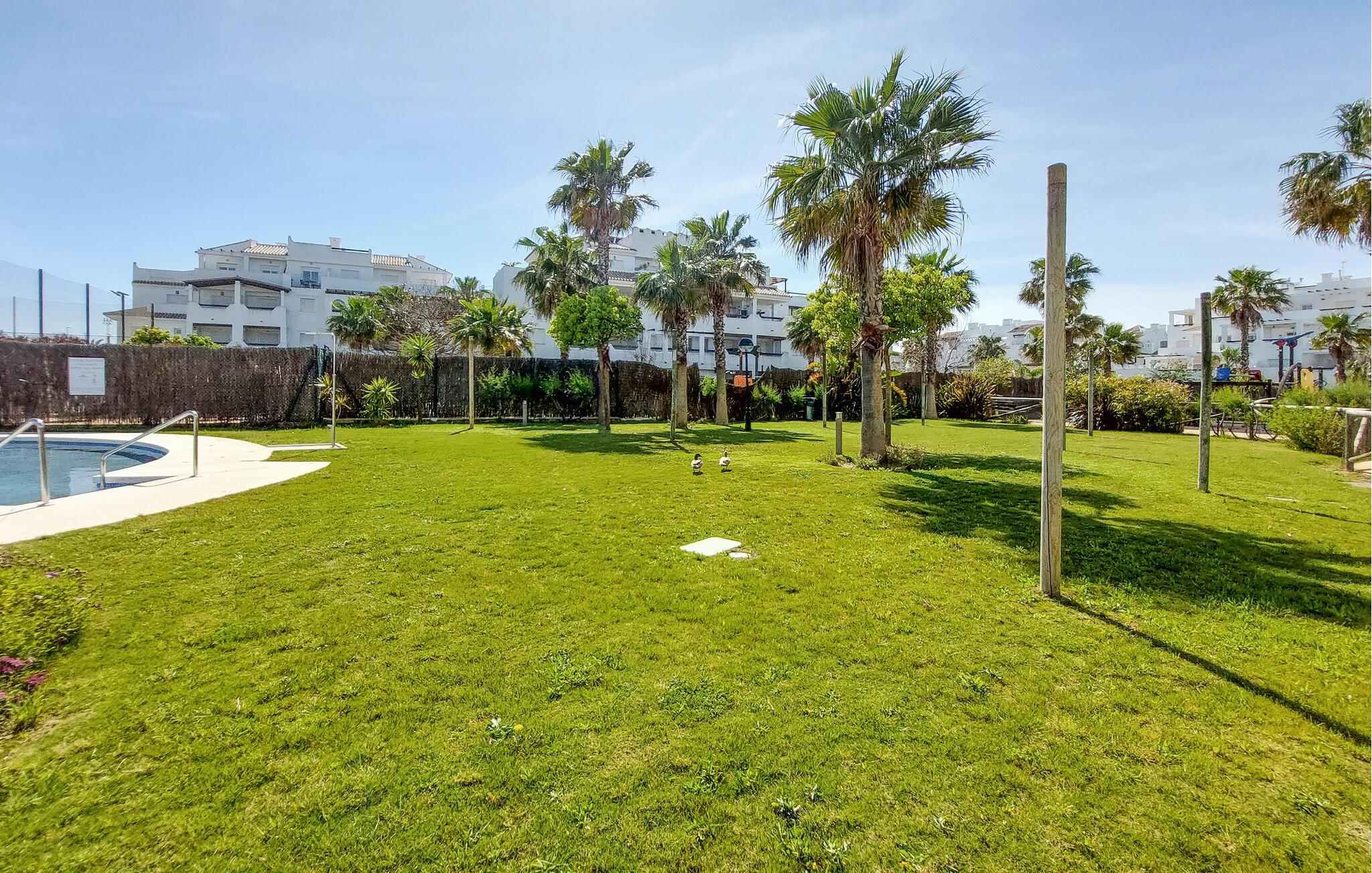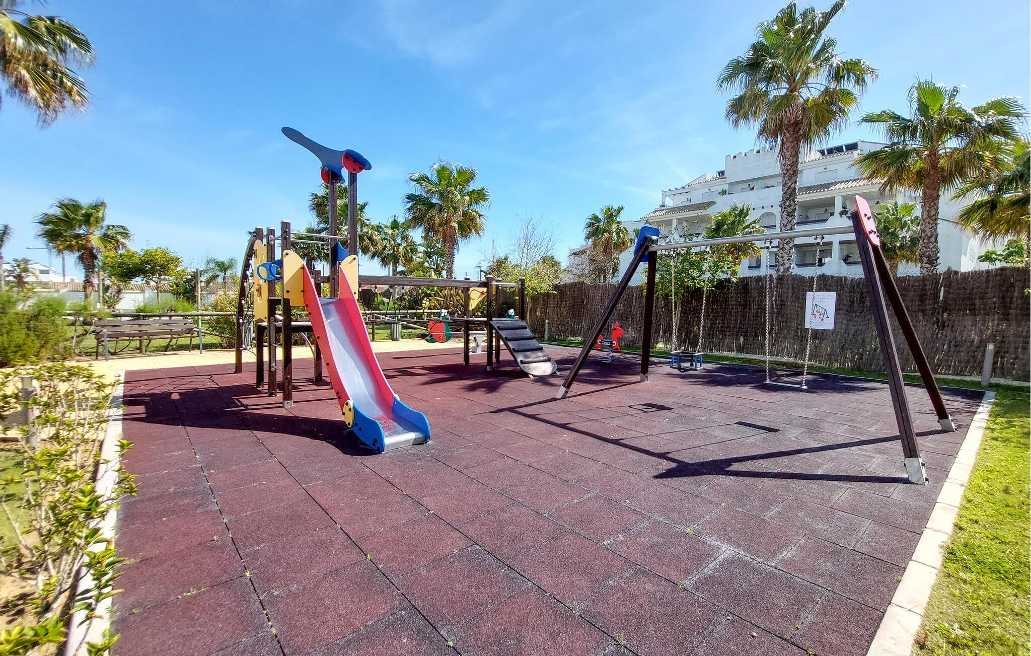 Gå en tur udenfor i skyggen af palmer, nyd solen ved poolen, og tag en forfriskende dukkert i det klare vand, lige når I har lyst. Og så er der kun få skridt ned til stranden. I nærheden af jeres lejlighed kan I spille golf og udforske flere gamle kirker samt fæstningen Castillo de Luna i Rota.