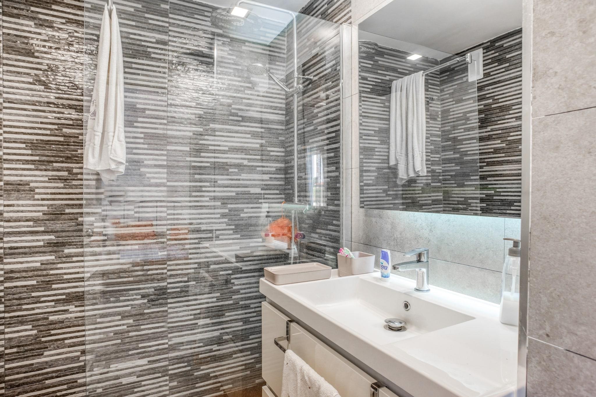 På 1. etage: (Stue(Fjernsyn, spisebord, sofahjørne, balkon eller terrasse), åbent køkken(dobbeltseng, kogeplade, emhætte, kaffemaskine, ovn, køle-fryseskab), soveværelse(dobbeltseng), soveværelse(enkeltseng, enkeltseng), soveværelse(dobbeltseng), badeværelse(bruser, håndvask, toilet), badeværelse(badekar, håndvask, toilet)) swimmingpool(deles med andre gæster)