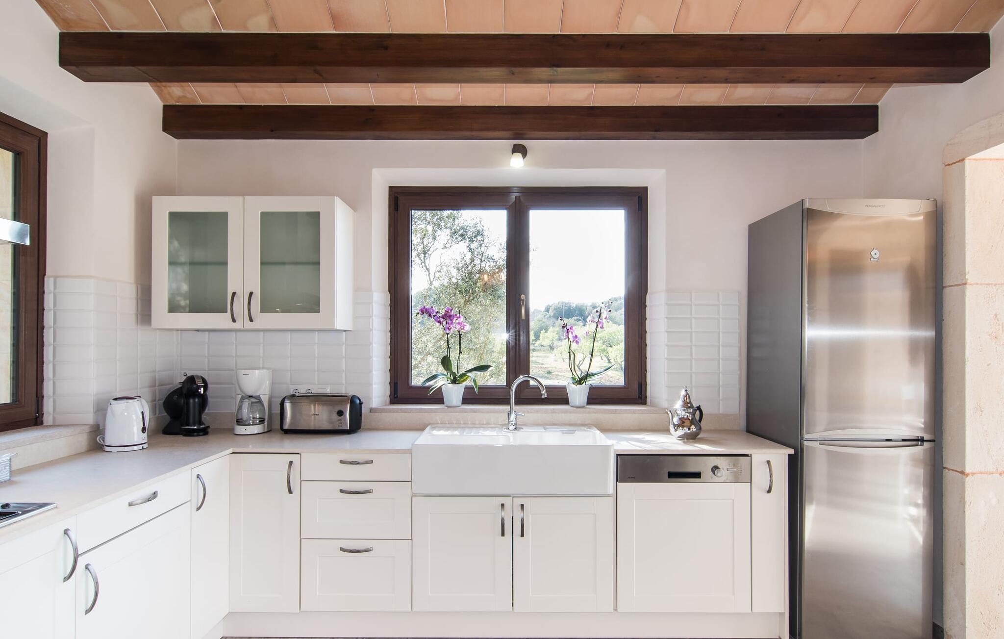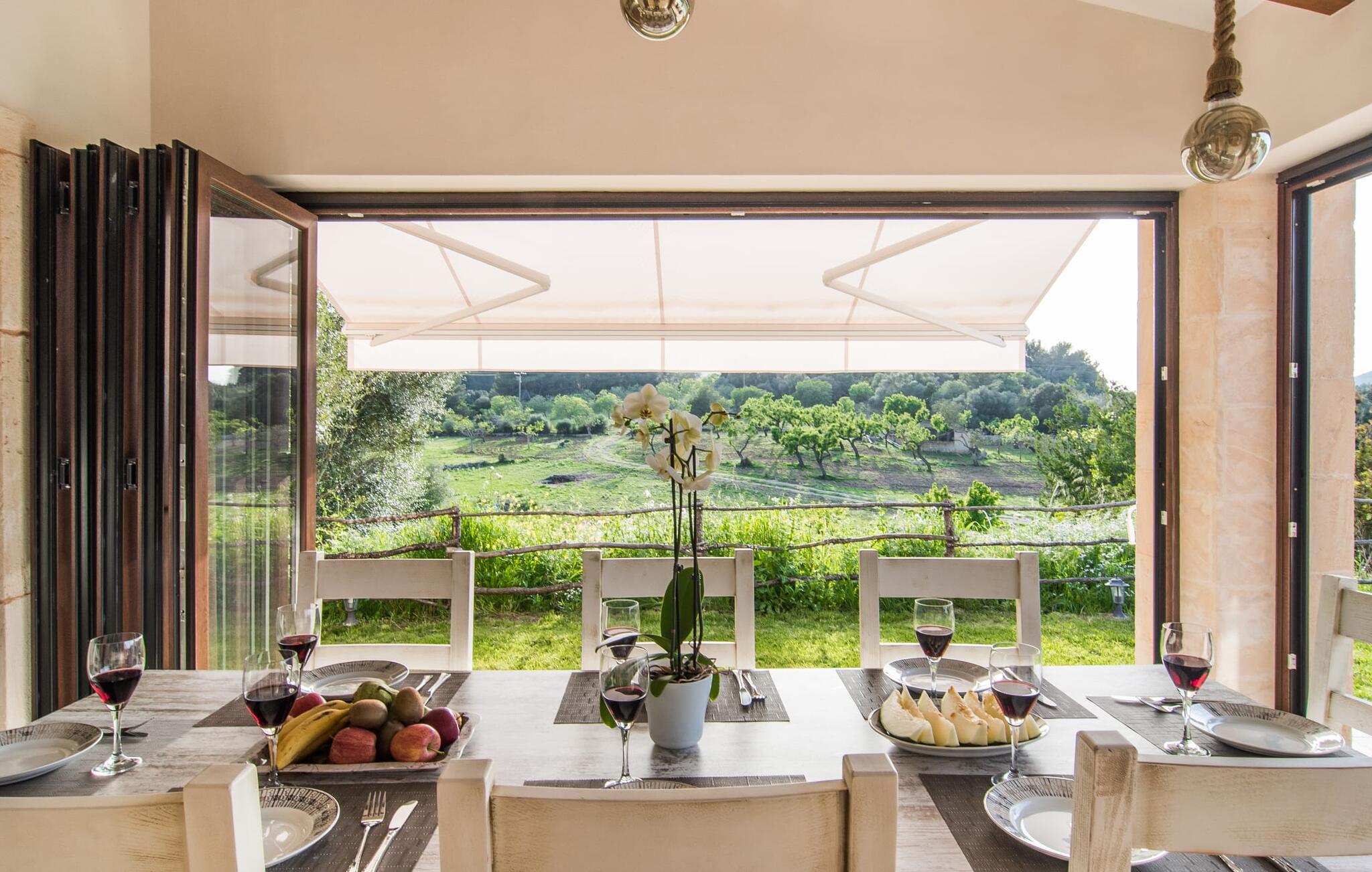 Hvis I beslutter jer for at tilbringe jeres ferie i en villa, vil I normalt sætte pris på nærheden til det fri: Selvom Artà, den næste større by, kun ligger et stenkast væk, vil I være midt i det grønne på jeres nye placering. Byggevilla S'Hort de Carrossa. Udsigten fra udendørsområdet af det smukke landskab er den reneste farveterapi, der fortryller jeres øjne med forskellige farver - alt efter årstiden. Efter at have nydt en afslappende nat, træder I ud på terrassen, strækker jer lidt, og glider så ned i poolen og genoplader, mens I glider gennem vandet midt i et postkortlignende landskab. Intet vil ændre sig, hvis I beslutter jer for at begynde at grille senere på eftermiddagen for at forkæle jer selv og familien med en skøn udendørs middag. Den milde, lune luft er en af ??grundene til, at Mallorca er så populær blandt feriegæster. Denne villa giver jer forskellige muligheder for at nyde det milde klima på den store terrasse, hvor I finder solbadeområder, lounge siddepladser og et overdækket område. For at slappe af og nyde jeres ferie fuldt ud, behøver I ikke engang at forlade villaen. Vinduerne til husets spiseplads kan åbnes så bredt, at ydersiden og indersiden af ??denne villa næsten smelter sammen.