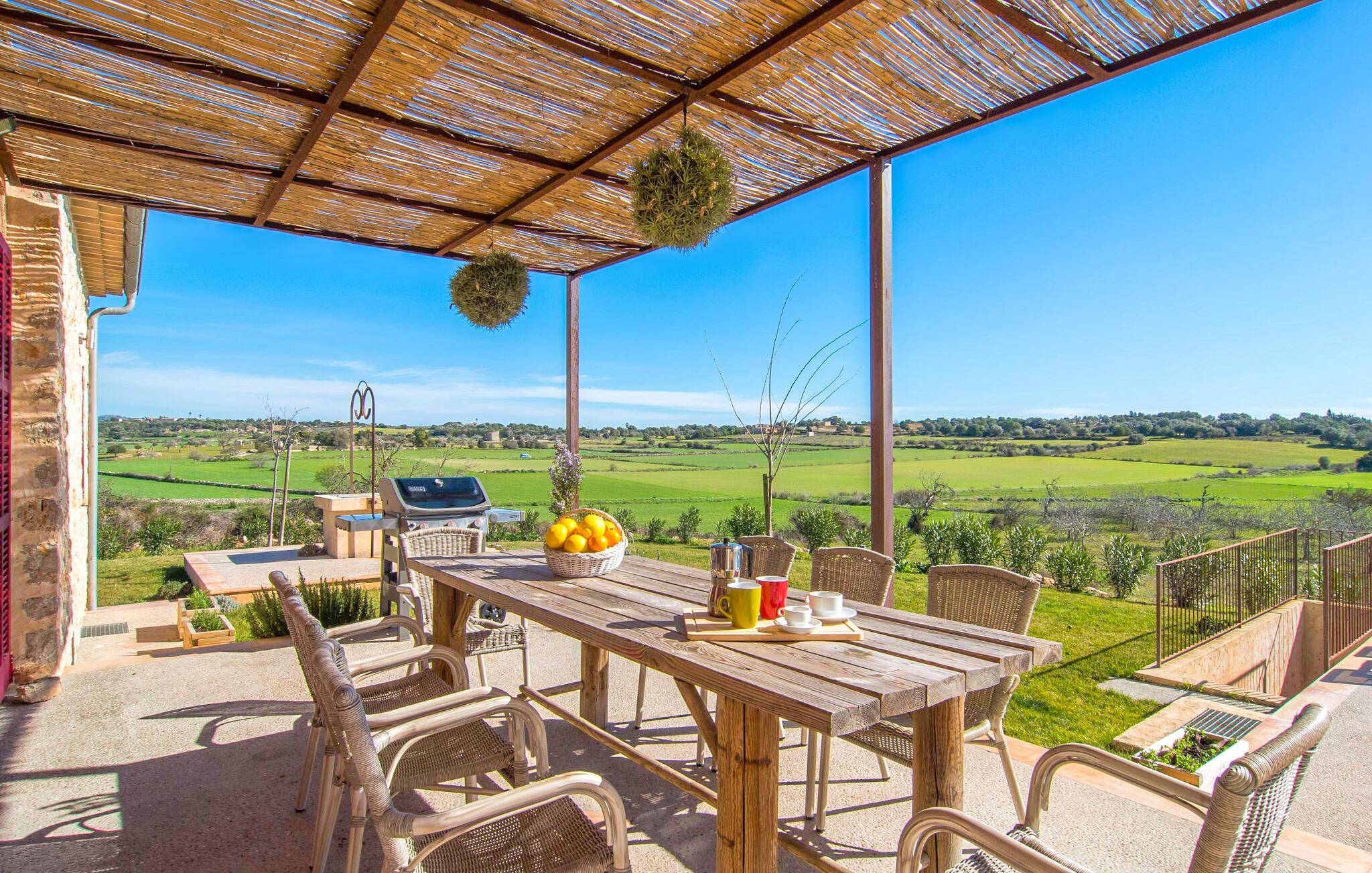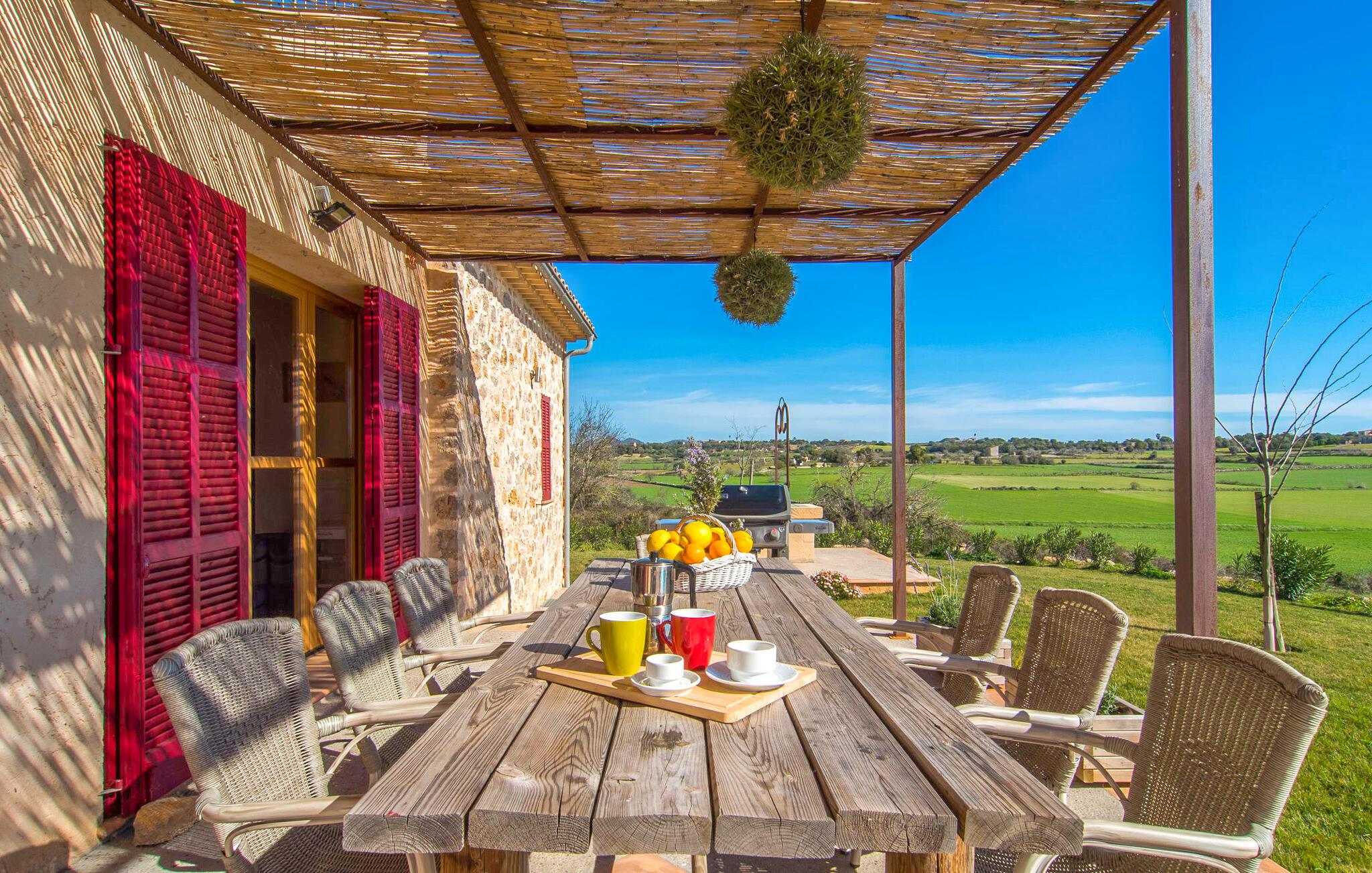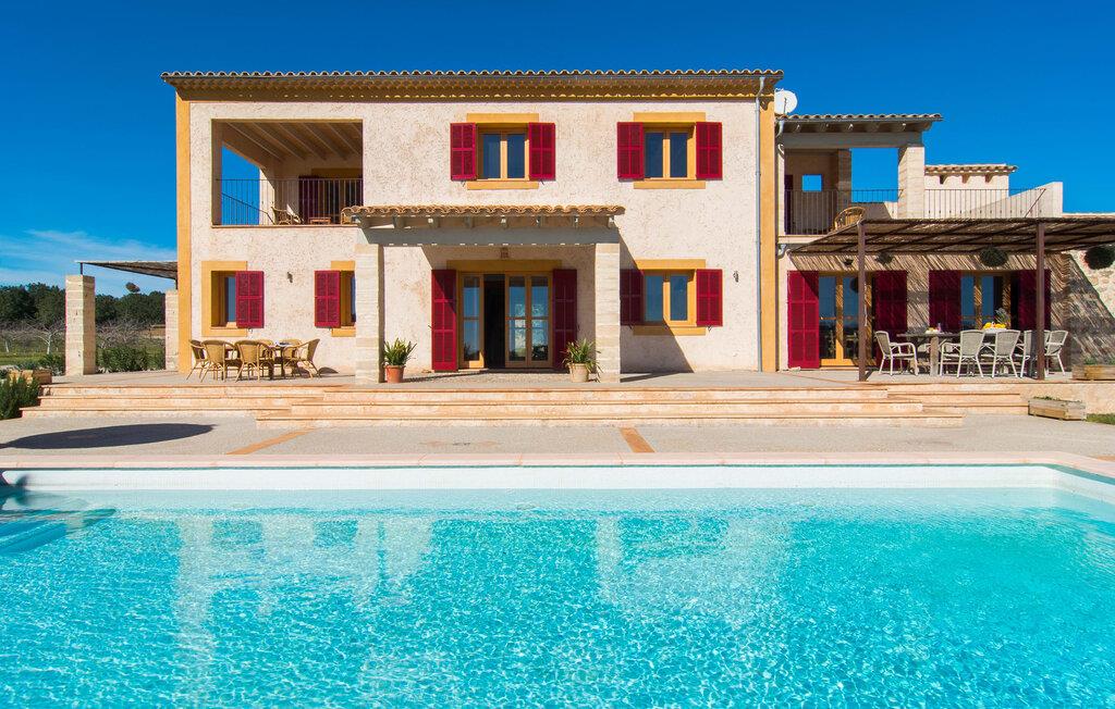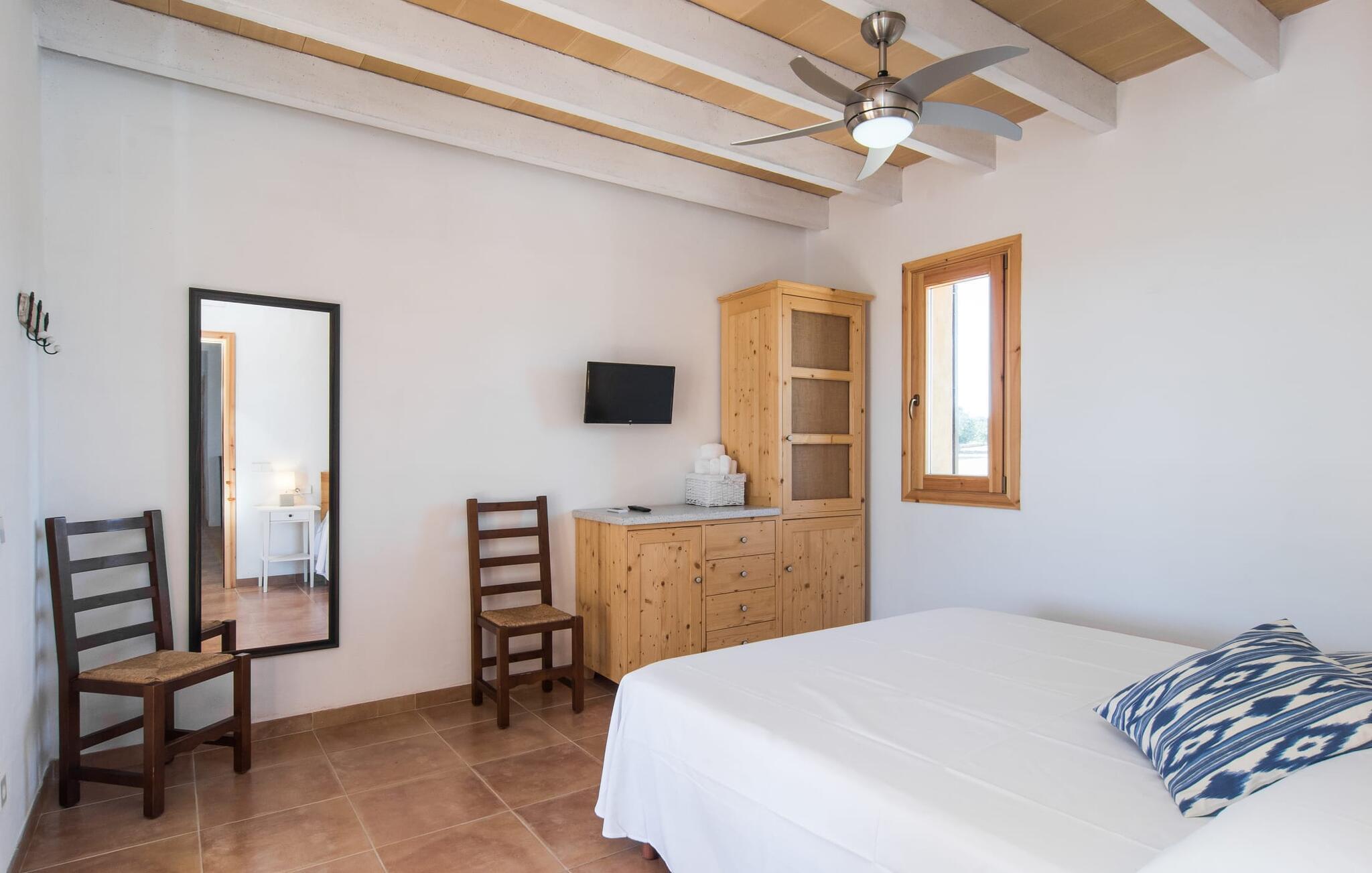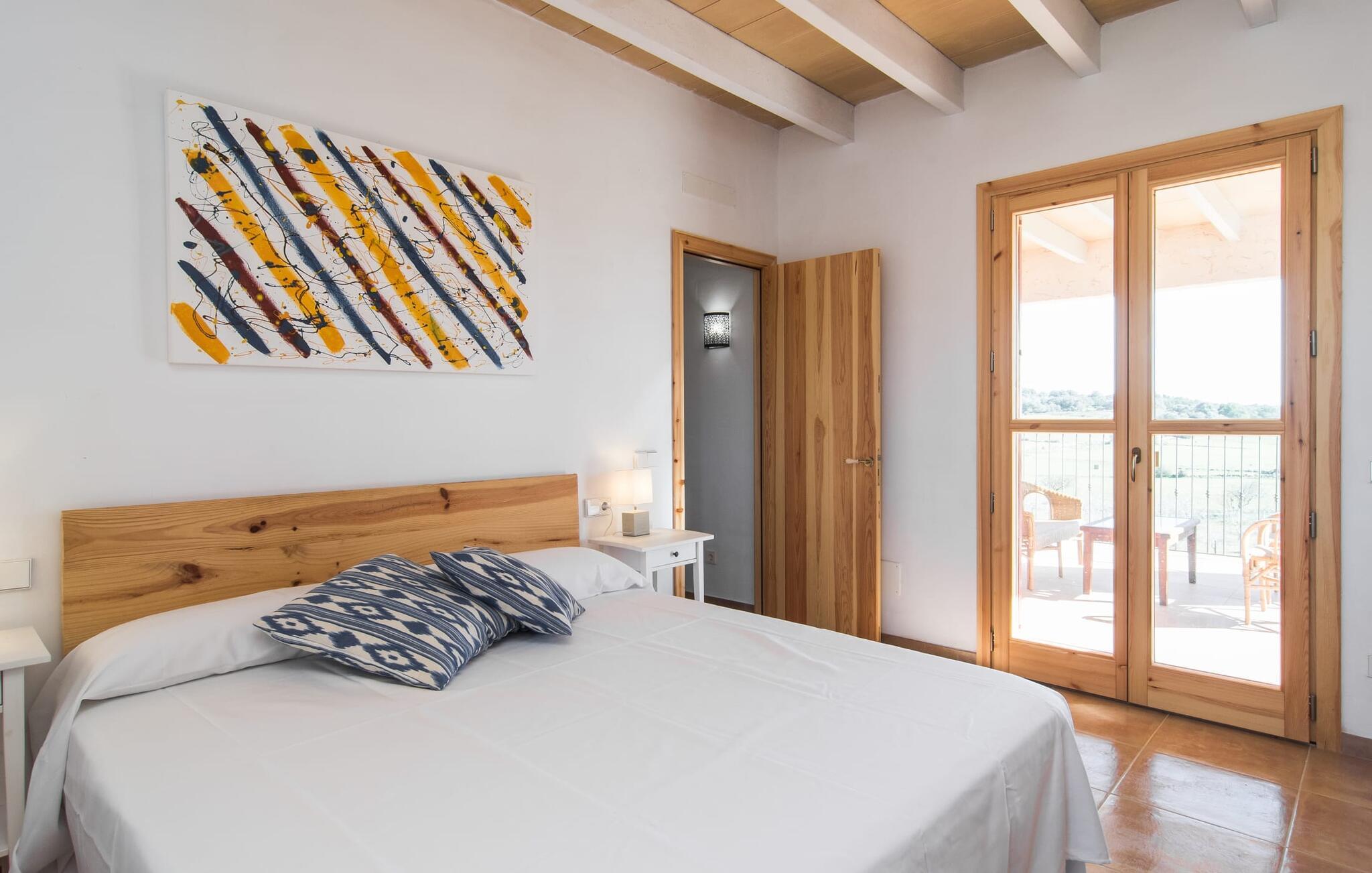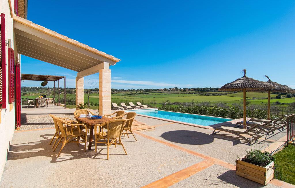 Kort efter landing i Palma Lufthavn kører I ned ad indkørslen til huset, parkerer jeres lejebil og nyder straks den betagende udsigt, som dette feriehus på Mallorca har at byde på: Her kan I se langt ud over det overvejende flade landskab til kæderne af bakker, som hæver sig blidt i forskellige retninger. Og så vil I straks have fat i et badehåndklæde og snuppe en af de liggestole, der er så indbydende placeret ved poolen, som er 10 m lang, har klart vand og er nem at komme til via trapper. Og alt det - vi gentager os gerne her! - med et storslået panorama, der strækker sig ud foran jer. Solterrassen og de åbne og delvist overdækkede terrassearealer direkte ved siden af huset virker harmonisk. Adskillige siddepladser ved perfekte udsigtspunkter inviterer jer til at tilbringe timers afslapning, som er særlig smuk ved solopgang og solnedgang. Også vidunderligt: to altaner på husets øverste etage supplerer udendørsområdet. Direkte fra terrassen kommer I ind i den store stue/spisestue, som er opdelt i to områder - på den ene side med en behagelig sofa og pejs-tv-hjørne, på den anden side med en hyggelig spiseplads. Blot et værelse videre ligger køkkenet, som også er så rummeligt, at der er god plads til udvidede madlavningssessioner og endnu et spisebord - et rigtigt køkken-alrum, hvor fællessammenkomster er i højsædet. I stueplan er der desuden soveværelse med smarte indbyggede skabe samt badeværelse og toilet. Derfor er der yderligere tre soveværelser med dobbeltsenge på øverste etage, hvoraf det ene har en-suite badeværelse; Der er også et ekstra badeværelse. Husets indretning imponerer med sin behagelige lysstyrke, som understreges af den generøse brug af træ. Lyse vægge, store gulvfliser og synlige bjælkelofter fuldender den indvendige harmoni i denne charmerende Mallora-finca. Fincaen "s'Hort de Son Pereto" er ideelt placeret på Mallorca for udflugter i alle retninger. Samtidig kan I nyde absolut fred og privatliv her. I kan klare jeres daglige ærinder i smukke Sant Llorenc (ca. 3 km), og for yderligere shopping kan I køre til Manacor, ca. 6 km væk. Sandstrandene i Cala Millor, Sa Coma og Porto Cristo er inden for rækkevidde.