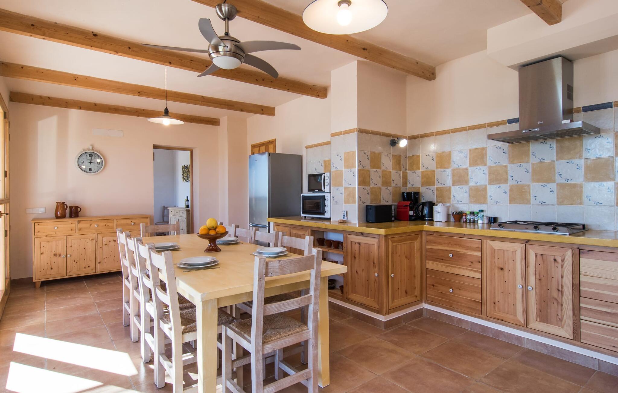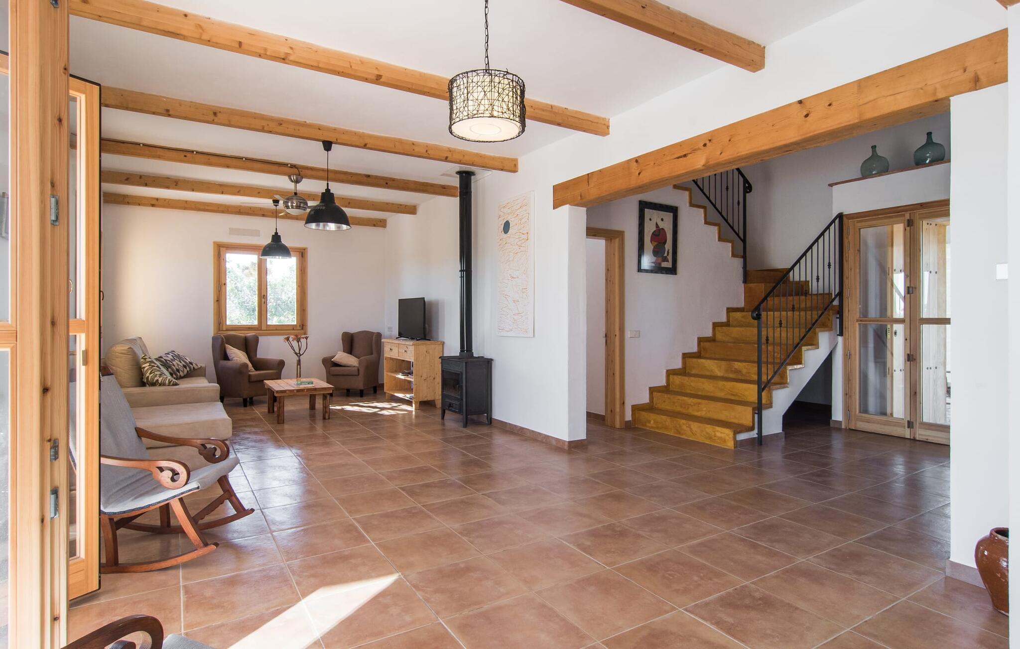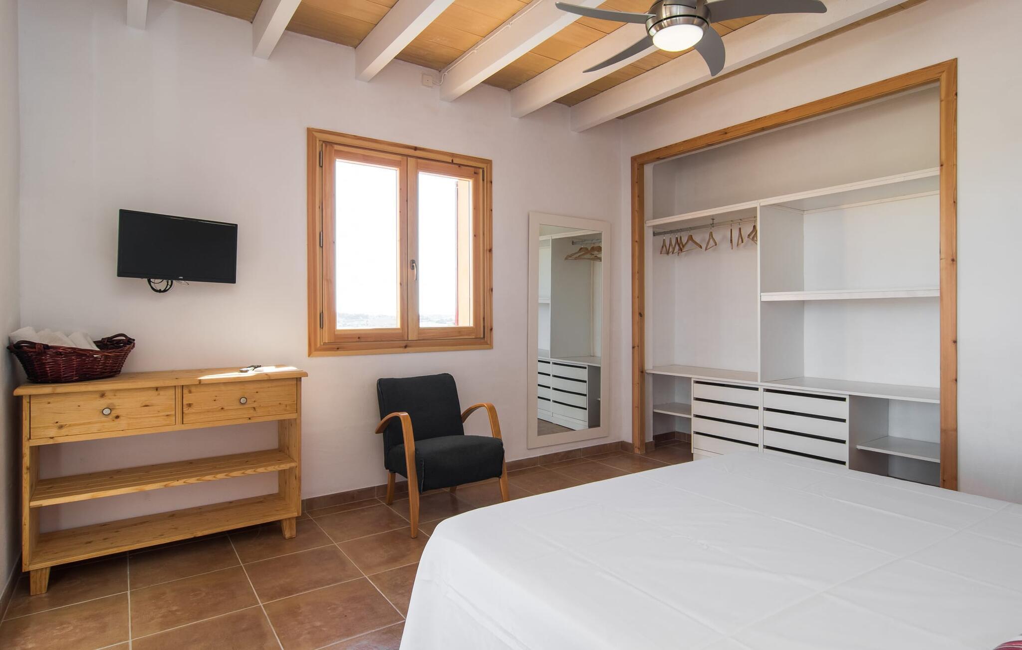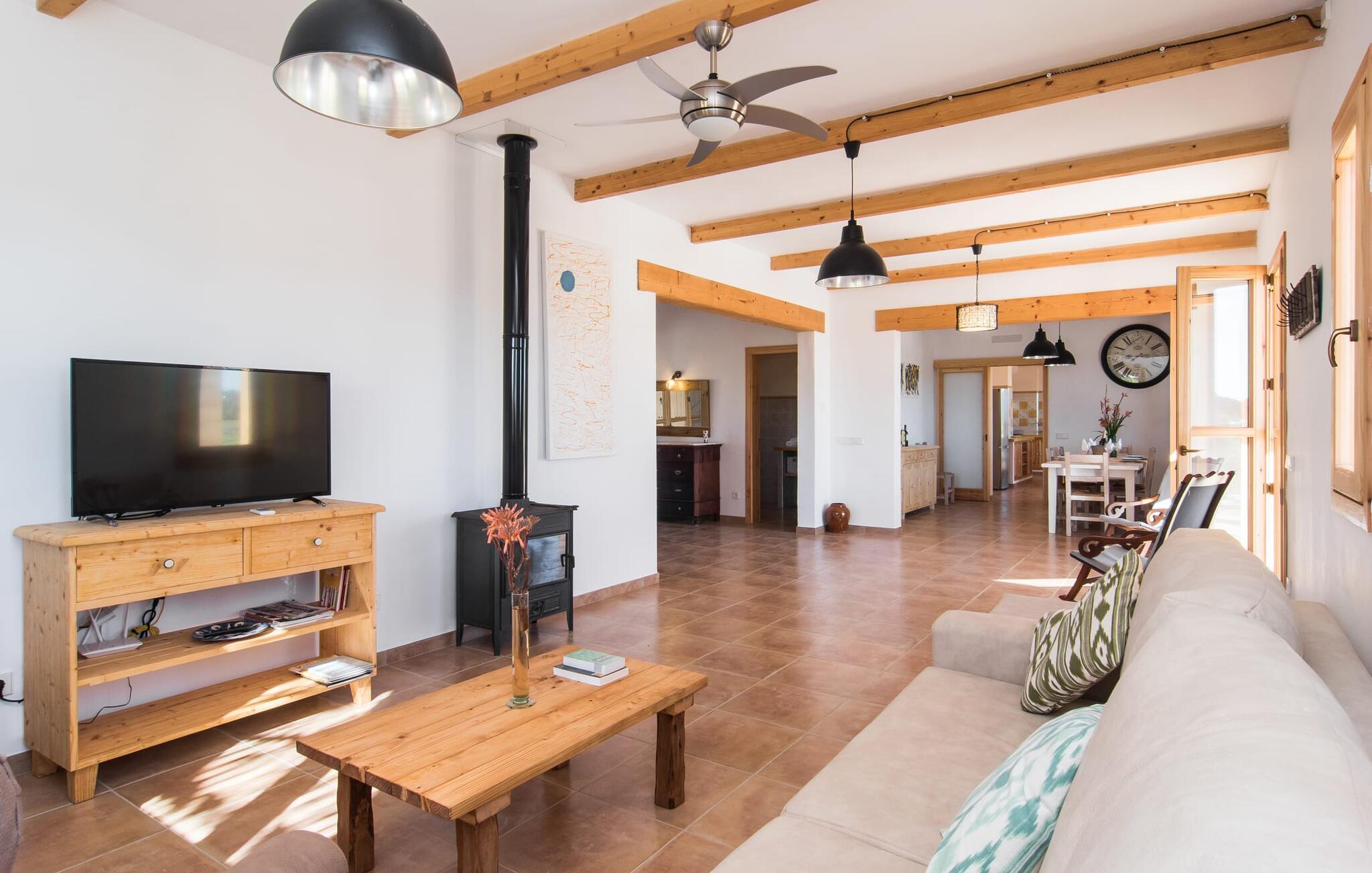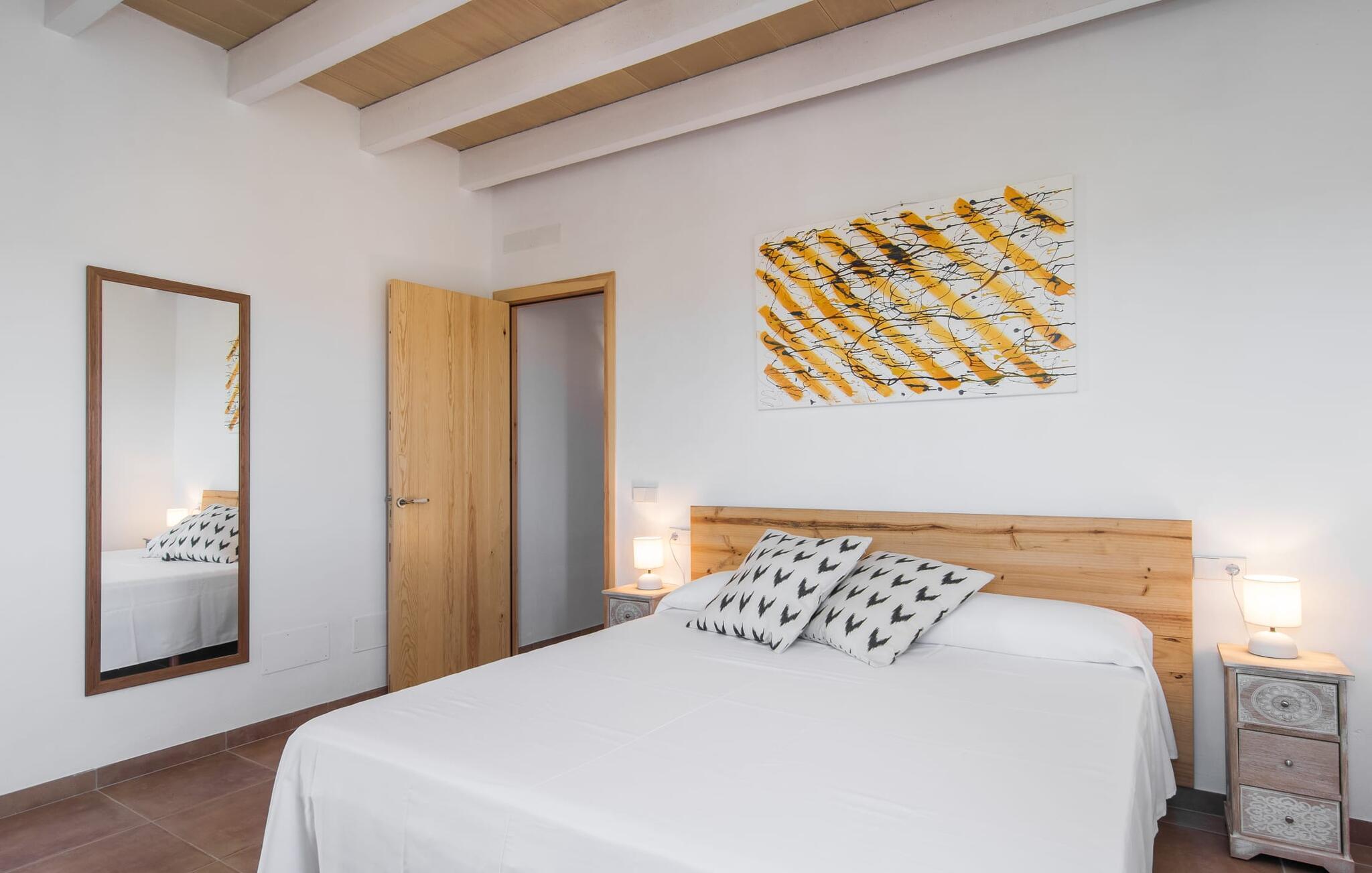 Kort efter landing i Palma Lufthavn kører I ned ad indkørslen til huset, parkerer jeres lejebil og nyder straks den betagende udsigt, som dette feriehus på Mallorca har at byde på: Her kan I se langt ud over det overvejende flade landskab til kæderne af bakker, som hæver sig blidt i forskellige retninger. Og så vil I straks have fat i et badehåndklæde og snuppe en af de liggestole, der er så indbydende placeret ved poolen, som er 10 m lang, har klart vand og er nem at komme til via trapper. Og alt det - vi gentager os gerne her! - med et storslået panorama, der strækker sig ud foran jer. Solterrassen og de åbne og delvist overdækkede terrassearealer direkte ved siden af huset virker harmonisk. Adskillige siddepladser ved perfekte udsigtspunkter inviterer jer til at tilbringe timers afslapning, som er særlig smuk ved solopgang og solnedgang. Også vidunderligt: to altaner på husets øverste etage supplerer udendørsområdet. Direkte fra terrassen kommer I ind i den store stue/spisestue, som er opdelt i to områder - på den ene side med en behagelig sofa og pejs-tv-hjørne, på den anden side med en hyggelig spiseplads. Blot et værelse videre ligger køkkenet, som også er så rummeligt, at der er god plads til udvidede madlavningssessioner og endnu et spisebord - et rigtigt køkken-alrum, hvor fællessammenkomster er i højsædet. I stueplan er der desuden soveværelse med smarte indbyggede skabe samt badeværelse og toilet. Derfor er der yderligere tre soveværelser med dobbeltsenge på øverste etage, hvoraf det ene har en-suite badeværelse; Der er også et ekstra badeværelse. Husets indretning imponerer med sin behagelige lysstyrke, som understreges af den generøse brug af træ. Lyse vægge, store gulvfliser og synlige bjælkelofter fuldender den indvendige harmoni i denne charmerende Mallora-finca. Fincaen "s'Hort de Son Pereto" er ideelt placeret på Mallorca for udflugter i alle retninger. Samtidig kan I nyde absolut fred og privatliv her. I kan klare jeres daglige ærinder i smukke Sant Llorenc (ca. 3 km), og for yderligere shopping kan I køre til Manacor, ca. 6 km væk. Sandstrandene i Cala Millor, Sa Coma og Porto Cristo er inden for rækkevidde.