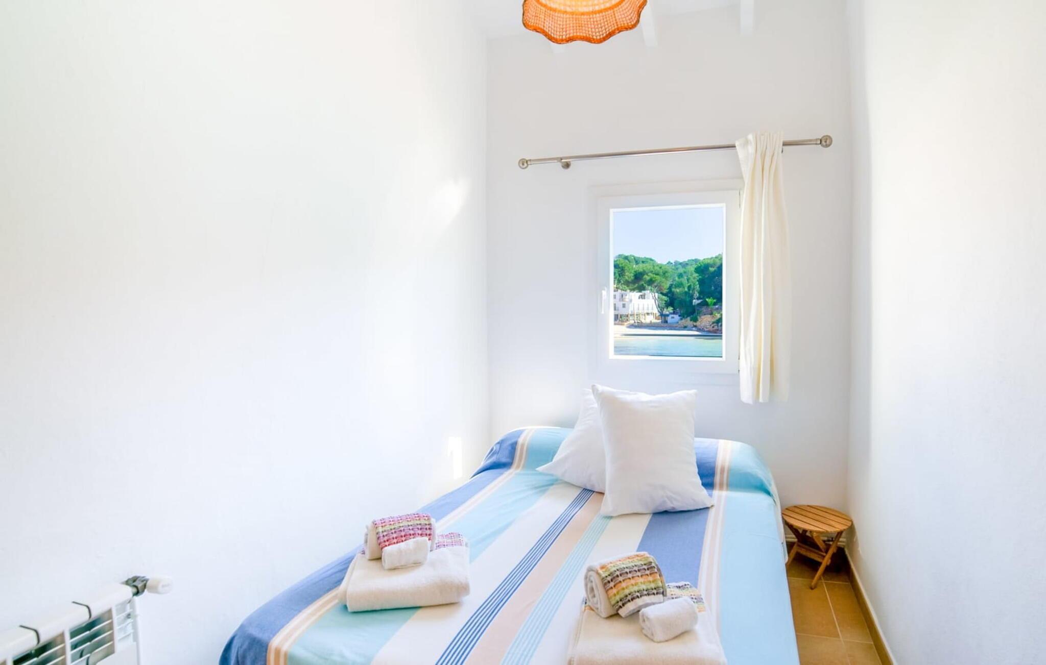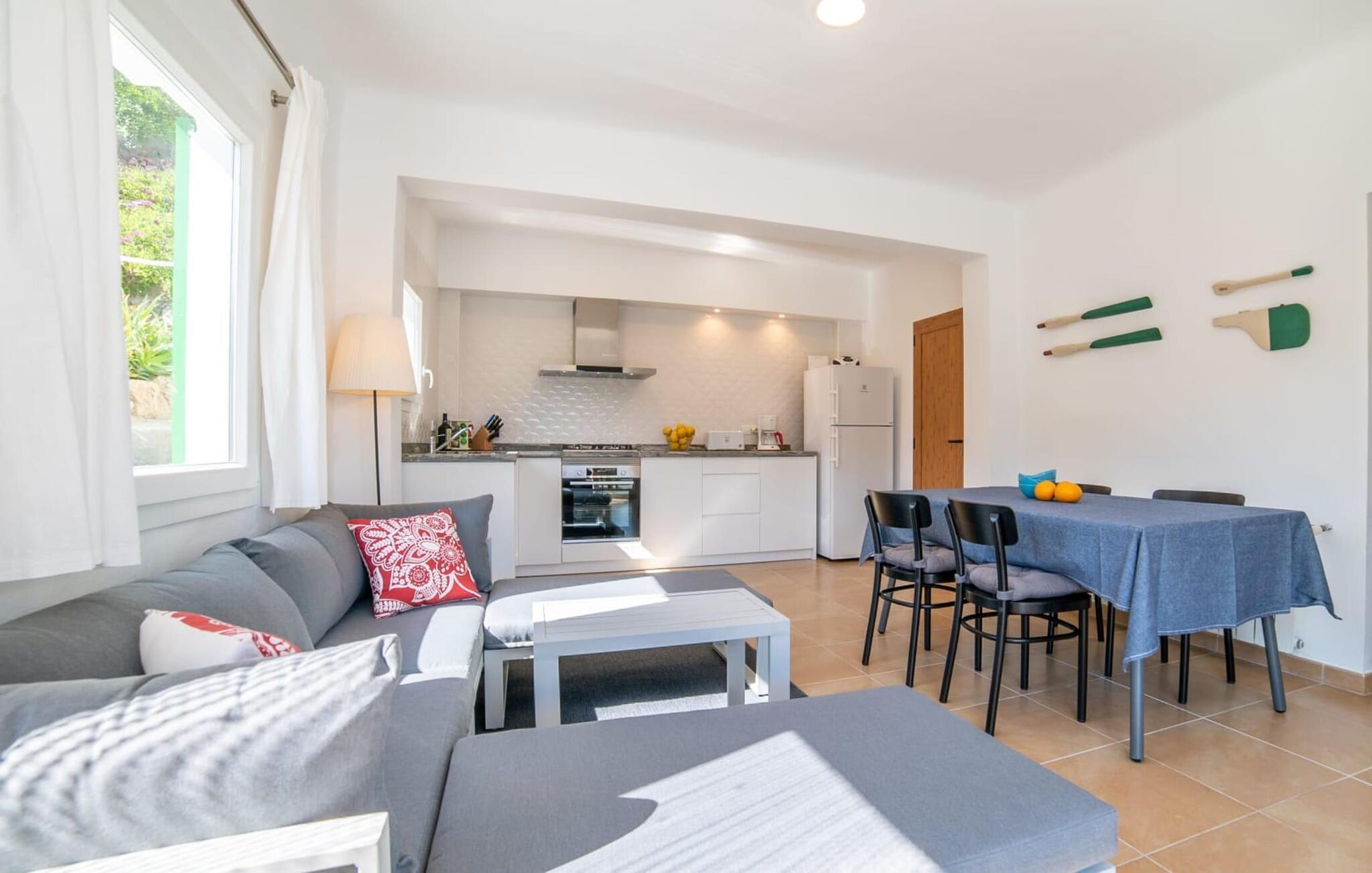 Villaen ligger ved foden af en større bjergskråning omgivet af fyrretræer og palmer. Tilgængelig via en trappe fra gaden ovenover, går man først til tagterrassen og derefter videre ned i stueetagen, hvor en hyggelig opholds- og spiseplads åbner ud til køkken og soveafdeling. Der er badeværelse med bruseniche, toilet og håndvask. Det tredje soveværelse i villaen er lille, men en praktisk tilføjelse afhængigt af gruppen. "Sa Barca" bevarer sin rustikke, uhøjtidelige charme, med et design, der smelter sømløst ind i det naturlige landskab. Dens utrolige beliggenhed ved havet er dens største aktiv, og tilbyder dig et sandt middelhavs-tilflugtssted.
