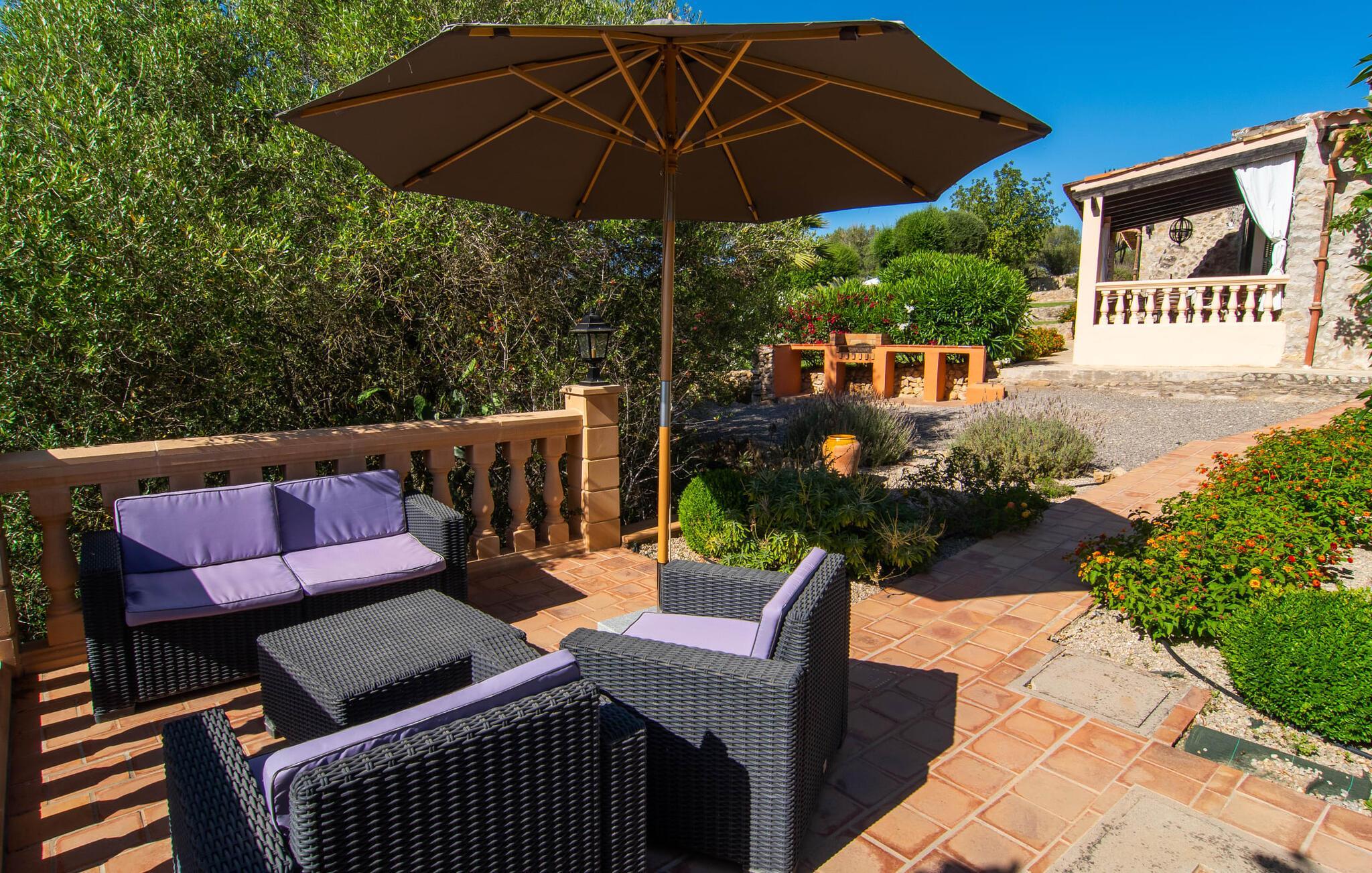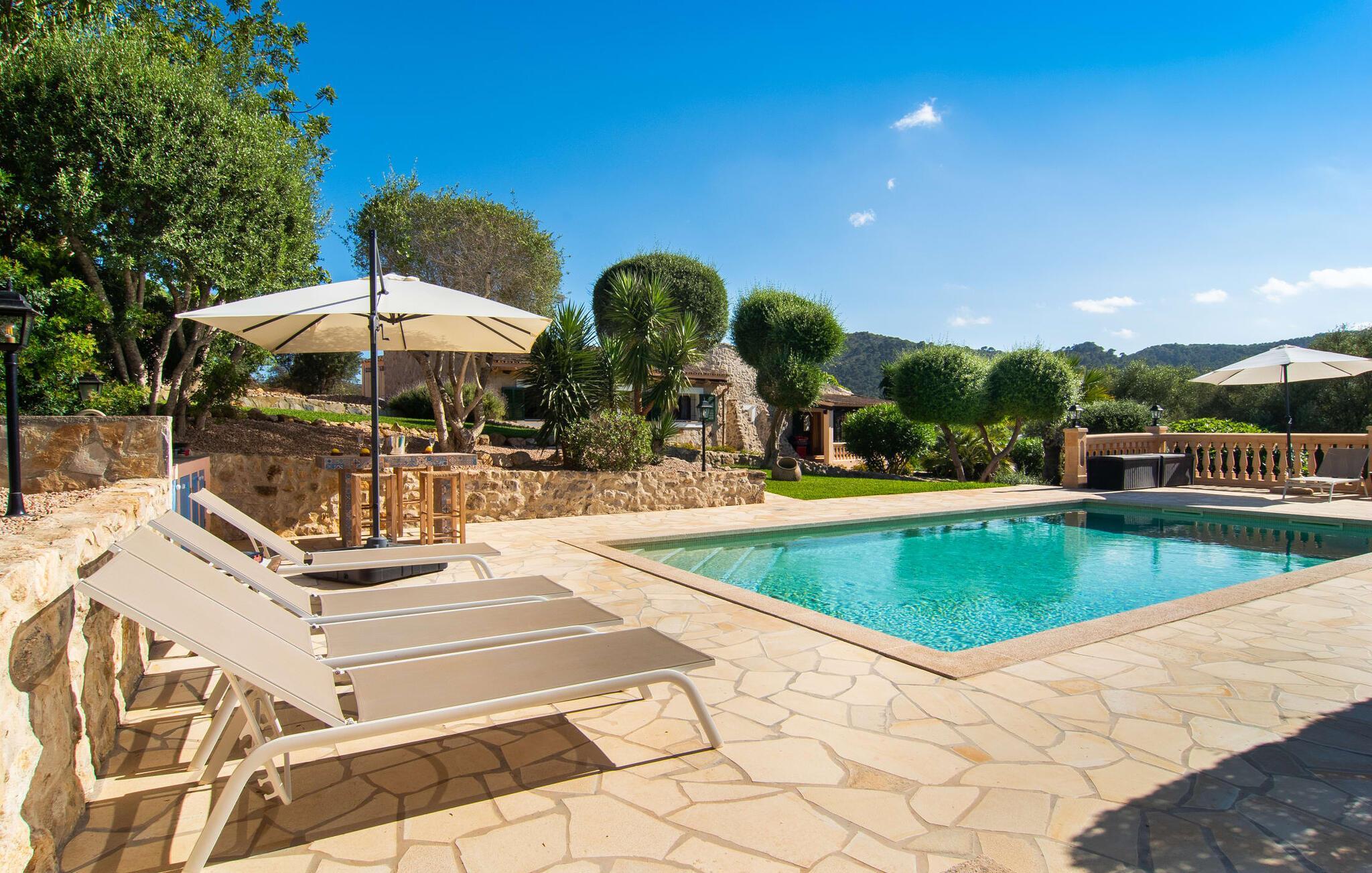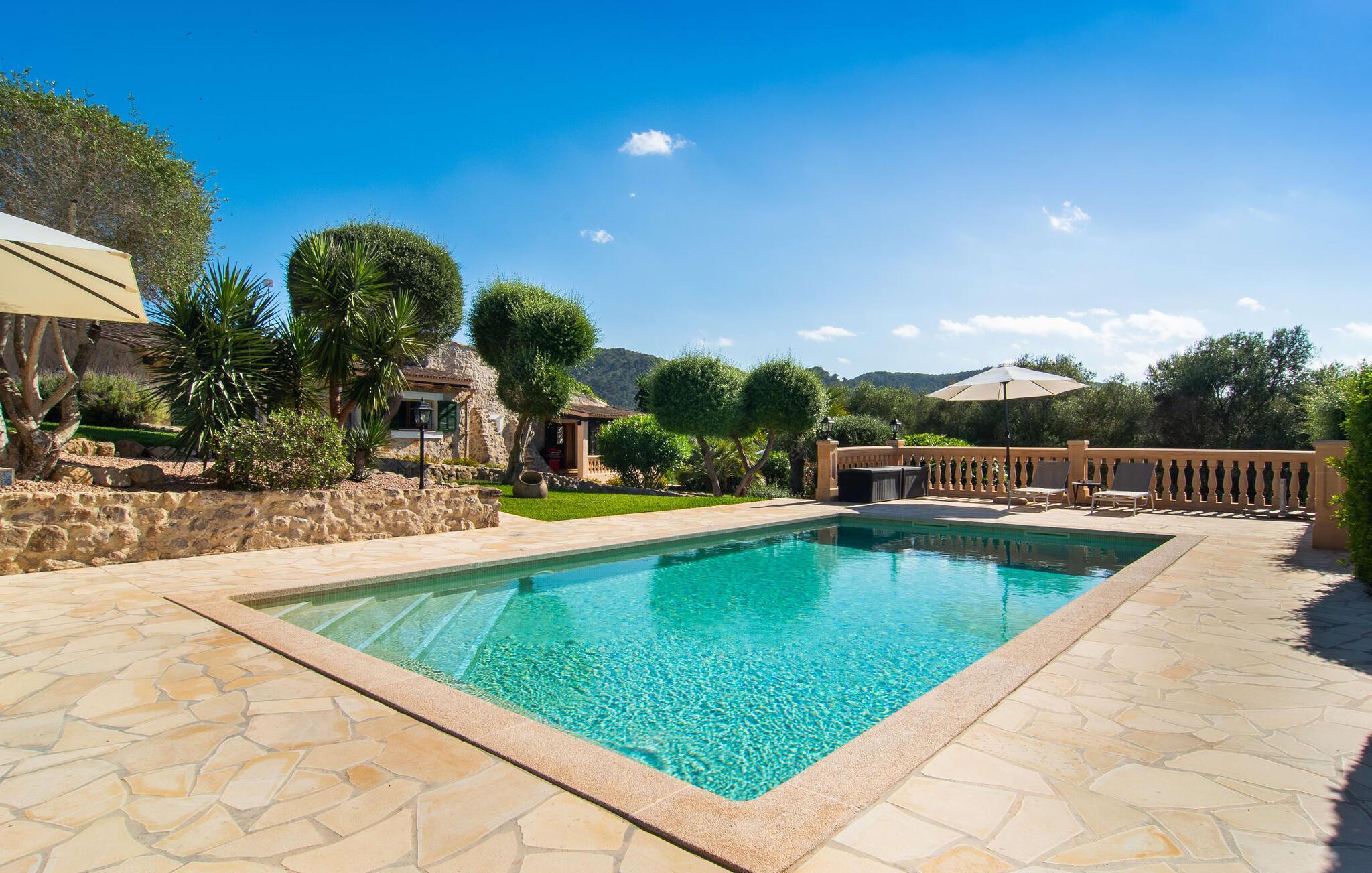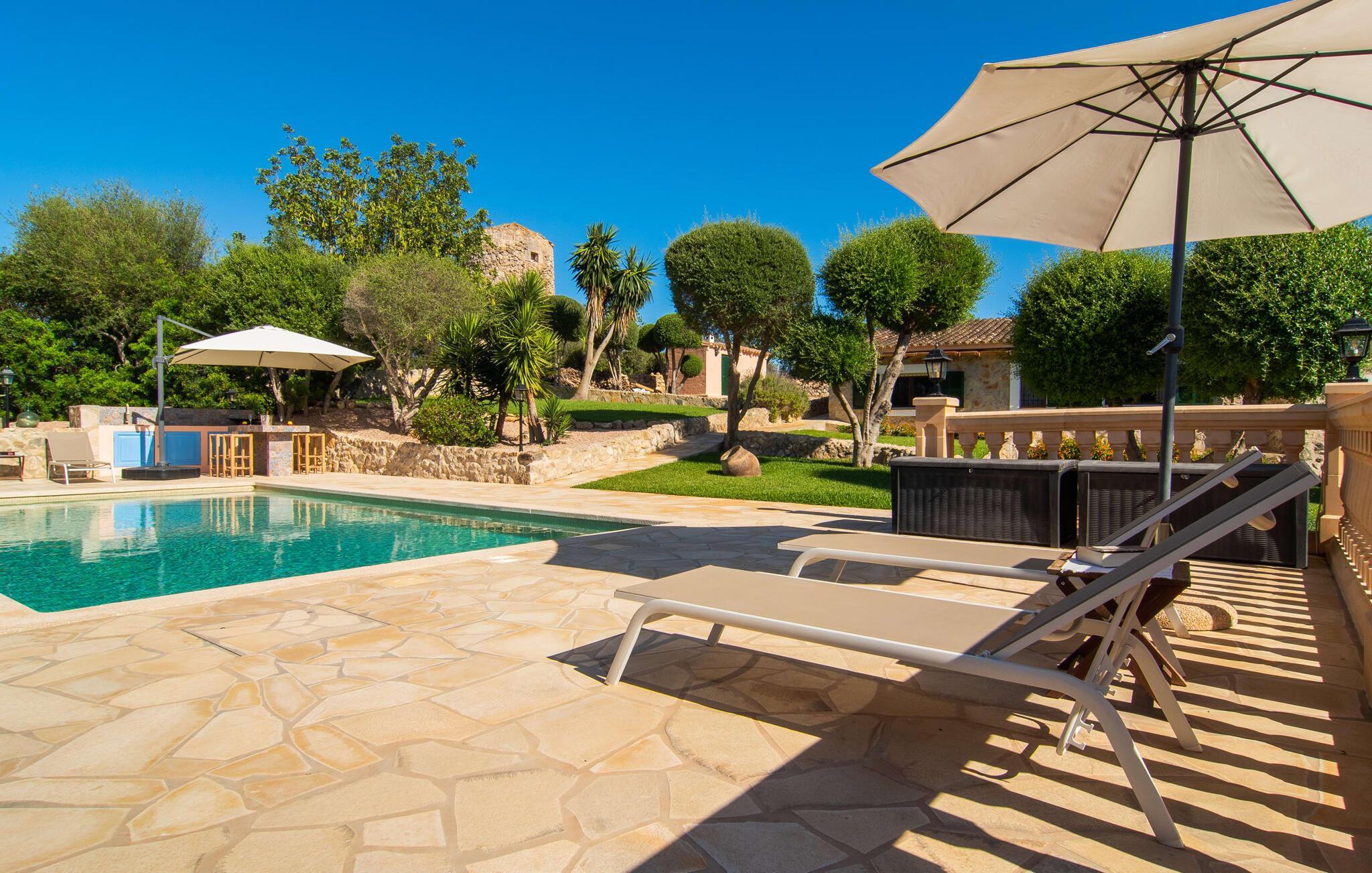 Velkommen til Villa "Sa Cabana Ampola"! Glæd jer til en uforglemmelig ferie, for I vil aldrig glemme denne eksklusive, rummelige og utrolige ejendom med 33.000 m² grund og en utrolig panoramaudsigt. Middelhavshaven byder på flere terrasser og siddeområder: Nyd en solid morgenmad i skyggen af ??lysthuset med udsigt over de sydvestlige foden af ??Llevant, mens I kigger ud over frugtbare marker, bølgende bakker og bjerge samt maquis af mastiks og gyvelbuske...? Den daglige slid vil snart være glemt! En anden terrasse med komfortable loungemøbler giver jer en utrolig udsigt over den spektakulære solnedgang. Det er det perfekte sted at trække sig tilbage med en spændende bog. Tilføj en café con leche... livet kunne ikke være smukkere. Den overdækkede terrasse og grillen er det ideelle sted at tilbringe en underholdende aften. Et grillområde giver jer yderligere kulinariske muligheder, så I kan overraske jeres gæster med frisk grillet fisk eller en traditionel paella. Trænger I til at køle af? Det rummelige poolområde er afsondret og sikrer absolut privatliv. Der er flere komfortable liggestole. Den 9 x 5 m store pool med et niveaudelt dæk og en maksimal dybde på 2 m sikrer masser af sjov for alle aldre. Små børn under 4 år bør dog ikke lades uden opsyn. At dase ved poolen er en dejlig afslappende måde at afslutte dagen på: Hvorfor ikke svømme et par baner i måneskinnet med børnene i sengen og nyde lidt tid alene sammen under den stjerneklare mallorcanske himmel? Hvis I ser et stjerneskud, vil I helt sikkert ønske jer et ønske...