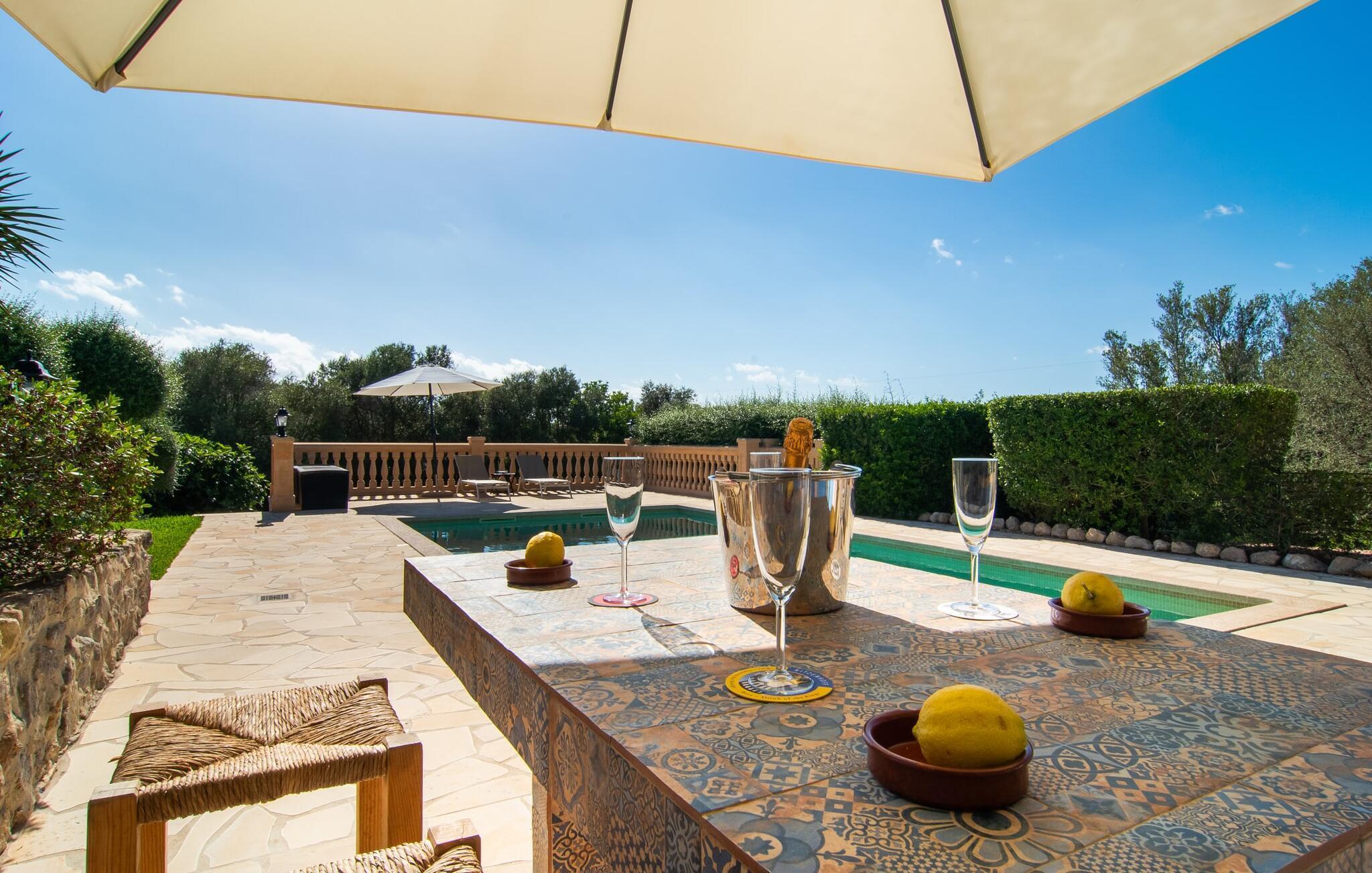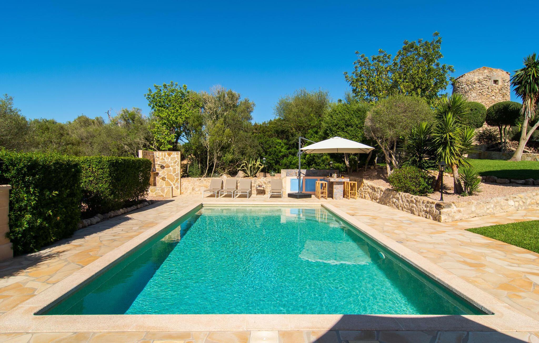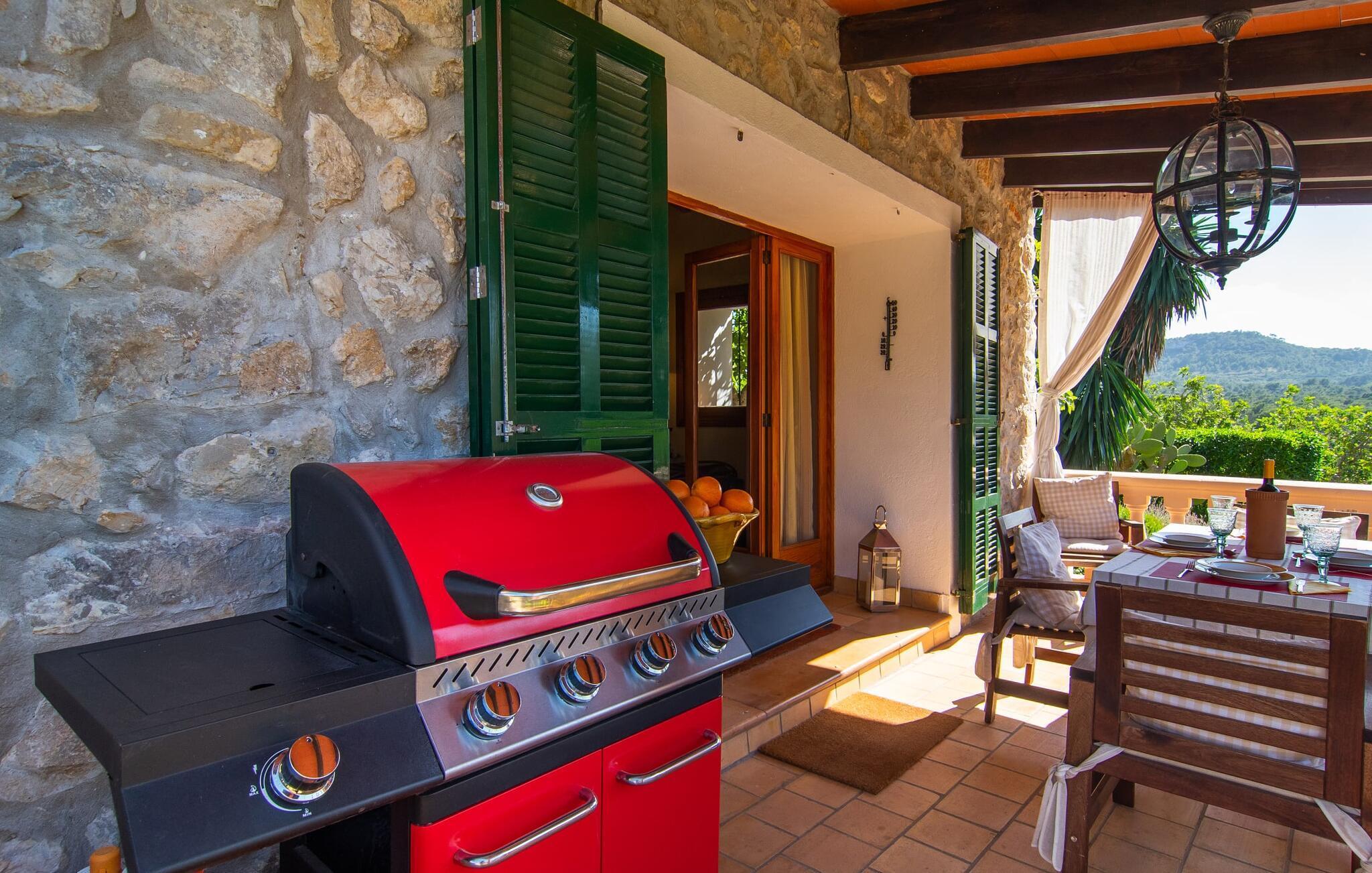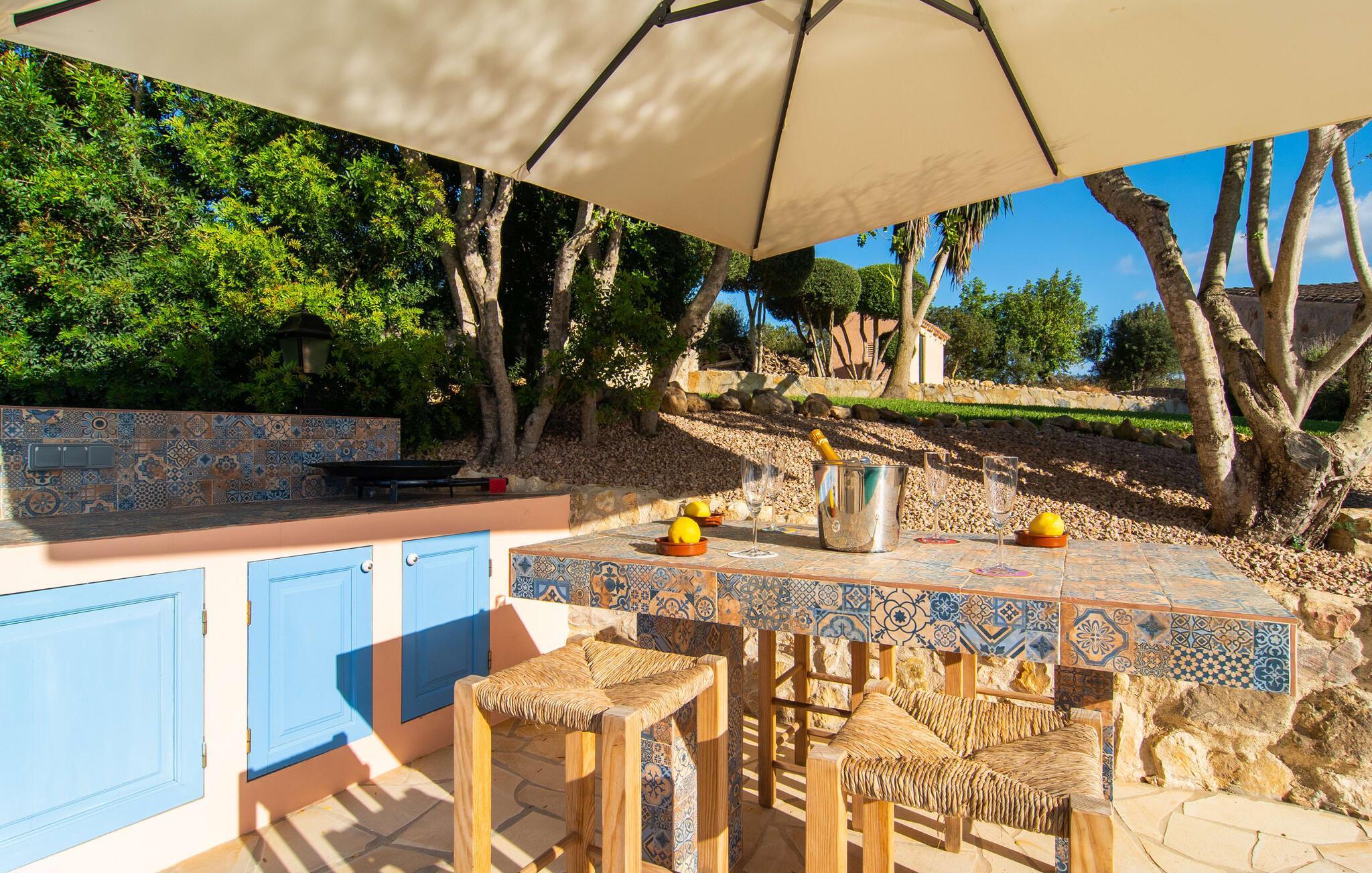 Velkommen til Villa "Sa Cabana Ampola"! Glæd jer til en uforglemmelig ferie, for I vil aldrig glemme denne eksklusive, rummelige og utrolige ejendom med 33.000 m² grund og en utrolig panoramaudsigt. Middelhavshaven byder på flere terrasser og siddeområder: Nyd en solid morgenmad i skyggen af ??lysthuset med udsigt over de sydvestlige foden af ??Llevant, mens I kigger ud over frugtbare marker, bølgende bakker og bjerge samt maquis af mastiks og gyvelbuske...? Den daglige slid vil snart være glemt! En anden terrasse med komfortable loungemøbler giver jer en utrolig udsigt over den spektakulære solnedgang. Det er det perfekte sted at trække sig tilbage med en spændende bog. Tilføj en café con leche... livet kunne ikke være smukkere. Den overdækkede terrasse og grillen er det ideelle sted at tilbringe en underholdende aften. Et grillområde giver jer yderligere kulinariske muligheder, så I kan overraske jeres gæster med frisk grillet fisk eller en traditionel paella. Trænger I til at køle af? Det rummelige poolområde er afsondret og sikrer absolut privatliv. Der er flere komfortable liggestole. Den 9 x 5 m store pool med et niveaudelt dæk og en maksimal dybde på 2 m sikrer masser af sjov for alle aldre. Små børn under 4 år bør dog ikke lades uden opsyn. At dase ved poolen er en dejlig afslappende måde at afslutte dagen på: Hvorfor ikke svømme et par baner i måneskinnet med børnene i sengen og nyde lidt tid alene sammen under den stjerneklare mallorcanske himmel? Hvis I ser et stjerneskud, vil I helt sikkert ønske jer et ønske...