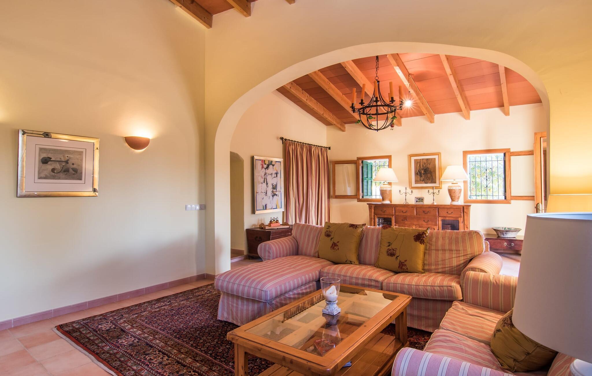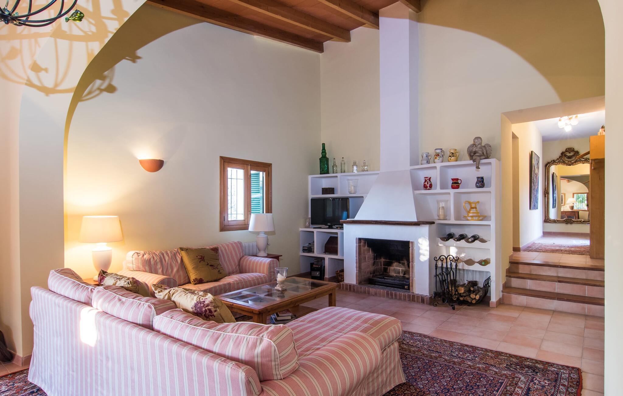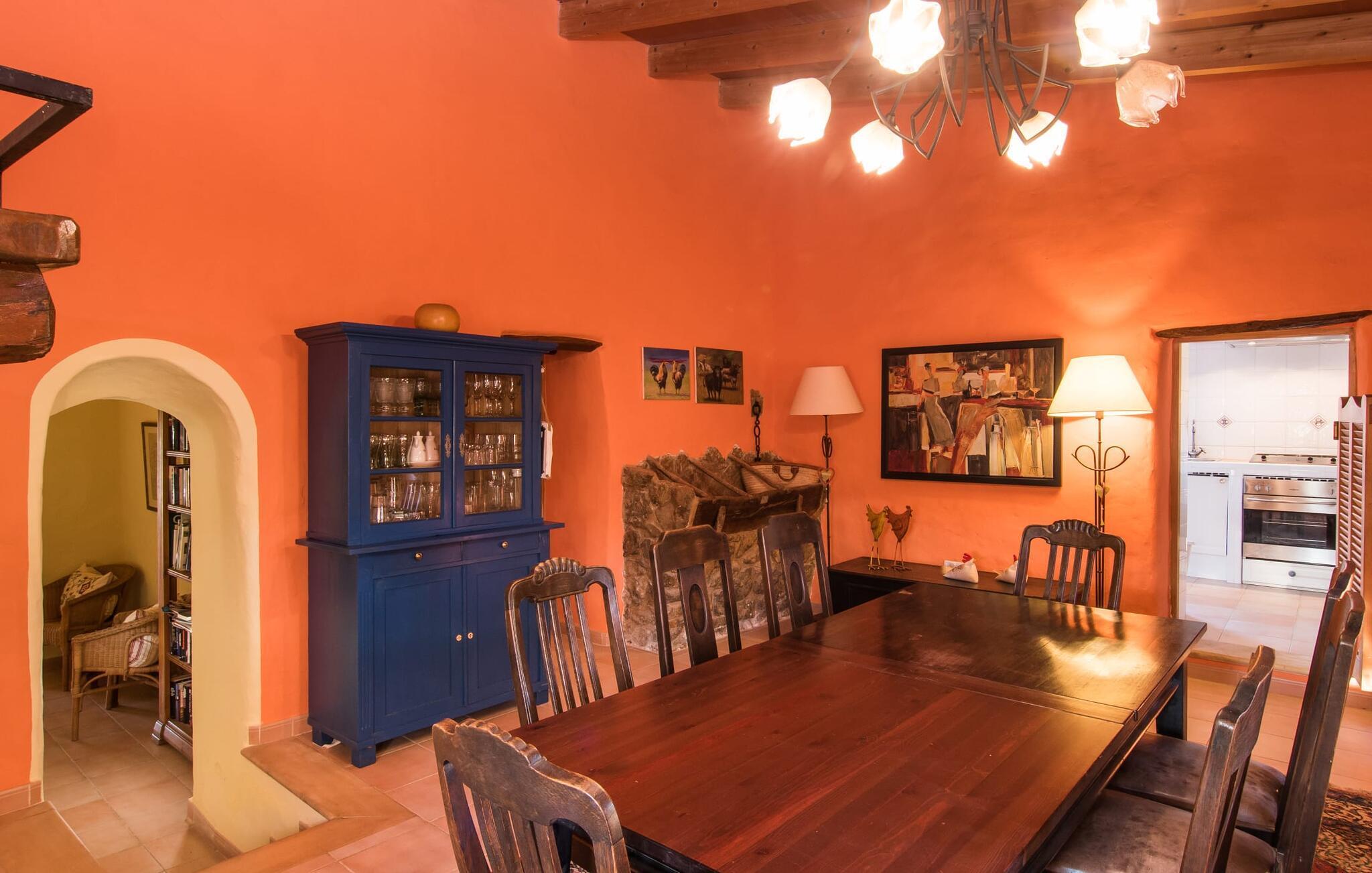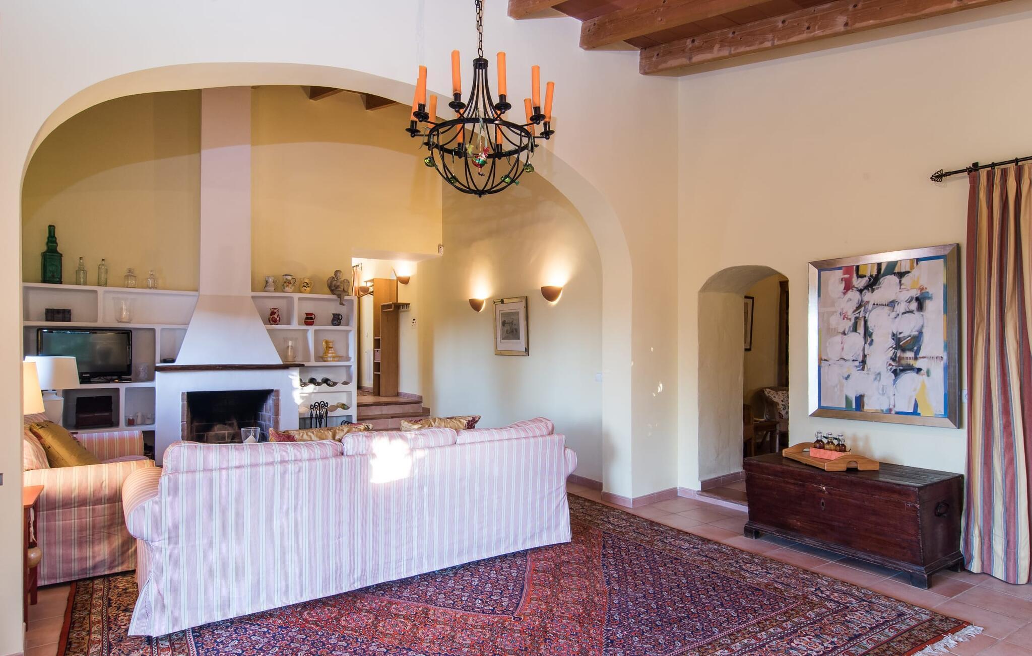 Varme, venlige farver dominerer det 180 m² store interiør; hele indretningen er omhyggeligt udvalgt for at sikre en hyggelig effekt. Opholdsstuen med sin store, komfortable sofa, fladskærms-tv og åbne pejs skaber en hyggelig atmosfære og lægger op til at slappe af hele året rundt. De jordfarvede kalkstensvægge og loftsbjælker skaber en hyggelig overgang fra ude til inde: De med god smag vil straks føle sig hjemme. Spisestuen har også en åben pejs; det store træbord giver jer rigelig siddeplads til seks personer. I det veludstyrede køkken med gaskomfur og ovn kan I virkelig forkæle jer selv med jeres kulinariske kreationer: Pa amb oli, arroz a la marinera, frito mallorquin... uanset om I laver typiske lokale opskrifter eller jeres egne kreationer, er det kun fantasien, der sætter grænser. Den hyggelige, rustikke stil i Villa "Sa Cabana Ampola" fortsætter i de tre soveværelser, hvoraf to har dobbeltsenge (180 x 200 cm). Hvert værelse har sin egen charme; søde drømme er garanteret! De to lyse badeværelser har store håndvaske og spejle samt bruseniche. Hvad mere kan man ønske sig?