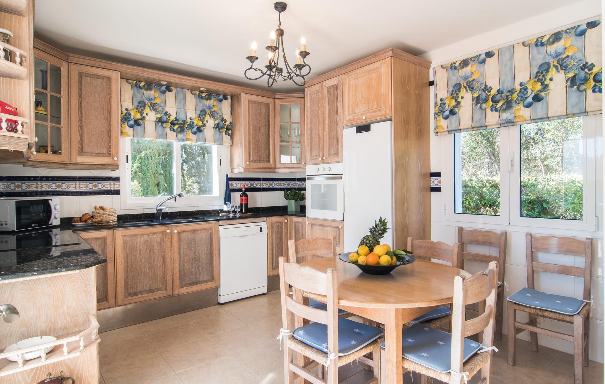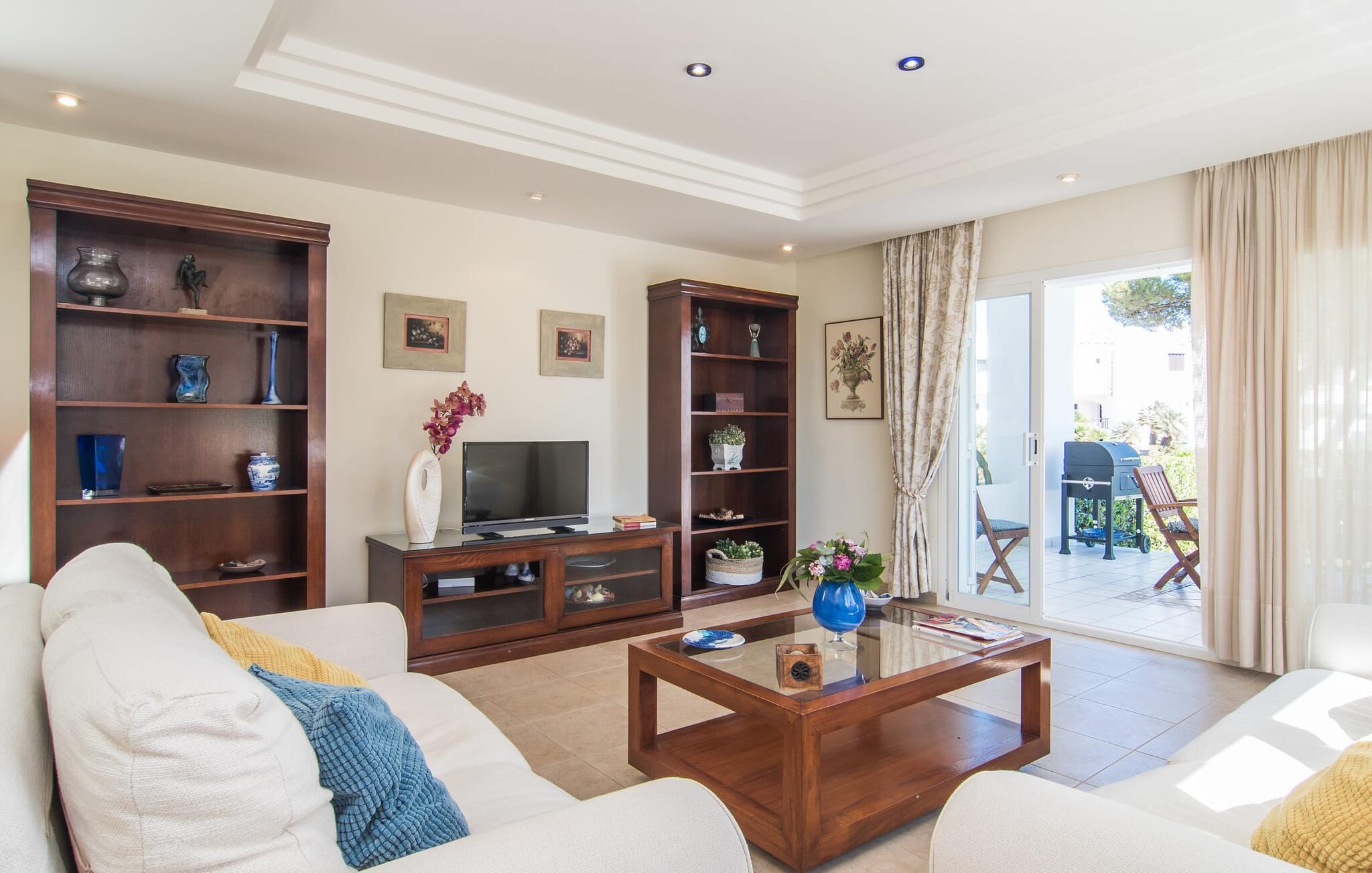 Den strålende byvilla "Sa Caleta de Cala d'Or" passer perfekt ind i dette sofistikerede boligområde mellem to kystbyer. Ejendommens fremherskende farver er hvide med en Ibicenco-følelse, det frodige grønne græs, palmer og høje fyrretræer og himlens endeløse blå. Denne farvesammensætning ser også ud til at blive gentaget i den private pool, som er dekoreret med mosaiksten. Med sin graduerede dybde byder den på et meget fladt område, der også er meget velegnet til et badeværelse med små børn. Arkitekturen i den kubeformede bygning er meget puristisk og moderne med sine lige linjer og er legende accentueret af elementer fra den mauriske arkitektoniske stil - bestående af søjler, kapitæler og buede vinduer. Den grønne hæk, der indrammer den velholdte have, byder på en behagelig privatskærm, hvis I vil nyde solen på en af de komfortable liggestole. Indtag alle måltider på den overdækkede terrasse med indbydende træmøbler. Om morgenen kan I starte dagen med duften af kaffe og sammen planlægge jeres afslappede og aktive ferie. Senere vender I måske tilbage fra en gåtur langs havnen eller til Es Forti fæstningen, forbereder aftensmaden ved hjælp af grillen og slutter dagen af i fred, indtil det er tid til at hvile øjnene. "Sa Caleta de Cala d'Or" byder på et perfekt sted for en familie eller venner, men også for et par, der ønsker at tage på en romantisk tur for to. På grund af sin indretning giver det indre af dette sofistikerede to-etagers hus mulighed for at lade de to soveværelser på øverste etage med badeværelse og tagterrasse stå ubrugte. Stueetagen er så begrænset til et soveværelse med en himmelseng og privat badeværelse, et andet komplet badeværelse og en stilfuldt møbleret stue og spisestue. Det attraktive, fuldt udstyrede køkken med møbler i landlig stil lader intet tilbage at ønske og fuldender det utvivlsomt elegante ensemble. Alle værelser har aircondition og tilbyder behagelig forfriskning og en afslappende søvn på varme sommerdage. Samtidig gør opvarmningen af de lyst designede og fremragende oplyste rum, at de kan bruges hele året rundt. Hvorfor ikke opdage kvaliteten af vores yndlingsø uden for højsæsonen? I denne førsteklasses villa vil I altid være i godt selskab! Landsbyen af samme navn, Cala d'Or, betyder sammen med den smukke strand af samme navn "gyldne bugt". Når I har været her, vil I forstå præcis, hvorfor besøgende bliver ved med at vende tilbage. Sandet er usædvanligt fint og gyldengult, og det klare vand er for det meste lavt, hvilket gør dette badested særligt familievenligt. I lystbådehavnen kan I tage en aftentur og nyde et måltid i en rigtig bodega. Billedet af denne kystregion er præget af barske klippeformationer med fjordlignende bugter og hvide huse spredt løst langs klipperne. Samtidig er floraen på denne attraktive kyststrækning præget af mandelplantager, fyrreskove og frodig natur, for eksempel i Parc I Mandragó. I kan udforske resten af øen på egen hånd - I vil bestemt ikke fortryde det. “Sa Caleta de Cala d'Or” er en usædvanlig smuk villa i et velholdt boligområde på den sydøstlige del af øen. Ejendommen ligger på et næs mellem feriestedet Cala d'Or og den charmerende havneby Portopetro. I kan gøre jeres indkøb i supermarkederne i de to landsbyer eller i Santanyí på det ugentlige marked. En kort gåtur adskiller den hvide drømmevilla fra havet og fjordlignende badebugter som Caló des Pou.