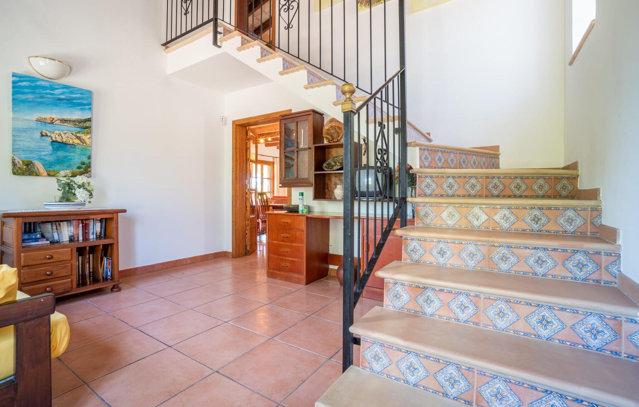 Et sandt haveparadis kan opleves under en ferie i denne alsidige bondegård på Mallorca, som passer malerisk ind i de smukke omgivelser vest for Artà. Fantastiske middelhavstræer og -buske præger det parklignende område, der strækker sig over flere niveauer og byder på en række retreater, nicher og områder til at slappe af. Her, under tag eller direkte i det fri, kan I slappe af i lounger eller på liggestole, sidde ved små borde og nyde en særlig form for privatliv, da I kan sprede jer og bogstaveligt talt gå jeres egen vej. Små trin, stier og mure løber gennem det frodige terræn og deler det op i forskellige områder. En af dem er den 10 meter lange pool med en omgivende solterrasse, bruser, harmonisk arrangerede planter og et overdækket område. Fra terrassen direkte ved huset, hvor man er lidt forhøjet, har man en særlig smuk udsigt; Heroppe er også det store udekøkken med grill til aftengrillning. Husets indretning byder sine gæster velkommen i en hyggelig, sommerlig og farverig blanding af stilarter. Masser af træ, terracotta fliser, synlige bjælker og farverige accenter præger husets flair, som helt sikkert kan følge med udearealet med hensyn til rummelighed. I stueetagen er der en stue-spisestue med pejs, et separat køkken (selvfølgelig fuldt udstyret), som er tilgængeligt udefra, samt et soveværelse med dobbeltseng og et badeværelse. Gangen, hvor trappen på øverste etage er placeret, er også så rummelig, at der er plads til endnu en sofa, hvor I også her kan hygge jer og nyde stuestemningen. Ovenpå er der et stort soveværelse med aircondition til to personer med en-suite badeværelse. Stuehuset "Sa Carbona Nou" byder på 17.500 m² jord, som er beliggende på landet ved porten til den charmerende lille by Artà. Cala Ratjada med sin smukke strand og havnepromenade ligger omkring et kvarters kørsel væk, Colonia de Sant Pere er kun 10 minutter væk. Indbydende strande som Canyamel-stranden eller Platja de Colonia de Sant Pere ligger 11 til 12 km derfra.