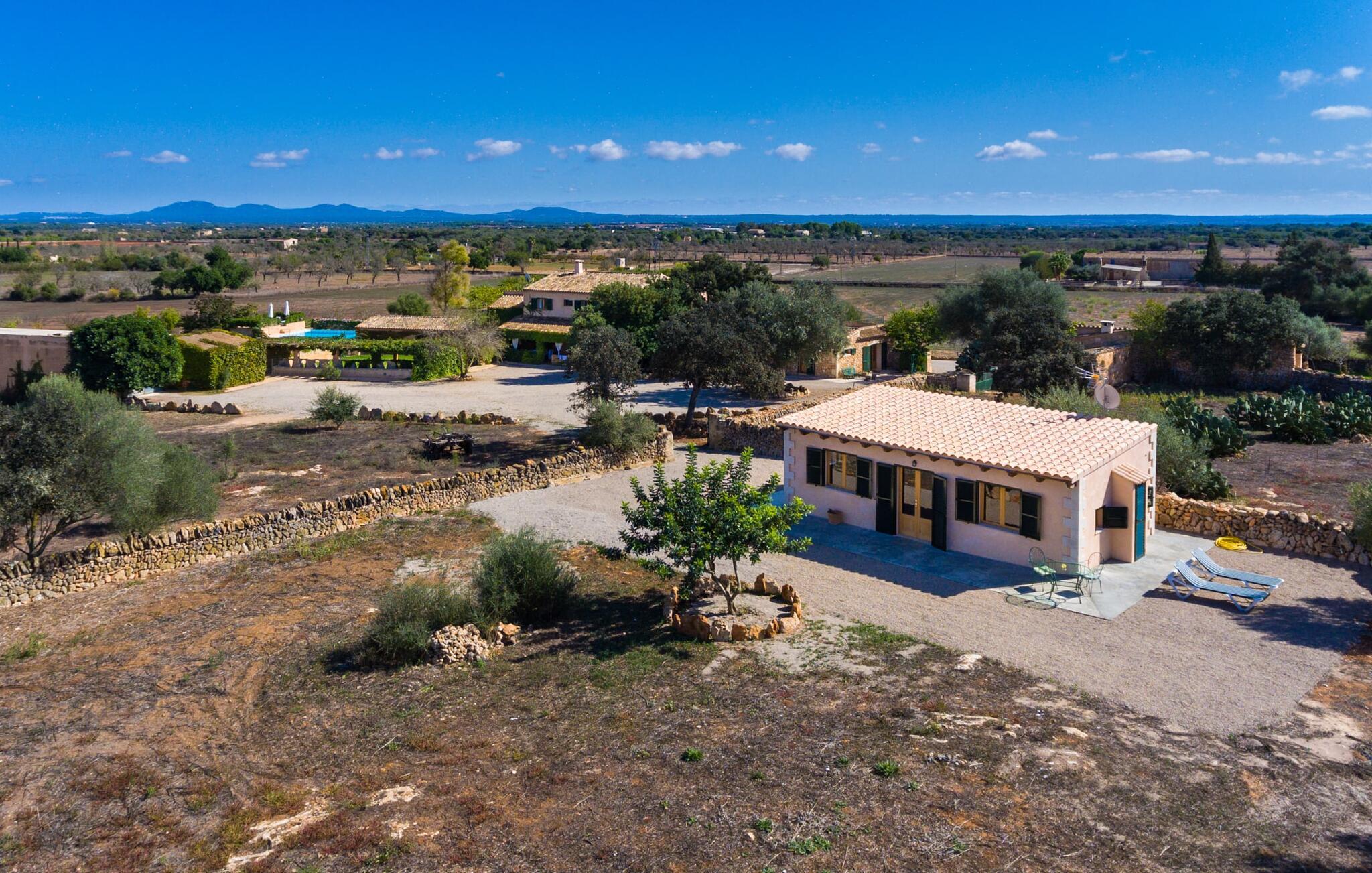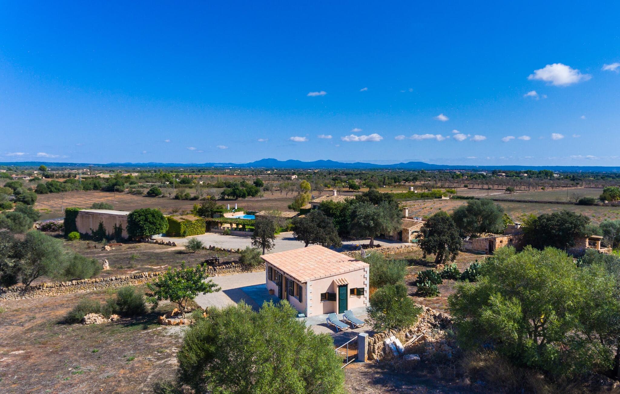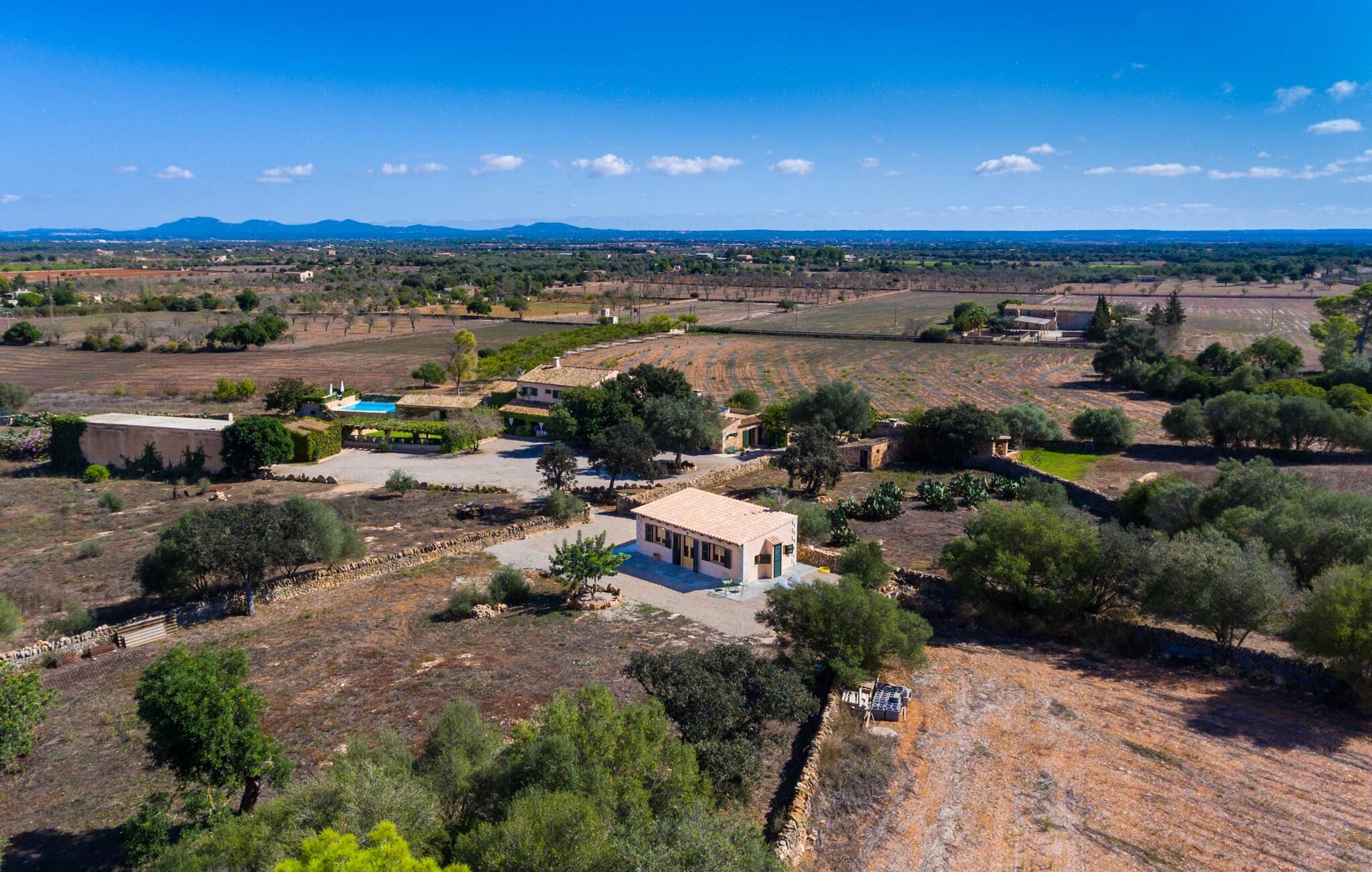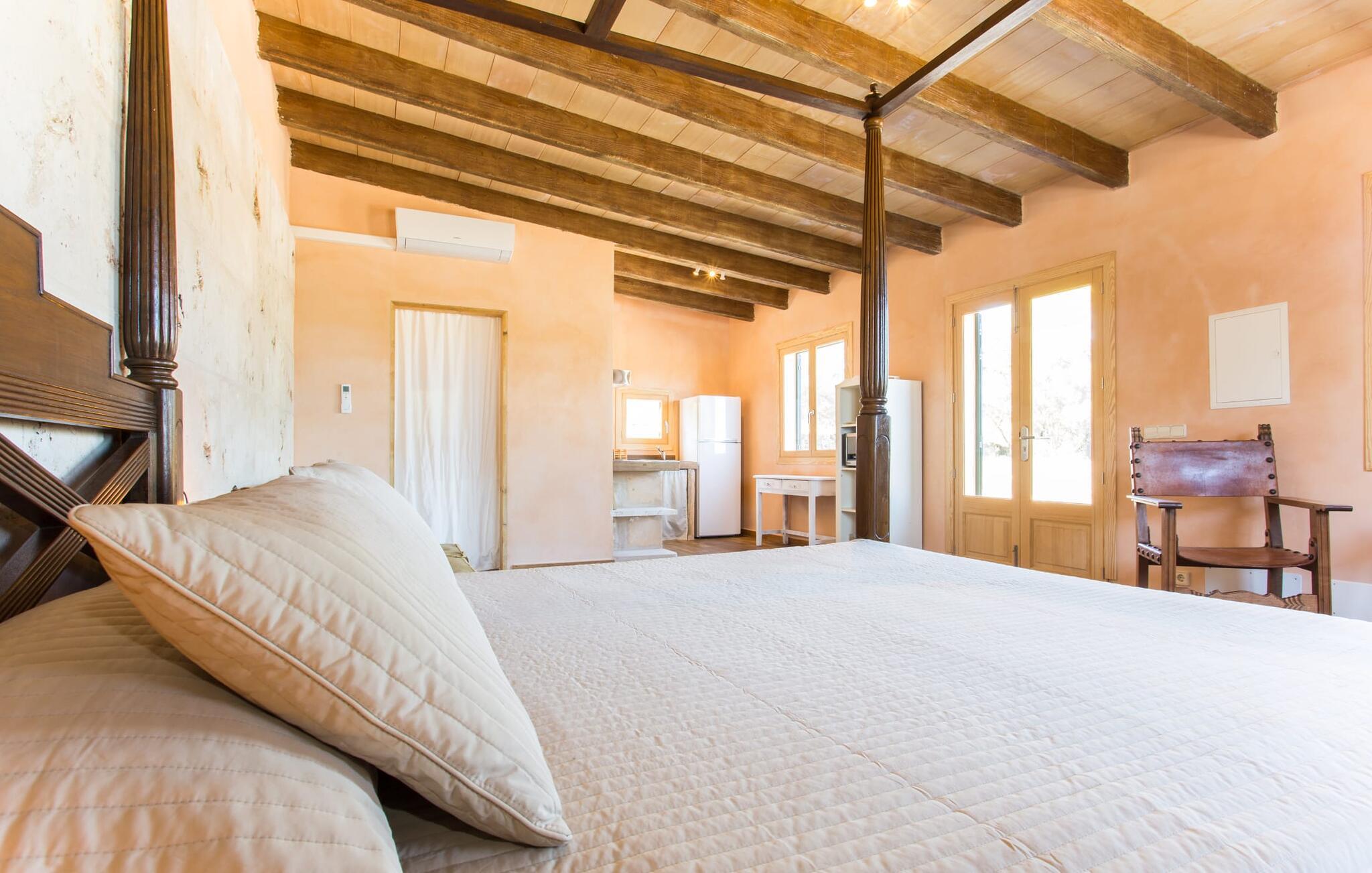 "Sa Cova Ibiza" er et charmerende feriehus i en 100 år gammel villa, smukt renoveret for at respektere traditionen og de landlige omgivelser. Beliggende i idyllisk natur har ejendommen sin egen frugthave og venlige høns, der går frit omkring. Den fælles pool er tilgængelig for gæster på naboejendommene "Sa Cova Cabrea", "Sa Cova Mallorca", "Sa Cova Formentera" og "Sa Cova Tagomago" og giver mulighed for at møde andre feriegæster. Om aftenen er udekøkkenet meget praktisk til at tilberede en lækker grill. Feriehusets rustikke charme er tydelig i naturstensvægge, træbjælker og bløde jordfarver, mens lyset skinner ind gennem de mange vinduespartier. Det smarte soveværelse har en himmelseng og et hyggeligt opholdsområde med tv og sofa. Det tilhørende badeværelse har brusekabine i glas med naturskøn udsigt. Villaens fællesarealer danner de perfekte rammer for socialt samvær, men de rolige omgivelser sikrer, at I nemt kan nyde dette perfekte tilflugtssted. Et smukt lille stykke grønt i en rolig beliggenhed beskriver dette feriehus perfekt. Byen Campos ligger kun 8,7 km væk, og der vil I finde mange butikker til jeres daglige behov. Et ugentligt marked finder sted hver torsdag og lørdag. På cirka 20 minutter i bil kan I nå fantastiske sandstrande som Platja de Sa Rapita og Ses Covetes. Det utrolige hvide sand i Es Trenc er kun omkring 21 km væk, stranden er sat på baggrund af fyrretræer og bølgende klitter og er velegnet til børn takket være dens blide hældning i vandet.