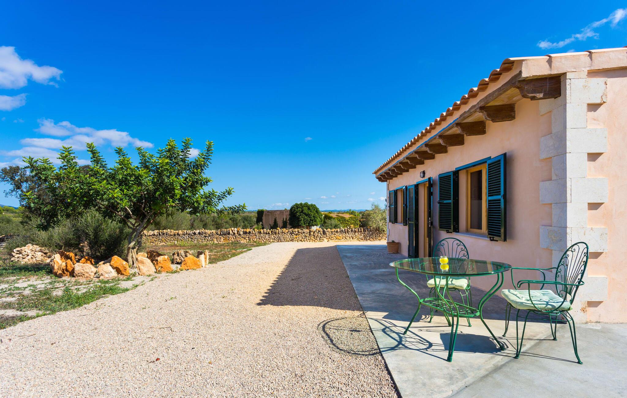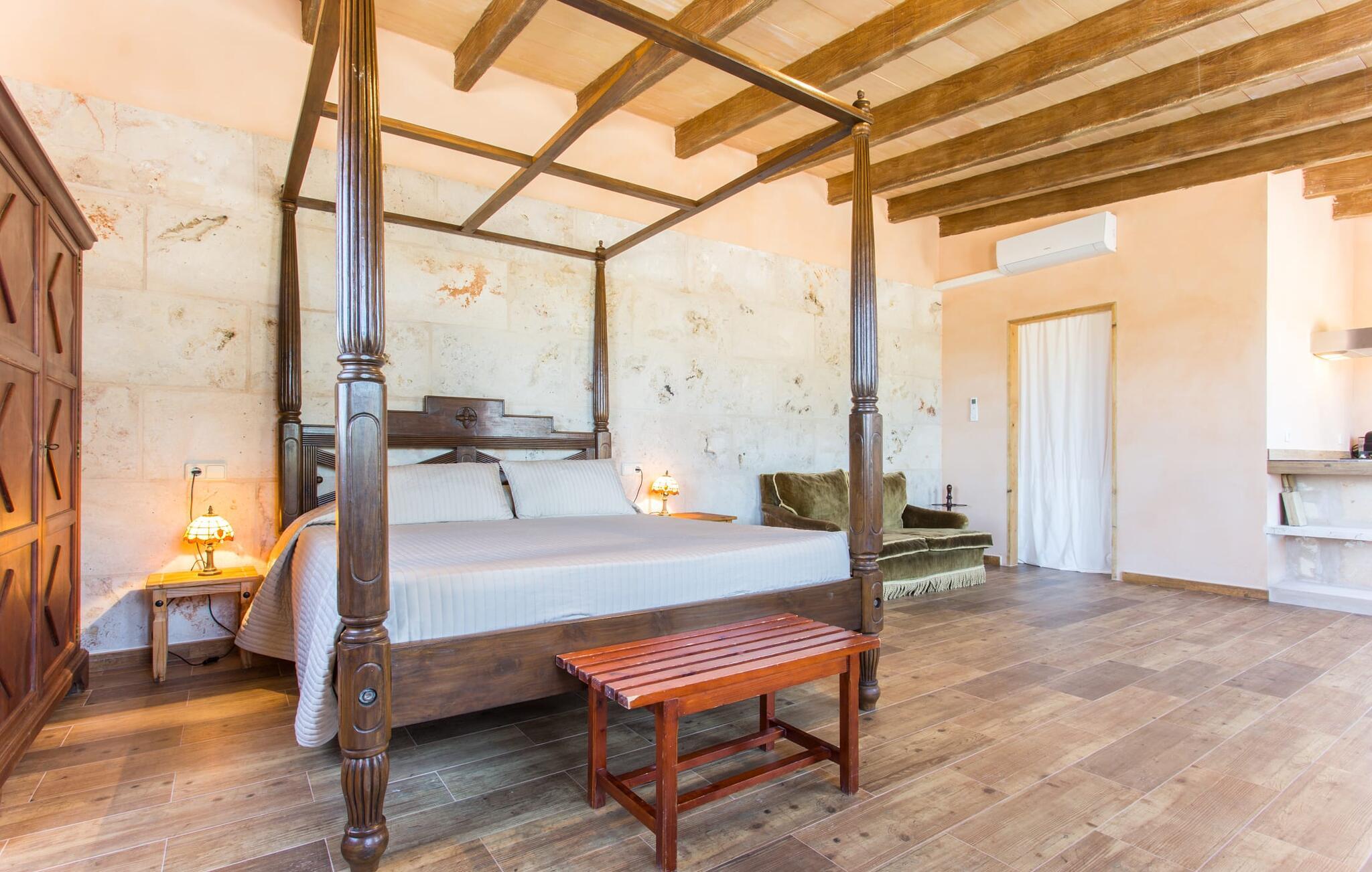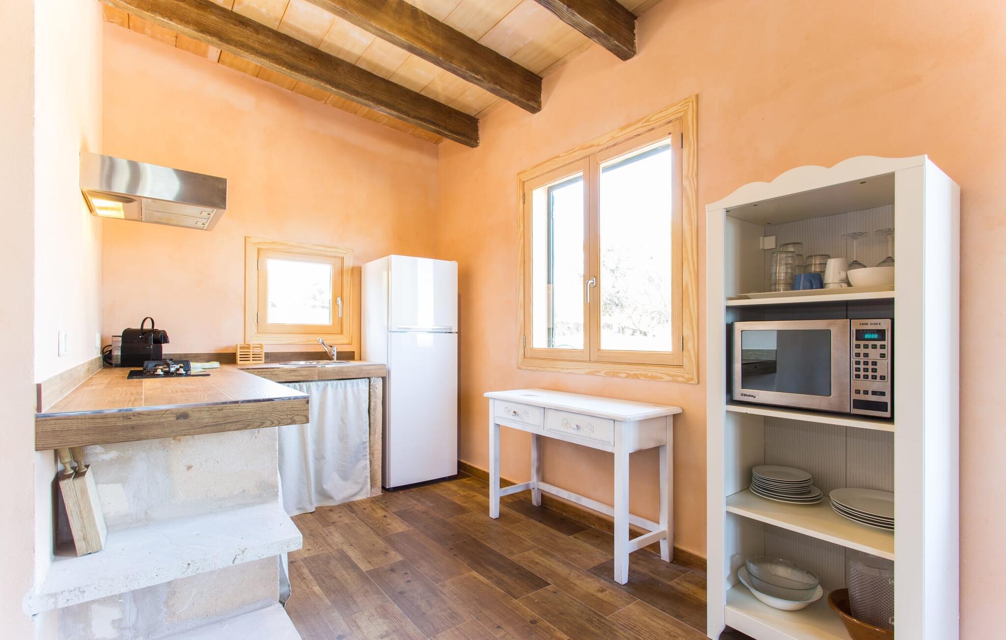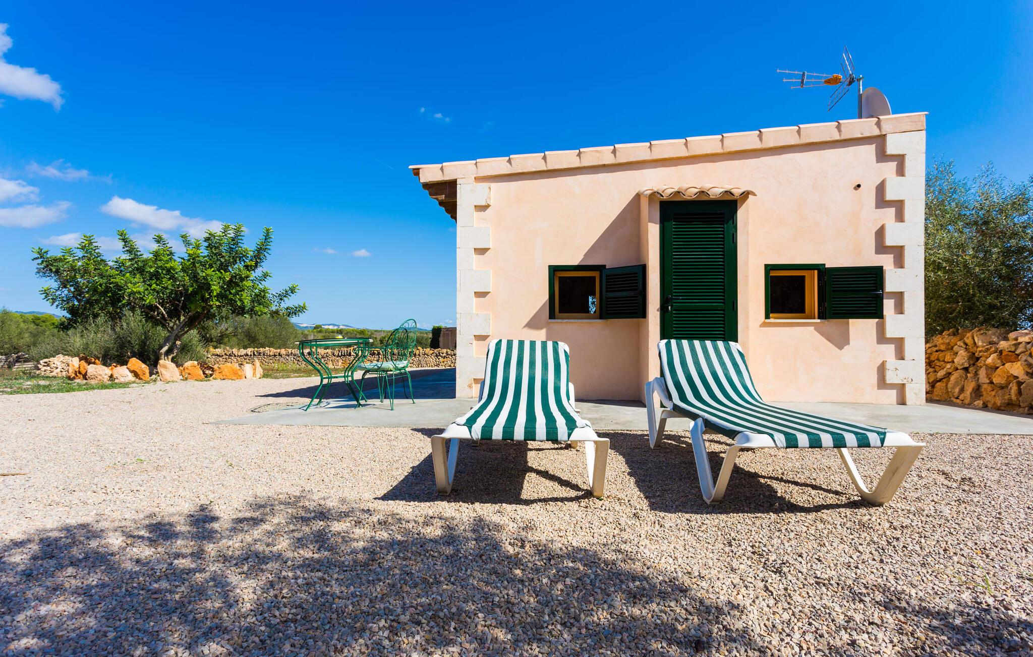 "Sa Cova Ibiza" er et charmerende feriehus i en 100 år gammel villa, smukt renoveret for at respektere traditionen og de landlige omgivelser. Beliggende i idyllisk natur har ejendommen sin egen frugthave og venlige høns, der går frit omkring. Den fælles pool er tilgængelig for gæster på naboejendommene "Sa Cova Cabrea", "Sa Cova Mallorca", "Sa Cova Formentera" og "Sa Cova Tagomago" og giver mulighed for at møde andre feriegæster. Om aftenen er udekøkkenet meget praktisk til at tilberede en lækker grill. Feriehusets rustikke charme er tydelig i naturstensvægge, træbjælker og bløde jordfarver, mens lyset skinner ind gennem de mange vinduespartier. Det smarte soveværelse har en himmelseng og et hyggeligt opholdsområde med tv og sofa. Det tilhørende badeværelse har brusekabine i glas med naturskøn udsigt. Villaens fællesarealer danner de perfekte rammer for socialt samvær, men de rolige omgivelser sikrer, at I nemt kan nyde dette perfekte tilflugtssted. Et smukt lille stykke grønt i en rolig beliggenhed beskriver dette feriehus perfekt. Byen Campos ligger kun 8,7 km væk, og der vil I finde mange butikker til jeres daglige behov. Et ugentligt marked finder sted hver torsdag og lørdag. På cirka 20 minutter i bil kan I nå fantastiske sandstrande som Platja de Sa Rapita og Ses Covetes. Det utrolige hvide sand i Es Trenc er kun omkring 21 km væk, stranden er sat på baggrund af fyrretræer og bølgende klitter og er velegnet til børn takket være dens blide hældning i vandet.