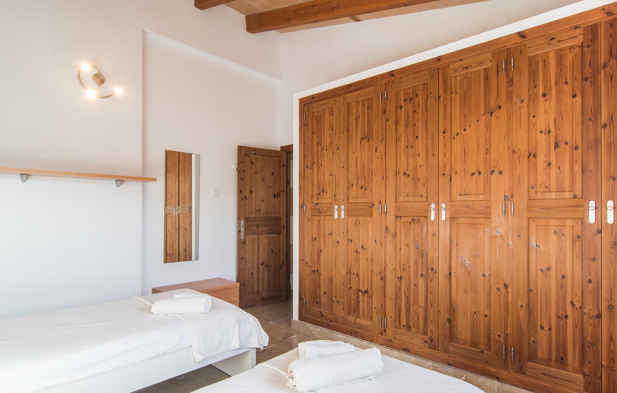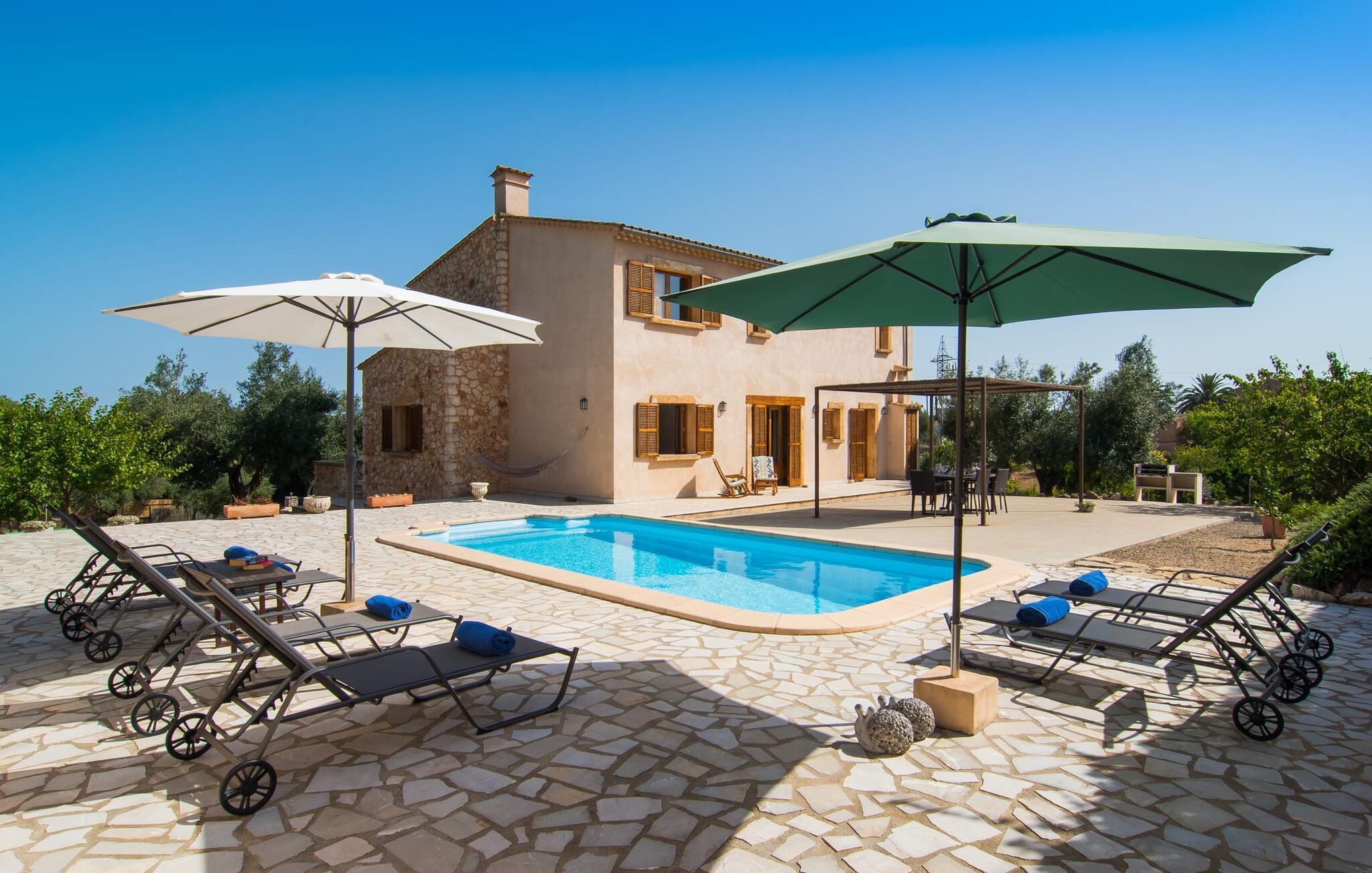 Denne rustikke, nye villa "Sa Finqueta" er beliggende i et boligområde ved porten til Manacor. Dens beliggenhed på Puig des Son Talent betyder, at du nyder godt af den omfattende udsigt over lavlandet omkring Manacor. Udendørsområdet er blevet asfalteret for at skabe et behageligt sted at parkere en lejebil. Den runde pool er placeret i det rummelige terrasseområde, omgivet af en solterrasse. Der er god plads til behagelige liggestole og en parasol, hvis det kræves. Der er en canvas baldakin og markise på siden af huset, der giver skygge til et loungeområde med trendy polyrattan stole. Der er også en spiseplads med metal- og træmøbler - et ideelt sted at nyde en grill, mens du nyder den milde eftermiddagssol fra Middelhavet. Du kan nyde freden og roen eller din morgenkaffe på de to gyngestole i antikt look. Foran huset er der en anden overdækket terrasse, hvor du kan nyde solen om morgenen og køligere skygge om eftermiddagen. Da der også er et spisebord her, er dette det bedste sted at starte dagen med en solid morgenmad, mens du har udsigt over de bølgende bakker i det bølgende landskab. Særligt praktisk: Gæsterne kan benytte den dobbelte garage, som er direkte tilgængelig via trapper inde fra huset. Dette er et Fincallorca feriehus. Man kommer ind i huset gennem et stort indgangsparti, der strækker sig i hele husets bredde. Spisestuen er i dette åbne område. Trædøre og vinduer, marmorgulve, fritlagte træbjælker, store sandstenskurvebuer og fritlagte stenbrudsvægge, dygtigt placeret i individuelle rum og områder, bidrager til den rustikke charme i denne lyse og indbydende villa. I stueetagen finder du endnu en lounge med et arbejdsværelse og en sovesofa. Det vidunderligt udstyrede køkken fører ud til den forreste terrasse med spiseplads. Det indbyggede køkken i landlig stil af mørkt træ fremstår særligt flot, i kontrast til det moderne, skinnende rustfri stål i det store køleskab med fryserum og komfur samt den integrerede mikroovn. Det rummelige køkken har en køkkenø i amerikansk stil med taburetter. Der er et gæstetoilet ved siden af køkken og vaskerum - praktisk til et hurtigt besøg, når du slapper af udenfor. Trappen i foyeren fører til øverste etage med private soveværelser og badeværelser. Tre meget komfortabelt indrettede værelser - to dobbeltværelser og et børneværelse med to enkeltsenge - byder på masser af plads til en familie eller en gruppe venner. En barneseng er også tilgængelig til et lille barn. Der er to badeværelser - det ene med badekar og muntre gule klinker, det andet med moderne indretning og bruseniche. Den bekvemme beliggenhed midt på øen tilbyder feriegæster adskillige fritidsmuligheder. På grund af dens nærhed til Manacor og mange veje, er alle kystbyer inden for nem køreafstand, inklusive Capdepera og den livlige Cala Ratjada mod nord og den smukke lille havneby Porto Cristo mod syd. Der er et stort udvalg af naturlige attraktioner, såsom "Coves des Dracs", dragehulerne, der er berømte for deres drypsten, eller østkystens smukke strande, den såkaldte "Calas de Mallorca", med vidunderlige naturlige strande som f.eks. som Cala Varques. Hvis du leder efter en forandring, kan du altid vælge en mere urban oplevelse ved at tage til Manacor og nyde butikkerne og restauranterne der, eller tage til det livlige Cala Ratjada for at få lidt natteliv. Efter en lang dag er det simpelthen vidunderligt at vende tilbage til denne autentiske mallorcanske villa "Sa Finqueta". Vi, Fincallorca-teamet, ønsker dig en dejlig, afslappende ferie til en fantastisk pris. Denne rustikke "som ny" villa "Sa Finqueta" ligger i bakkerne og tilbyder en vidunderlig udsigt over Manacor-sletten, "Plà de Mallorca". Takket være den tætte nærhed til Manacor er det nemt at gøre dine daglige indkøb eller besøge det smukke marked om mandagen. Smukke strande såsom Cala Varques er nemme at nå med lejebil. Gå en tur langs havnen og promenaden i Porto Cristo og andre kystbyer såsom Cala Ratjada.