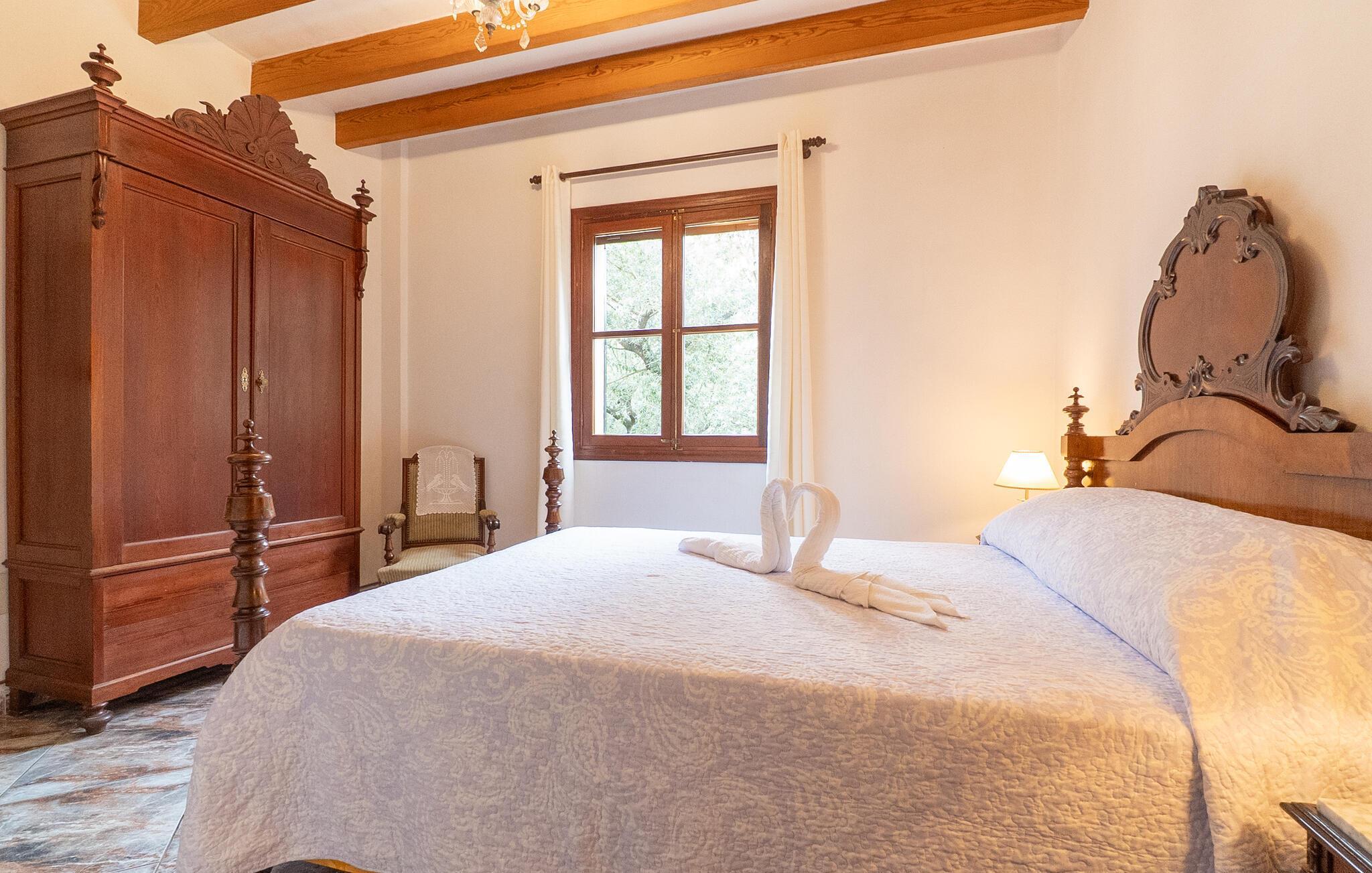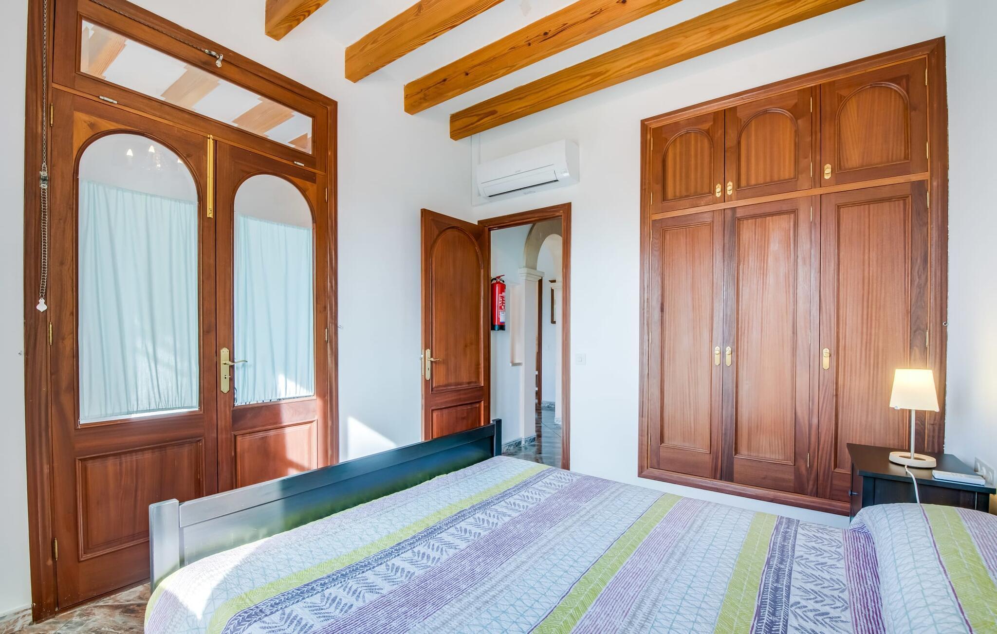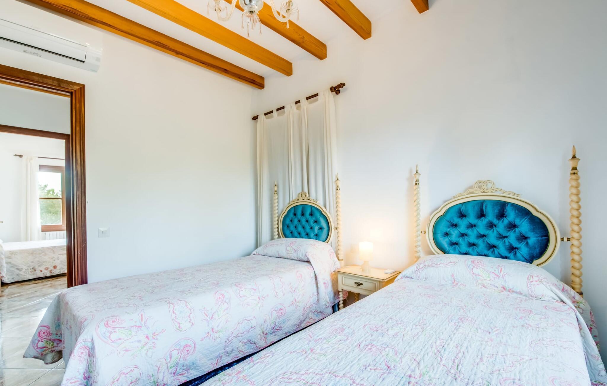 Flankeret af høje palmer er dette bondehus en absolut perle med et helt særligt udeområde. Ikke alene er der masser af plads til at hvile og slappe af. En særlig stemning skabes af den smukke græsplæne og de gamle stenge, som emmer af meget naturlighed og hygge. En omhyggeligt designet terrasse og poolområde fuldender billedet effektivt, og her har du valget mellem indbydende åbne og overdækkede områder på forskellige niveauer: enten sammen ved langbordet ved det smukke udsigtsområde direkte ved huset, på en af de komfortable liggestole ved siden af. til det, uanset om det er ved poolen eller på balkonen - hvert sted har sin egen specielle charme. Poolen med dets dekorative bugtende mønster og romerske trin lover en vidunderlig måde at køle af på. Om aftenen bør du helt sikkert udnytte den skønne atmosfære til at sidde udenfor og måske nyde et par lækkerier fra grillen i en venlig atmosfære. Dette er et Fincallorca feriehus. Dette feriehus på Mallorca har også meget at byde på, når det kommer til velholdt interiør. På grund af det eksisterende klimaanlæg og varme er dette også muligt året rundt under absolut komfortable forhold. Takket være det rummelige opholdsrum kan du nyde en masse privatliv, selv når du er fuldt optaget. De smarte gulvfliser udstråler en elegant flair, som harmonisk komplementeres af de klassiske mallorcanske møbler. Dekorative stoffer og belysning komplementerer den værdige atmosfære. En kombineret stue og spisestue åbner ud til entreen med en bred bue. Herfra kommer I til det fuldt udstyrede køkken, der bekvemt er udstyret med en ekstra spiseplads og udgang til terrassen samt dør til stue-alrum. Et soveværelse med dobbeltseng og et badeværelse er også i stueetagen, yderligere fire soveværelser til to gæster hver og to badeværelser er på husets øverste etage. De smukke synlige bjælker i kombination med træmøbler skaber en hyggelig atmosfære i alle afslapningsrum. Bondegård "Sa Font d'Alt" - et højkvalitetshus med attraktive detaljer i en fantastisk beliggenhed! Stuehuset "Sa Font d'Alt" har en særdeles attraktiv beliggenhed nær den maleriske by Artà i den østlige del af Mallorca. Det er beliggende på en parklignende ejendom på næsten 6.000 m² med en fantastisk bestand af gamle træer. På grund af sin beliggenhed tæt på den akustisk mærkbare vej kan man fra stuehuset hurtigt og nemt komme til forskellige smukke udflugtsmål i omegnen. De nærmeste strande ligger 10 til 12 km væk. Bemærk venligst, at denne ejendom ikke accepterer ungdomsgrupper eller polterabender. En ungdomsgruppe på denne ejendom består af personer på 35 år eller derunder. Book ikke denne ejendom, hvis du er en ungdomsgruppe eller polterabend, da din reservation vil blive afvist, når den er booket, hvilket også kan være tilfældet ved ankomst til ejendommen eller under dit ophold, og du vil ikke modtage en refusion