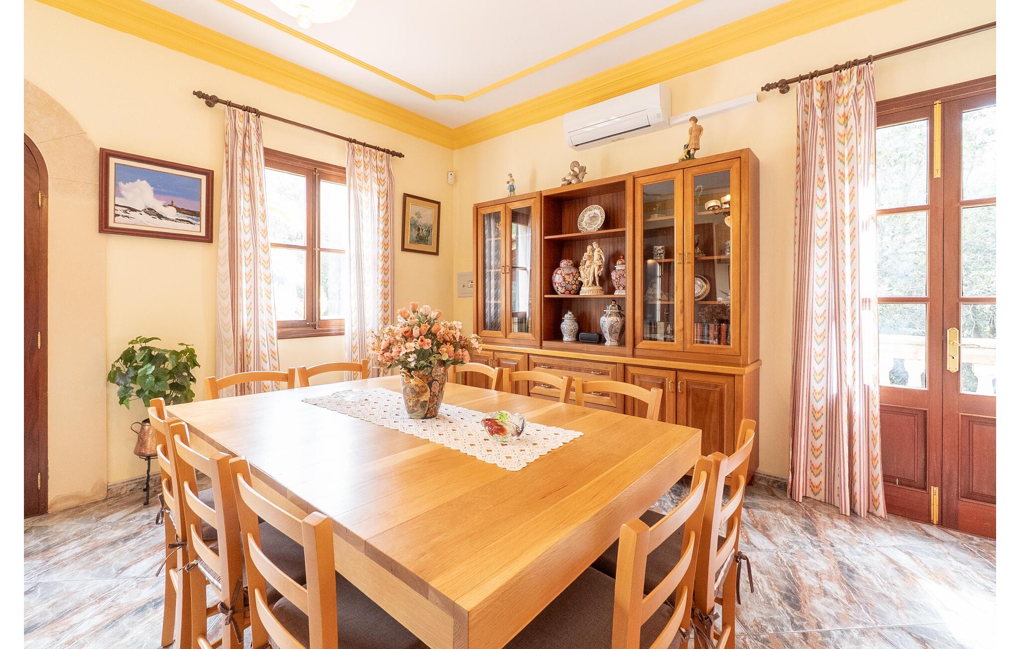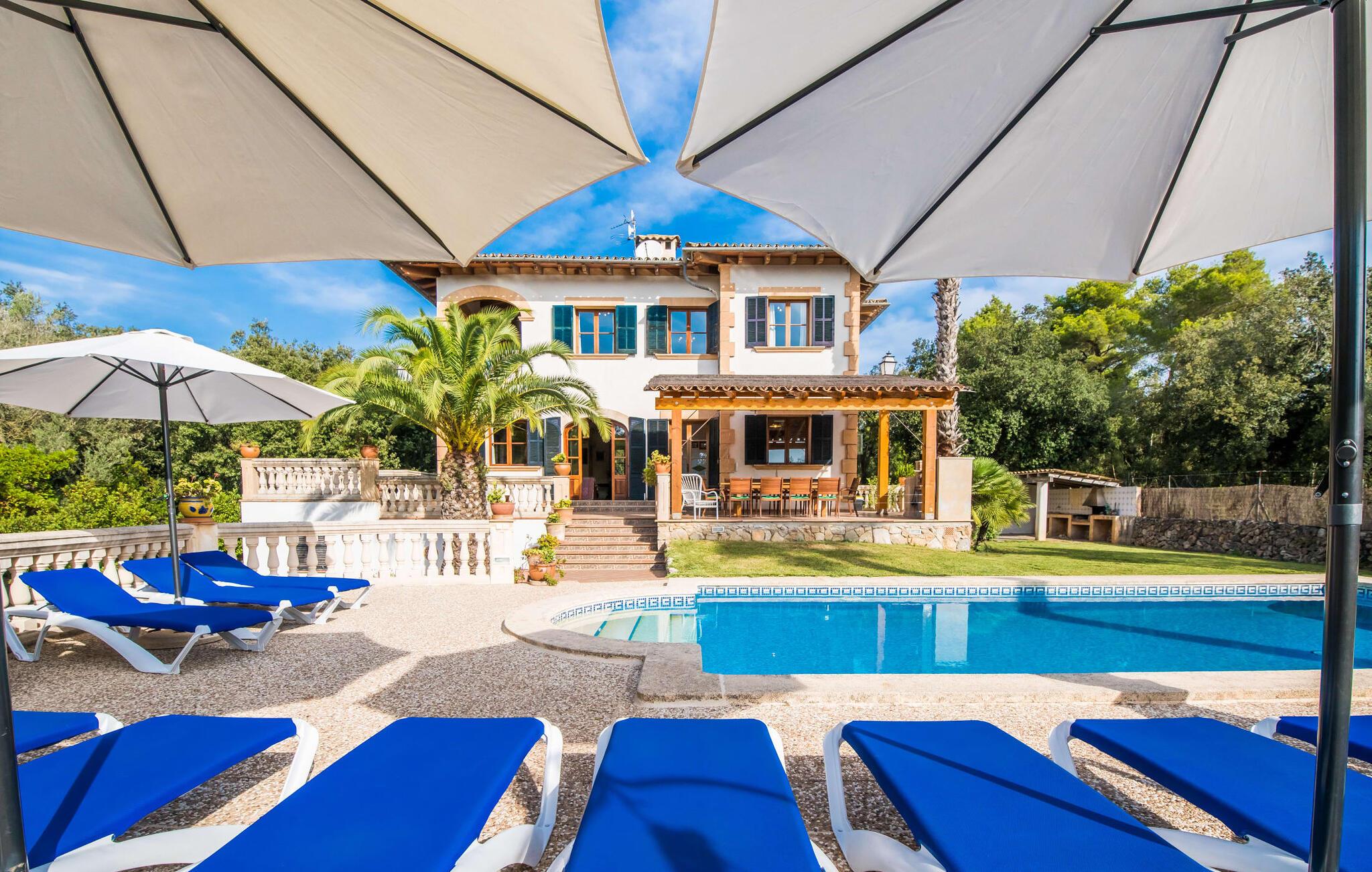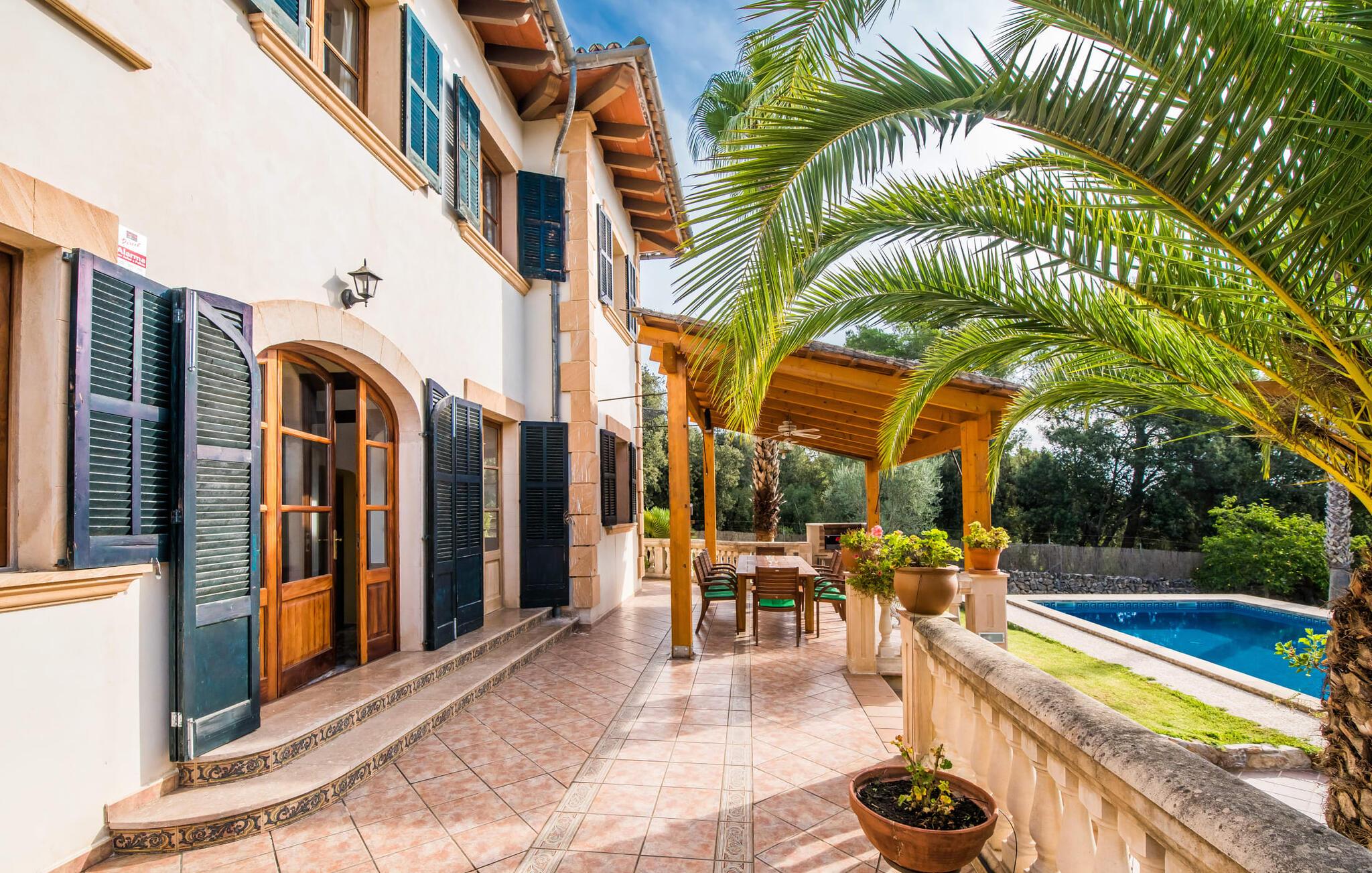Flankeret af høje palmer er dette bondehus en absolut perle med et helt særligt udeområde. Ikke alene er der masser af plads til at hvile og slappe af. En særlig stemning skabes af den smukke græsplæne og de gamle stenge, som emmer af meget naturlighed og hygge. En omhyggeligt designet terrasse og poolområde fuldender billedet effektivt, og her har I valget mellem indbydende åbne og overdækkede områder på forskellige niveauer: enten sammen ved langbordet ved det smukke udsigtsområde direkte ved huset, på en af de komfortable liggestole ved siden af. til det, uanset om det er ved poolen eller på balkonen - hvert sted har sin egen specielle charme. Poolen med dets dekorative bugtende mønster og romerske trin lover en vidunderlig måde at køle af på. Om aftenen bør I helt sikkert udnytte den skønne atmosfære til at sidde udenfor og måske nyde et par lækkerier fra grillen i en venlig atmosfære. Dette feriehus på Mallorca har også meget at byde på, når det kommer til velholdt interiør. På grund af det eksisterende klimaanlæg og varme er dette også muligt året rundt under absolut komfortable forhold. Takket være det rummelige opholdsrum kan I nyde en masse privatliv, selv når I er fuldt optaget. De smarte gulvfliser udstråler en elegant flair, som harmonisk komplementeres af de klassiske mallorcanske møbler. Dekorative stoffer og belysning komplementerer den værdige atmosfære. En kombineret stue og spisestue åbner ud til entreen med en bred bue. Herfra kommer I til det fuldt udstyrede køkken, der bekvemt er udstyret med en ekstra spiseplads og udgang til terrassen samt dør til stue-alrum. Et soveværelse med dobbeltseng og et badeværelse er også i stueetagen, yderligere fire soveværelser til to gæster hver og to badeværelser er på husets øverste etage. De smukke synlige bjælker i kombination med træmøbler skaber en hyggelig atmosfære i alle afslapningsrum. Bondegård "Sa Font d'Alt" - et højkvalitetshus med attraktive detaljer i en fantastisk beliggenhed! Stuehuset "Sa Font d'Alt" har en særdeles attraktiv beliggenhed nær den maleriske by Artà i den østlige del af Mallorca. Det er beliggende på en parklignende ejendom på næsten 6.000 m² med en fantastisk bestand af gamle træer. På grund af sin beliggenhed tæt på den akustisk mærkbare vej kan man fra stuehuset hurtigt og nemt komme til forskellige smukke udflugtsmål i omegnen. De nærmeste strande ligger 10 til 12 km væk. Bemærk venligst, at denne ejendom ikke accepterer ungdomsgrupper eller polterabender. En ungdomsgruppe på denne ejendom består af personer på 35 år eller derunder. Book ikke denne ejendom, hvis I er en ungdomsgruppe eller polterabend, da jeres reservation vil blive afvist, når den er booket, hvilket også kan være tilfældet ved ankomst til ejendommen eller under jeres ophold, og I vil ikke modtage en refusion