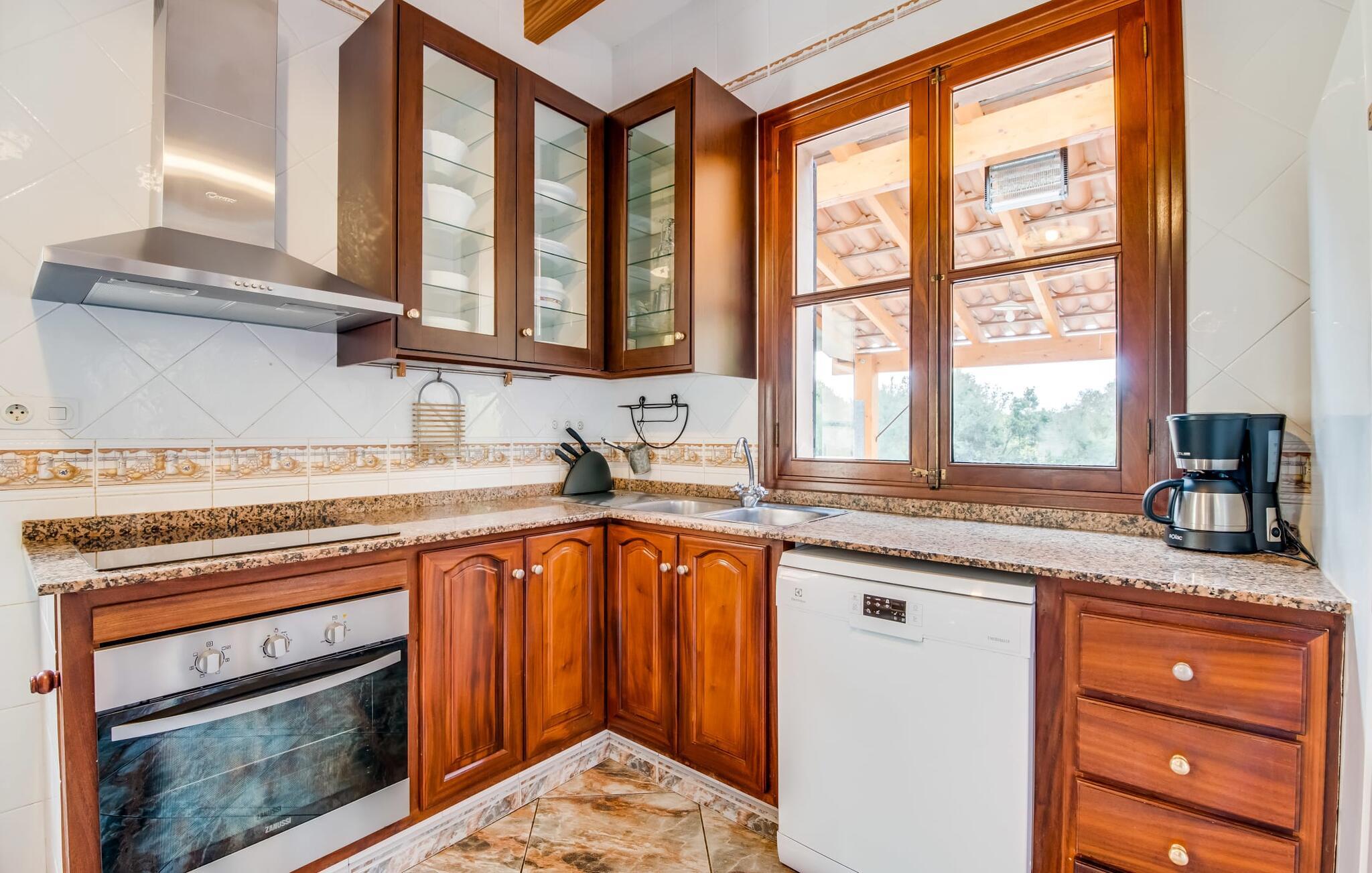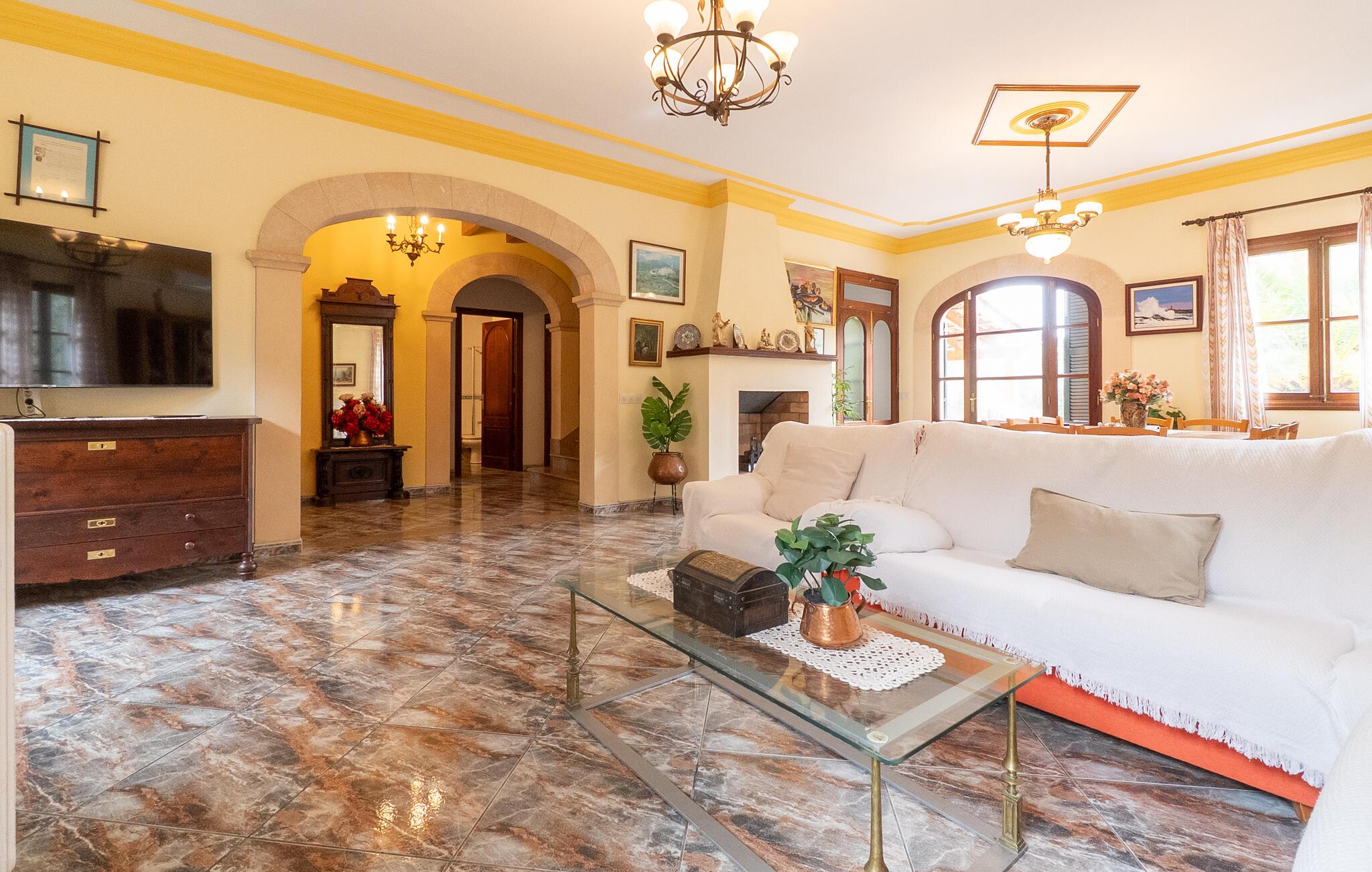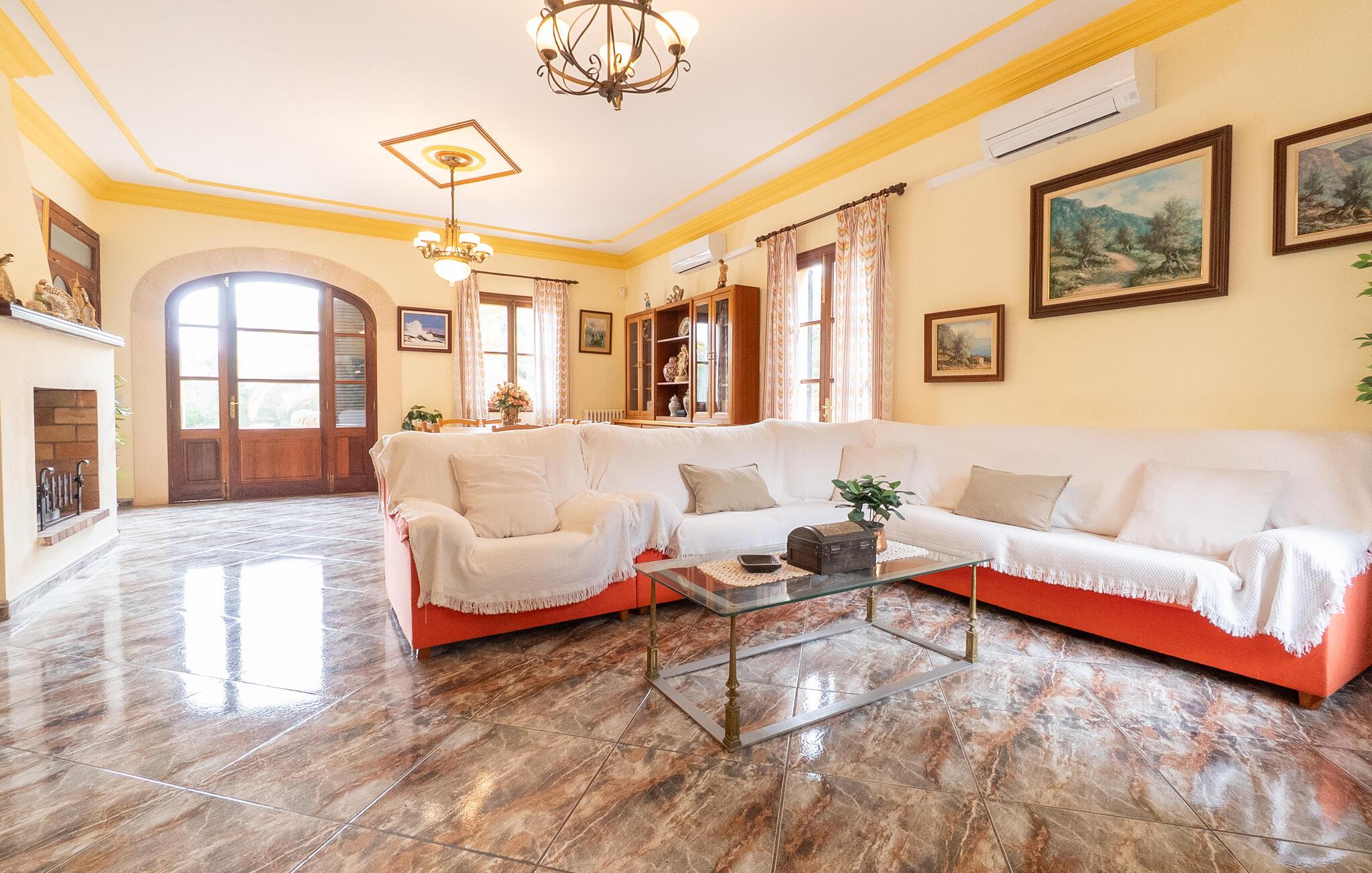 Flankeret af høje palmer er dette bondehus en absolut perle med et helt særligt udeområde. Ikke alene er der masser af plads til at hvile og slappe af. En særlig stemning skabes af den smukke græsplæne og de gamle stenge, som emmer af meget naturlighed og hygge. En omhyggeligt designet terrasse og poolområde fuldender billedet effektivt, og her har I valget mellem indbydende åbne og overdækkede områder på forskellige niveauer: enten sammen ved langbordet ved det smukke udsigtsområde direkte ved huset, på en af de komfortable liggestole ved siden af. til det, uanset om det er ved poolen eller på balkonen - hvert sted har sin egen specielle charme. Poolen med dets dekorative bugtende mønster og romerske trin lover en vidunderlig måde at køle af på. Om aftenen bør I helt sikkert udnytte den skønne atmosfære til at sidde udenfor og måske nyde et par lækkerier fra grillen i en venlig atmosfære. Dette feriehus på Mallorca har også meget at byde på, når det kommer til velholdt interiør. På grund af det eksisterende klimaanlæg og varme er dette også muligt året rundt under absolut komfortable forhold. Takket være det rummelige opholdsrum kan I nyde en masse privatliv, selv når I er fuldt optaget. De smarte gulvfliser udstråler en elegant flair, som harmonisk komplementeres af de klassiske mallorcanske møbler. Dekorative stoffer og belysning komplementerer den værdige atmosfære. En kombineret stue og spisestue åbner ud til entreen med en bred bue. Herfra kommer I til det fuldt udstyrede køkken, der bekvemt er udstyret med en ekstra spiseplads og udgang til terrassen samt dør til stue-alrum. Et soveværelse med dobbeltseng og et badeværelse er også i stueetagen, yderligere fire soveværelser til to gæster hver og to badeværelser er på husets øverste etage. De smukke synlige bjælker i kombination med træmøbler skaber en hyggelig atmosfære i alle afslapningsrum. Bondegård "Sa Font d'Alt" - et højkvalitetshus med attraktive detaljer i en fantastisk beliggenhed! Stuehuset "Sa Font d'Alt" har en særdeles attraktiv beliggenhed nær den maleriske by Artà i den østlige del af Mallorca. Det er beliggende på en parklignende ejendom på næsten 6.000 m² med en fantastisk bestand af gamle træer. På grund af sin beliggenhed tæt på den akustisk mærkbare vej kan man fra stuehuset hurtigt og nemt komme til forskellige smukke udflugtsmål i omegnen. De nærmeste strande ligger 10 til 12 km væk. Bemærk venligst, at denne ejendom ikke accepterer ungdomsgrupper eller polterabender. En ungdomsgruppe på denne ejendom består af personer på 35 år eller derunder. Book ikke denne ejendom, hvis I er en ungdomsgruppe eller polterabend, da jeres reservation vil blive afvist, når den er booket, hvilket også kan være tilfældet ved ankomst til ejendommen eller under jeres ophold, og I vil ikke modtage en refusion